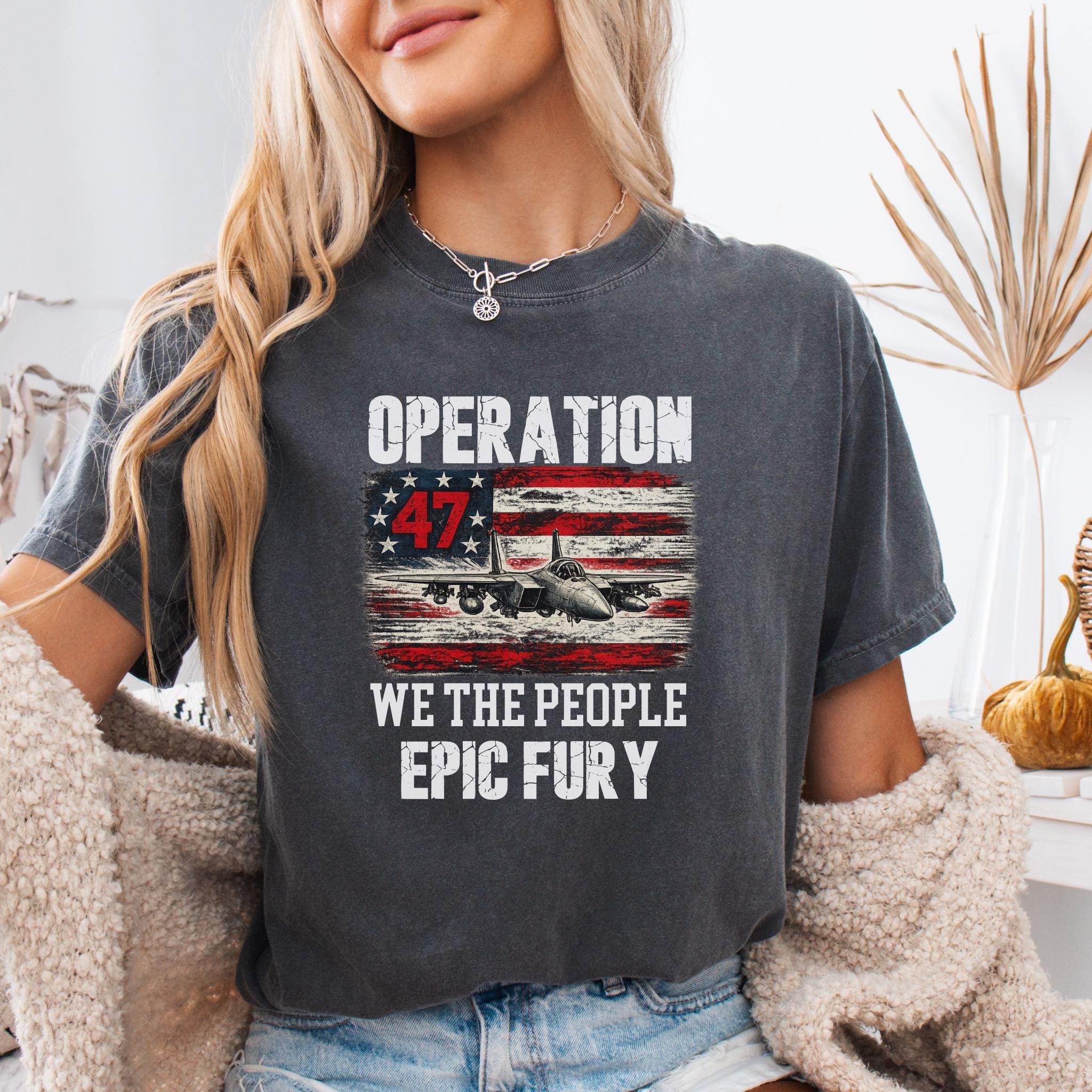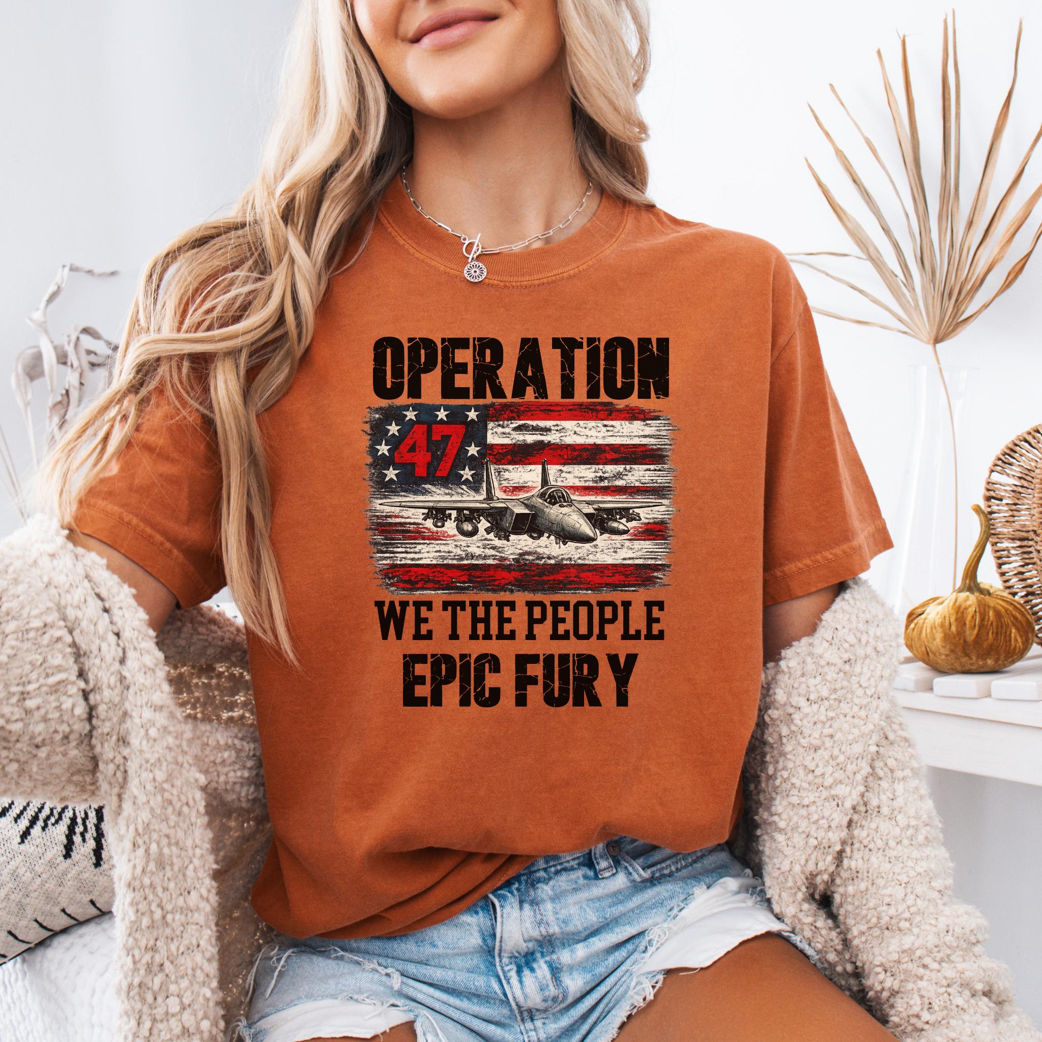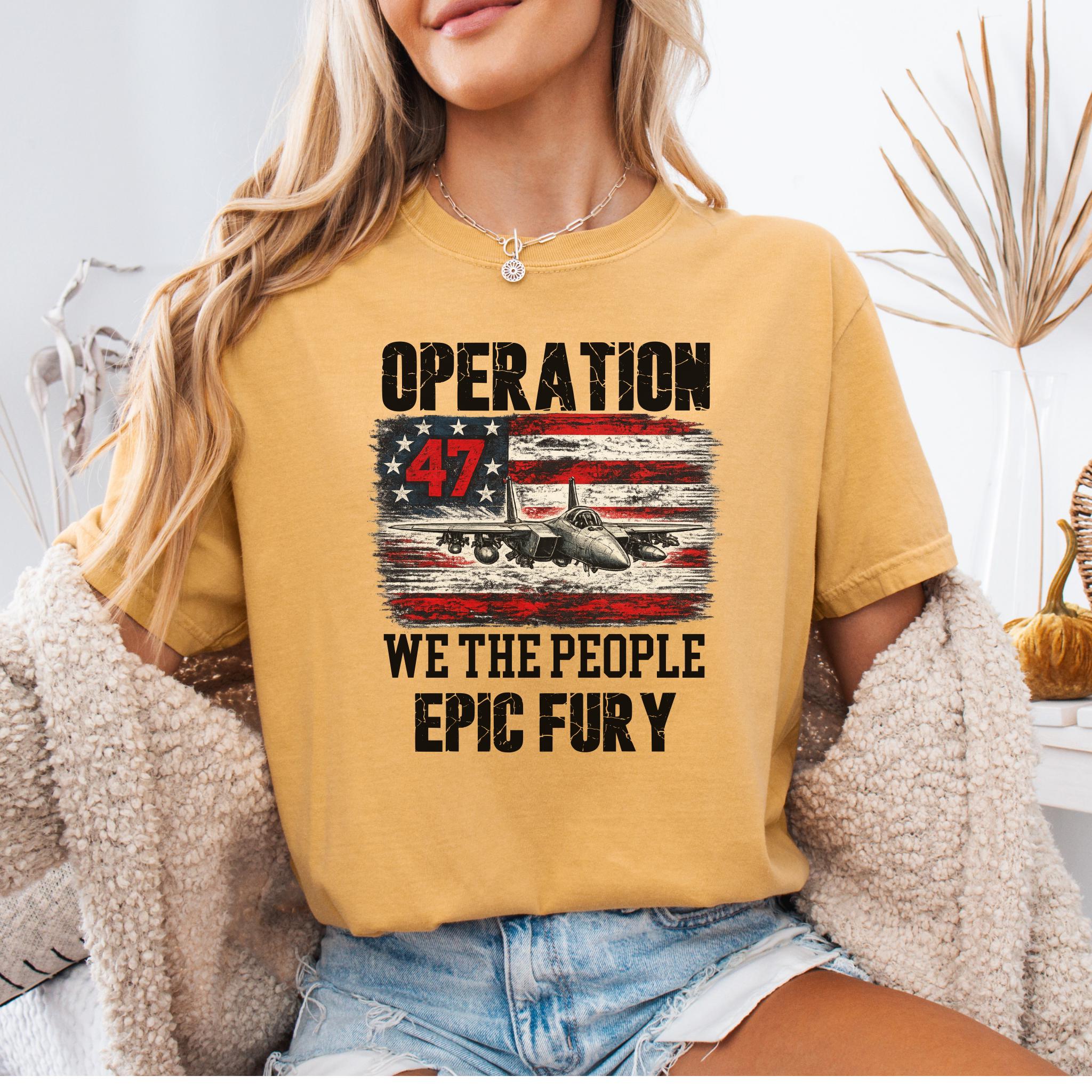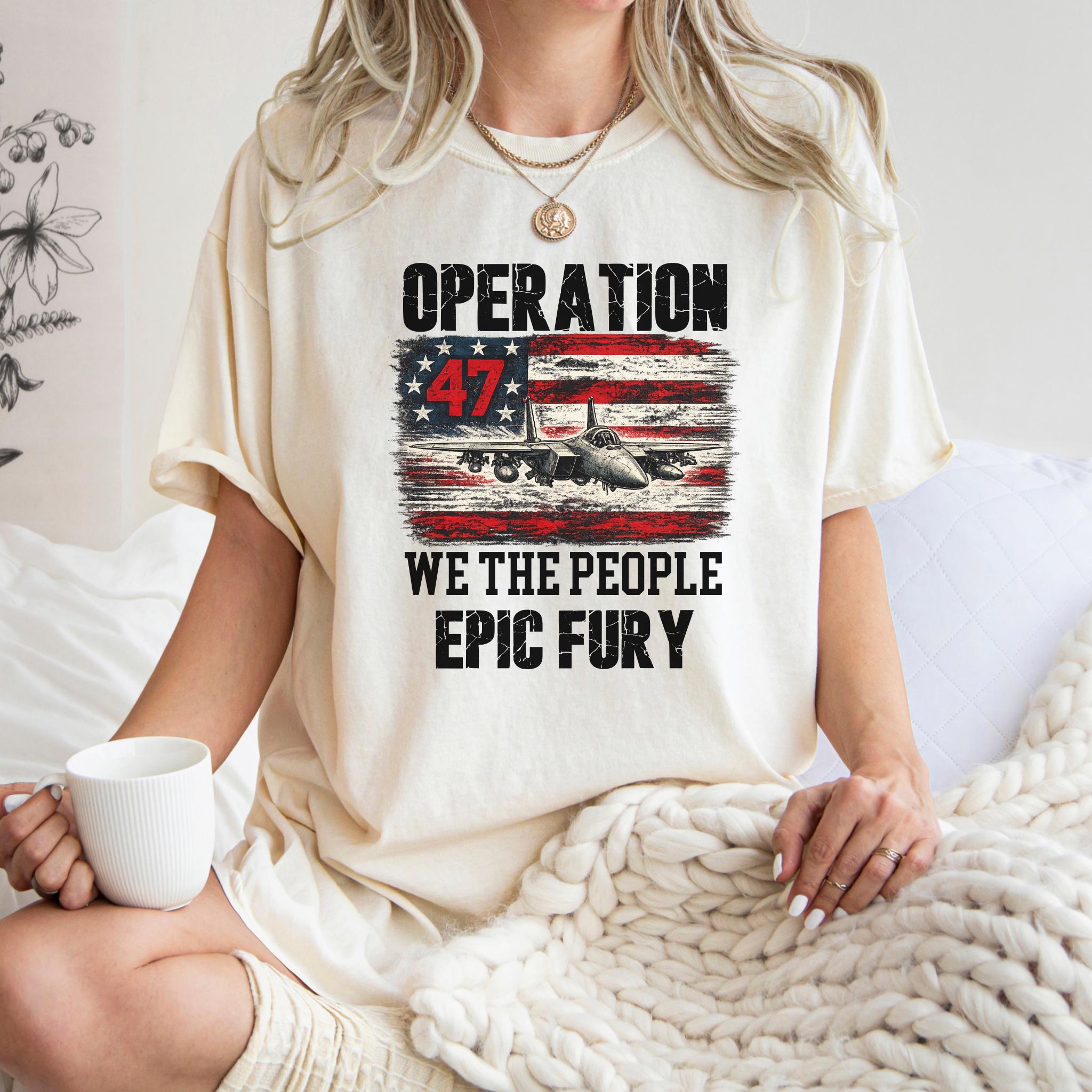 Make a bold patriotic statement with this Operation 47 graphic shirt featuring a fighter jet, distressed American flag artwork, and strong typography with We The People and Epic Fury text.