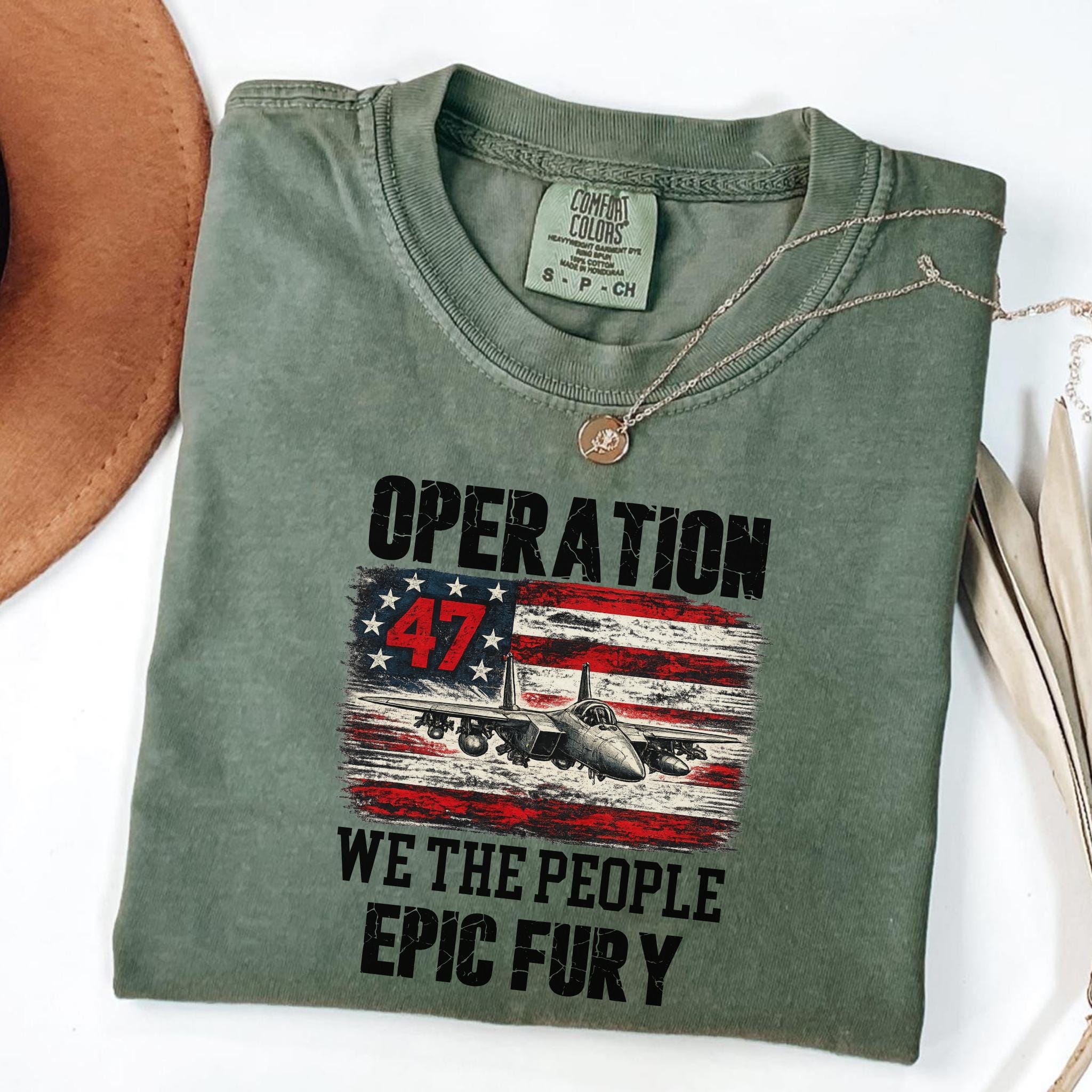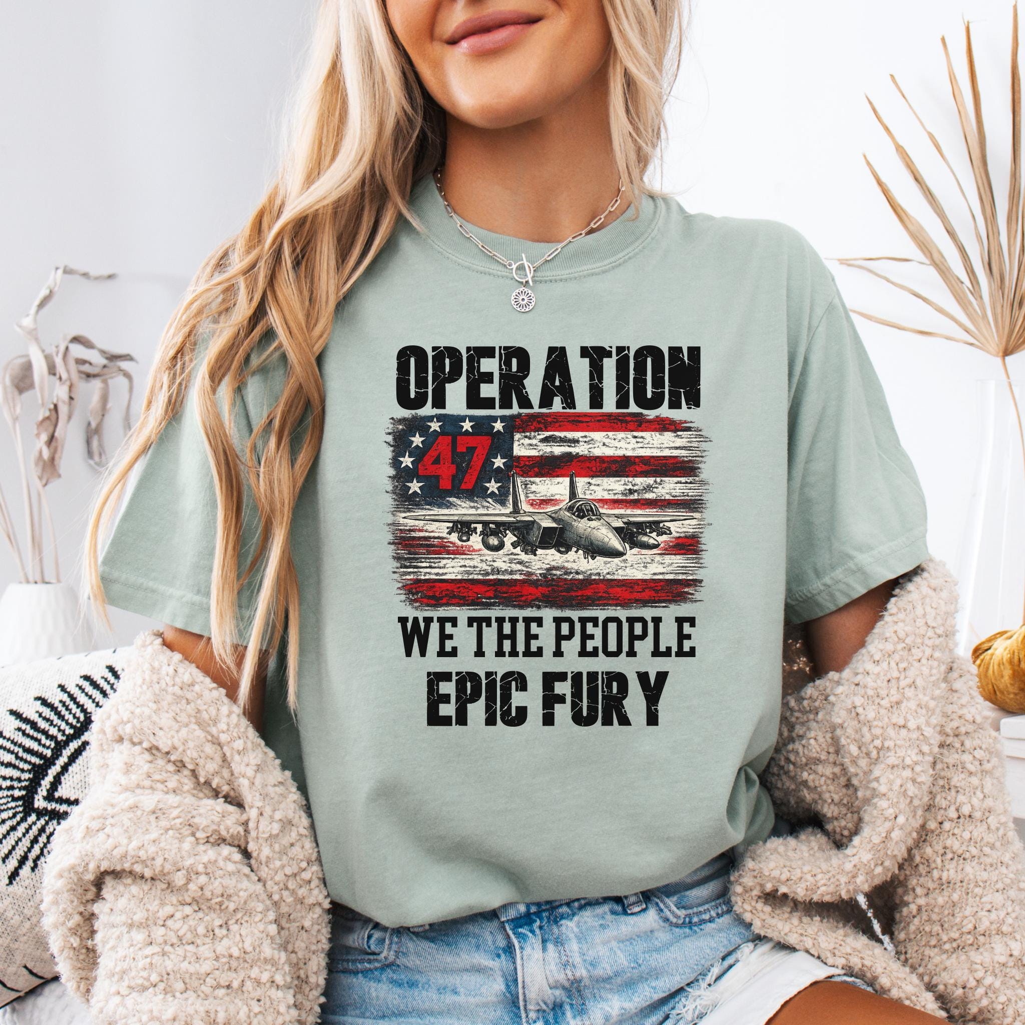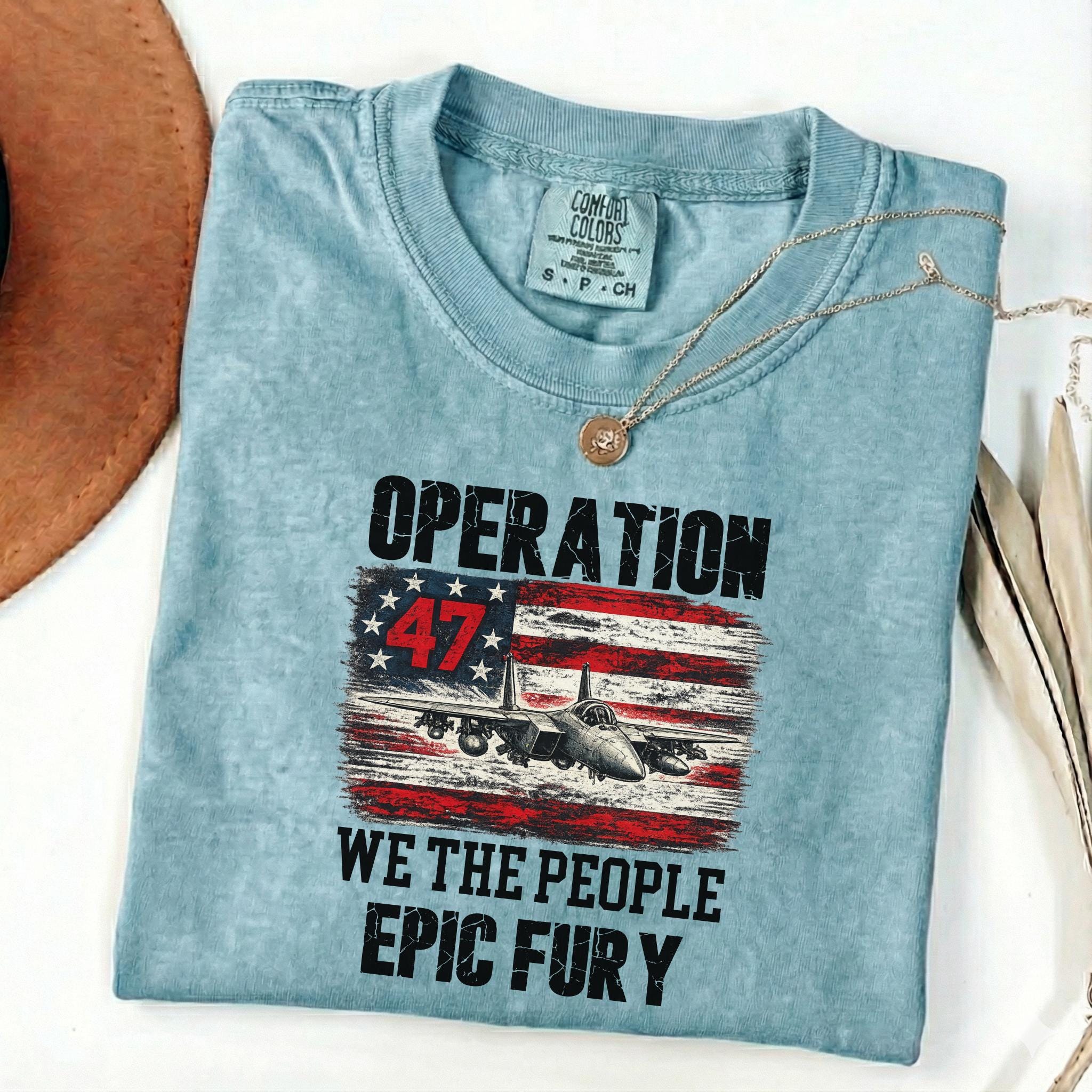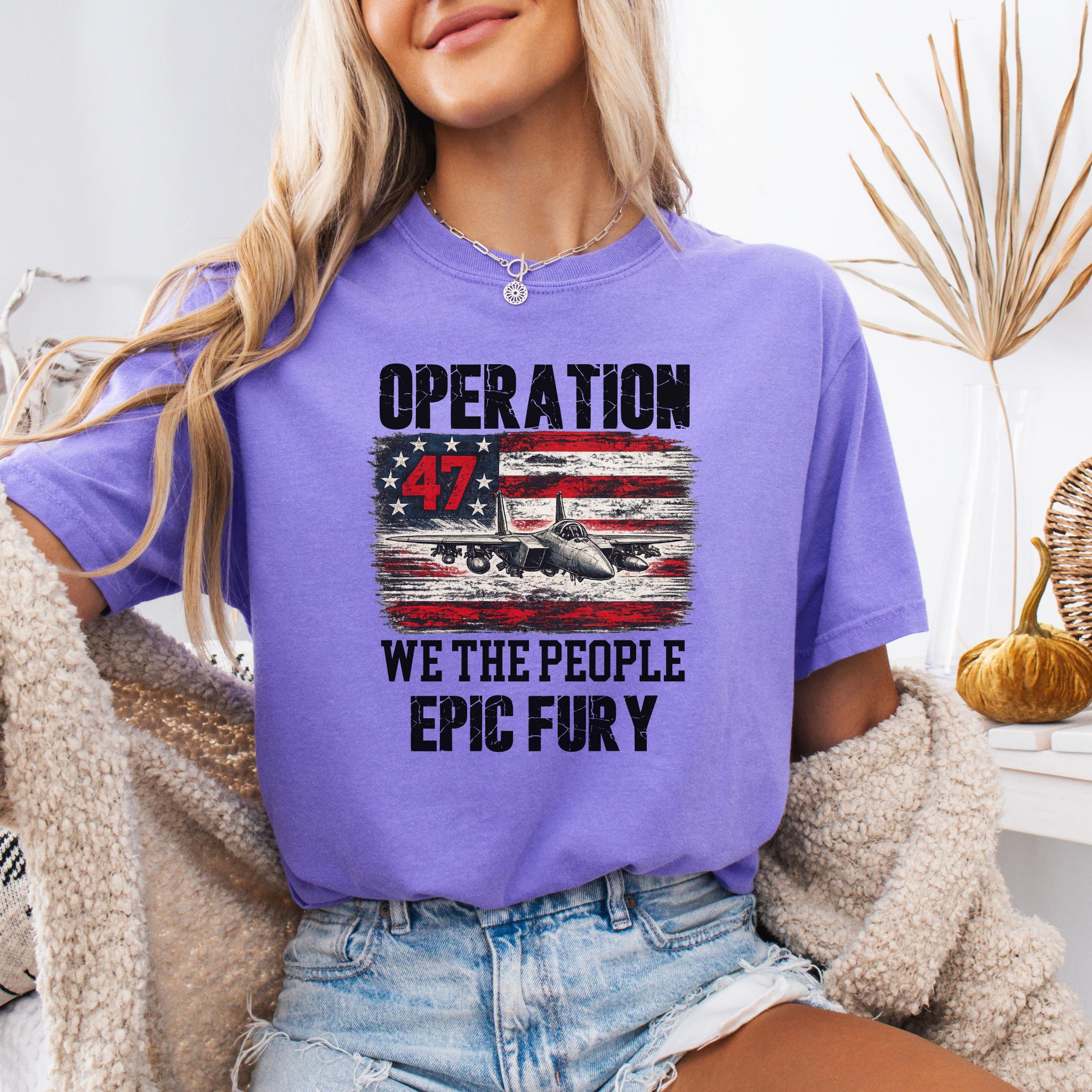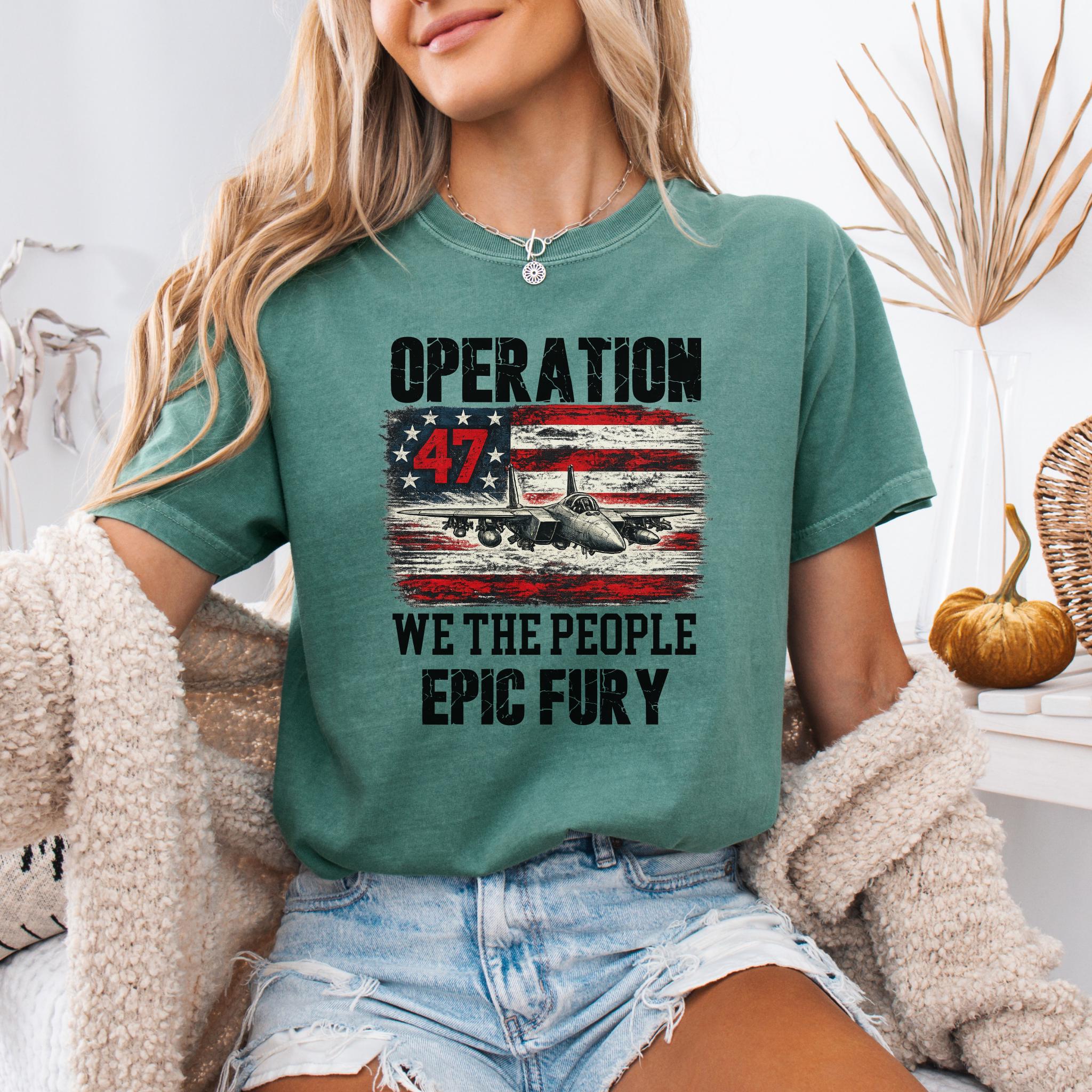 Make a bold patriotic statement with this Operation 47 graphic shirt featuring a fighter jet, distressed American flag artwork, and strong typography with We The People and Epic Fury text.