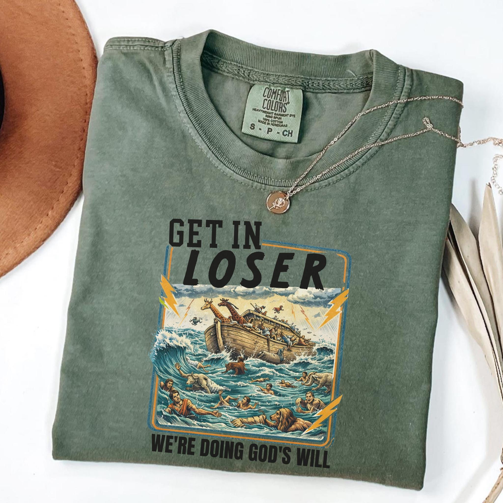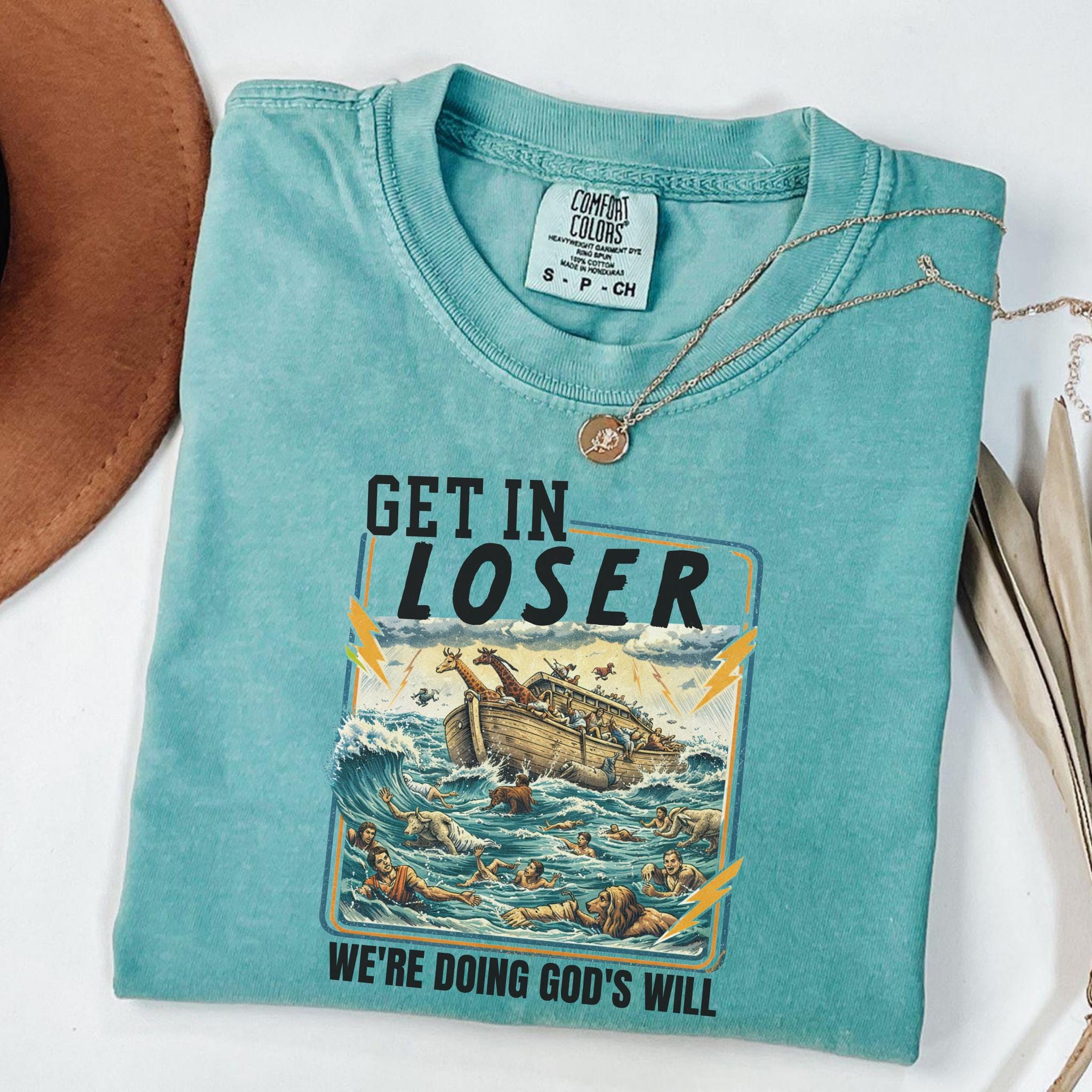 Featuring a dramatic Noah’s Ark scene with a playful meme-style slogan, this shirt is perfect for shoppers who love funny Christian apparel, Bible-inspired humor, and unique religious graphic tees. The artwork combines classic biblical imagery with modern sarcastic humor, making it stand out for church groups, youth events, faith-based gifts, and everyday conversation-starting outfits.
