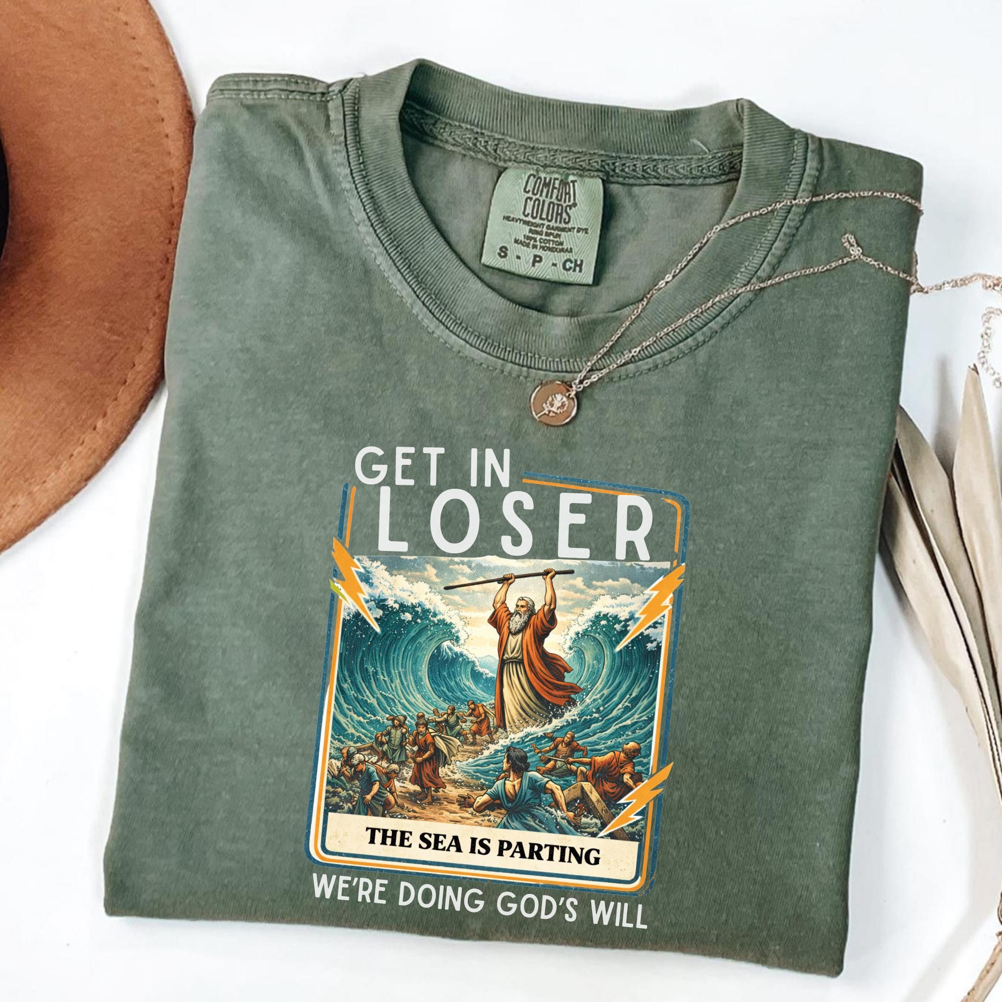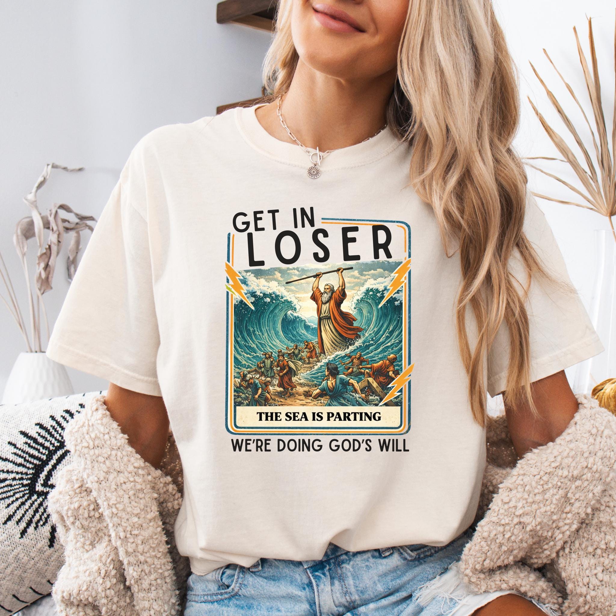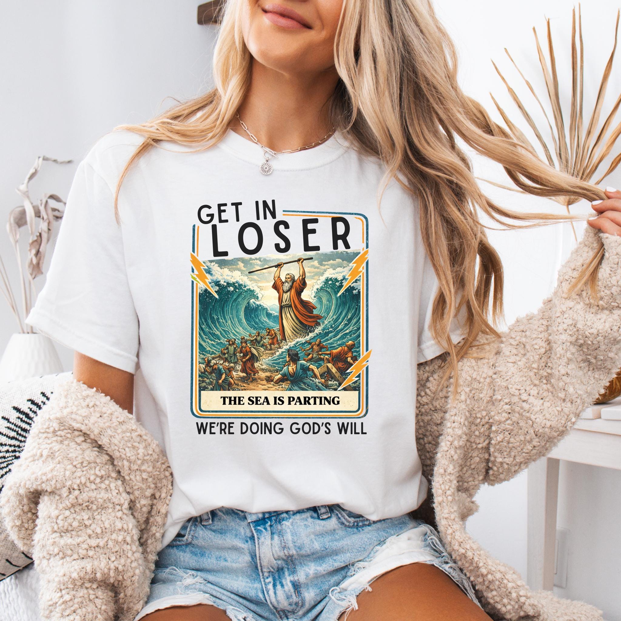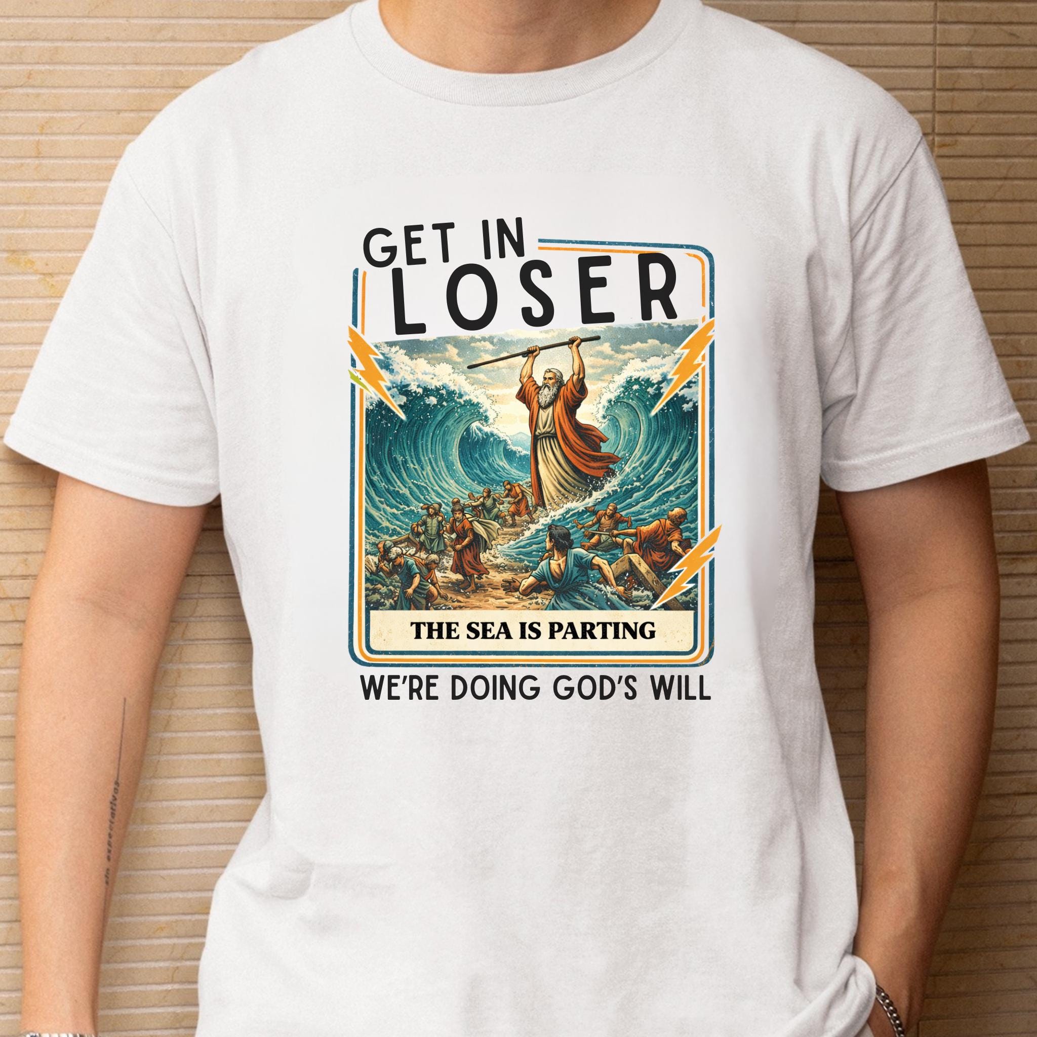 This Get In Loser The Sea Is Parting We're Doing God's Will shirt is a bold and funny faith-based design inspired by the biblical story of Moses parting the Red Sea.