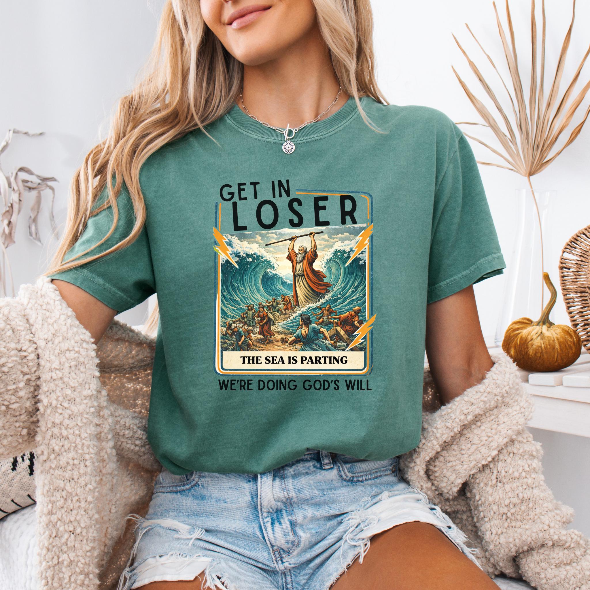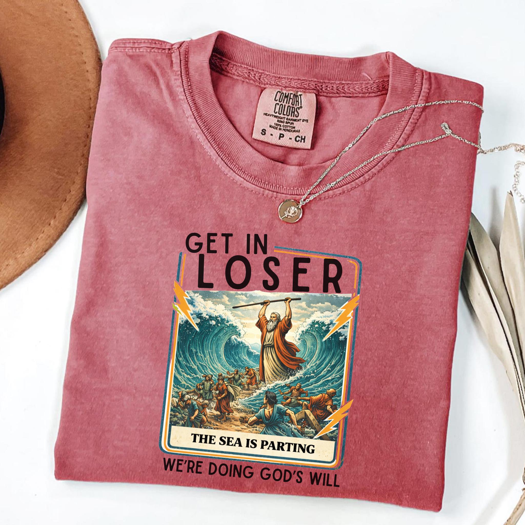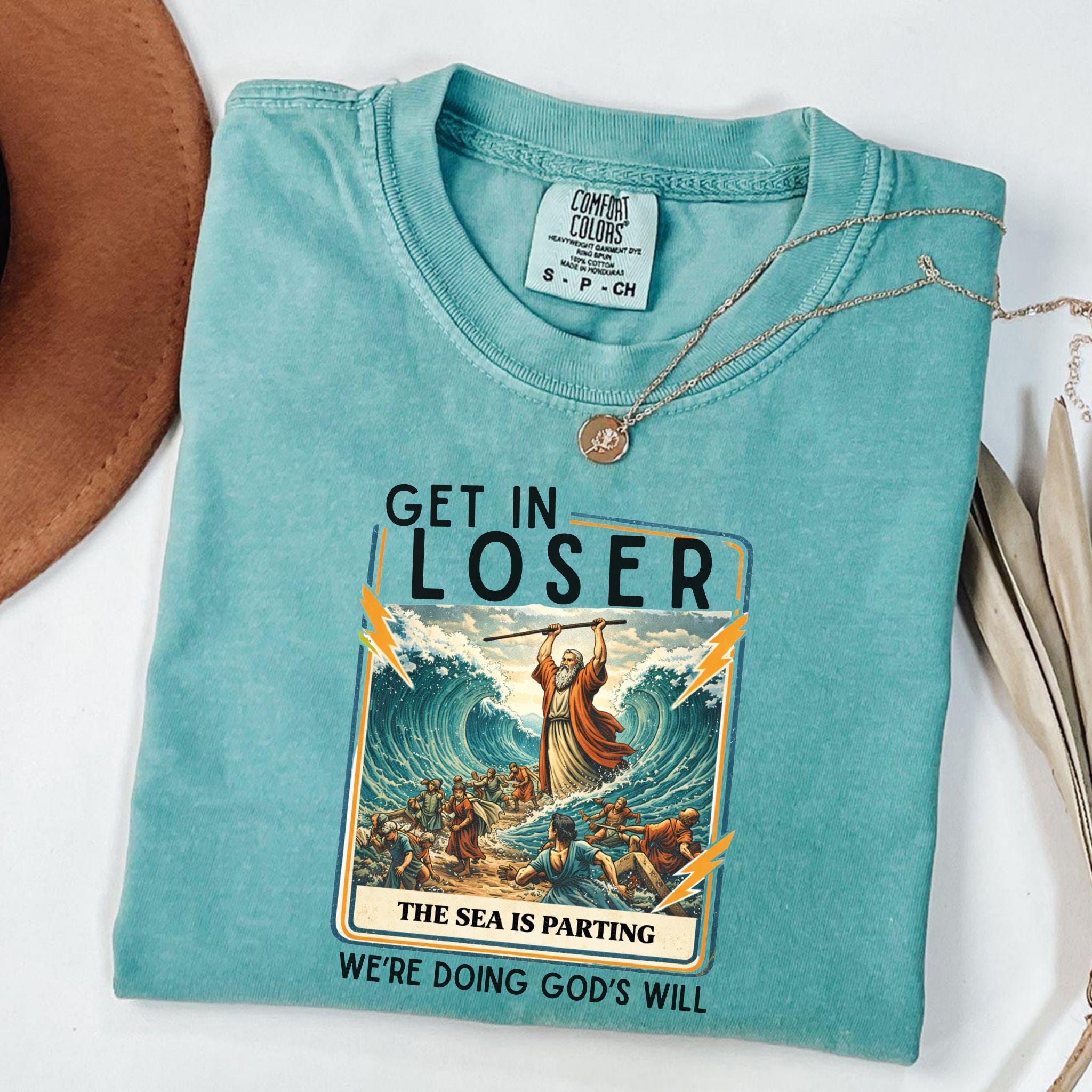This Get In Loser The Sea Is Parting We're Doing God's Will shirt is a bold and funny faith-based design inspired by the biblical story of Moses parting the Red Sea.