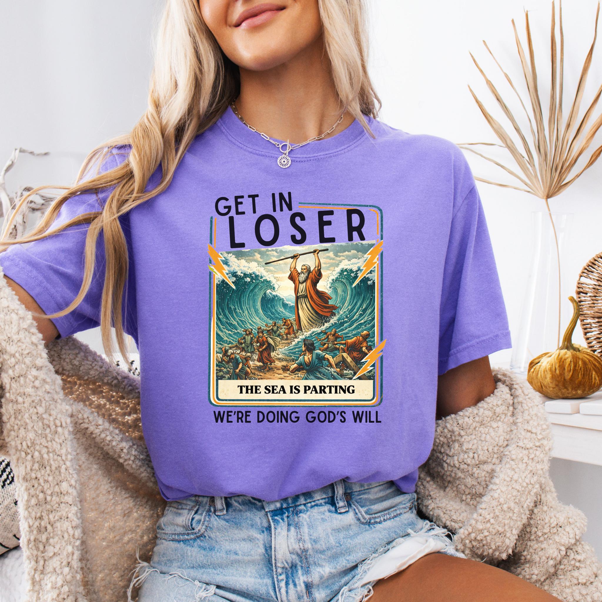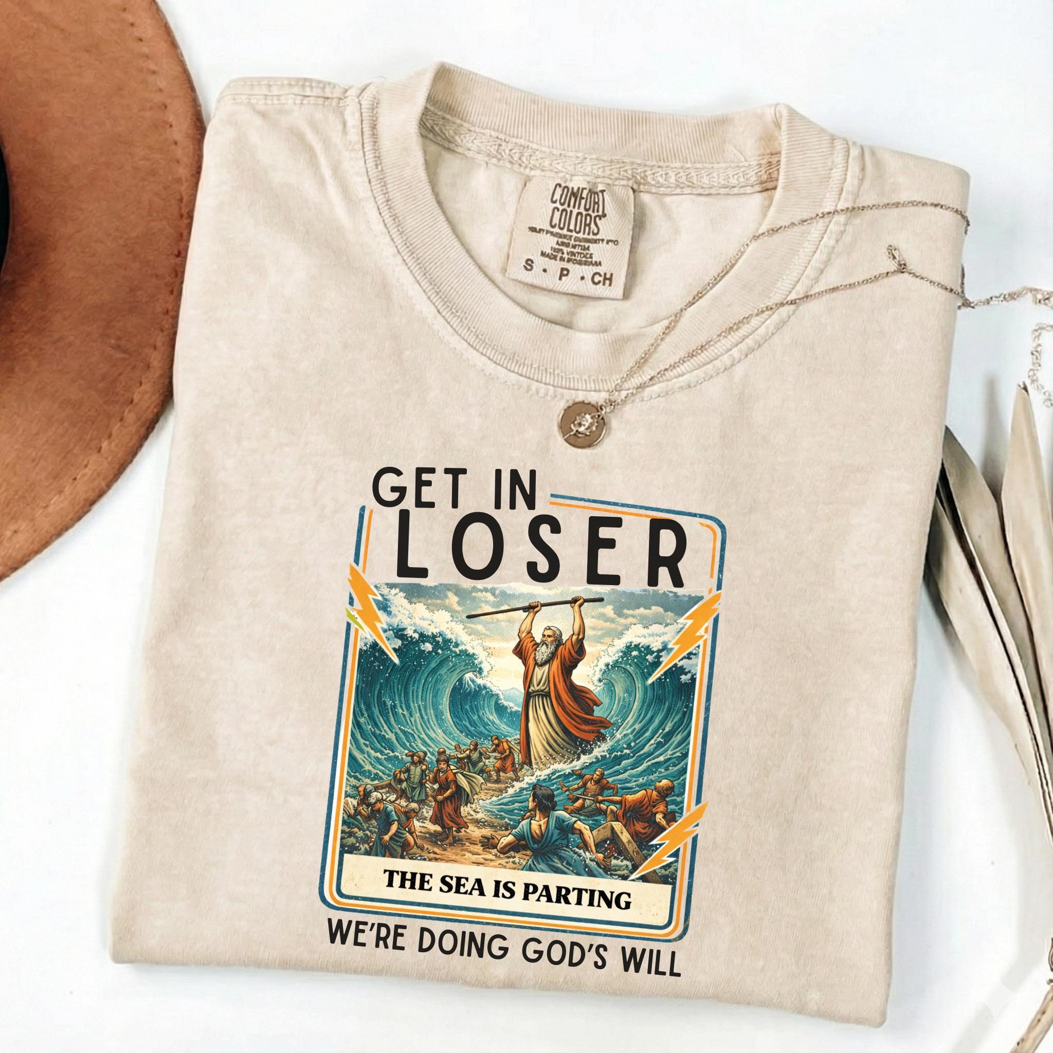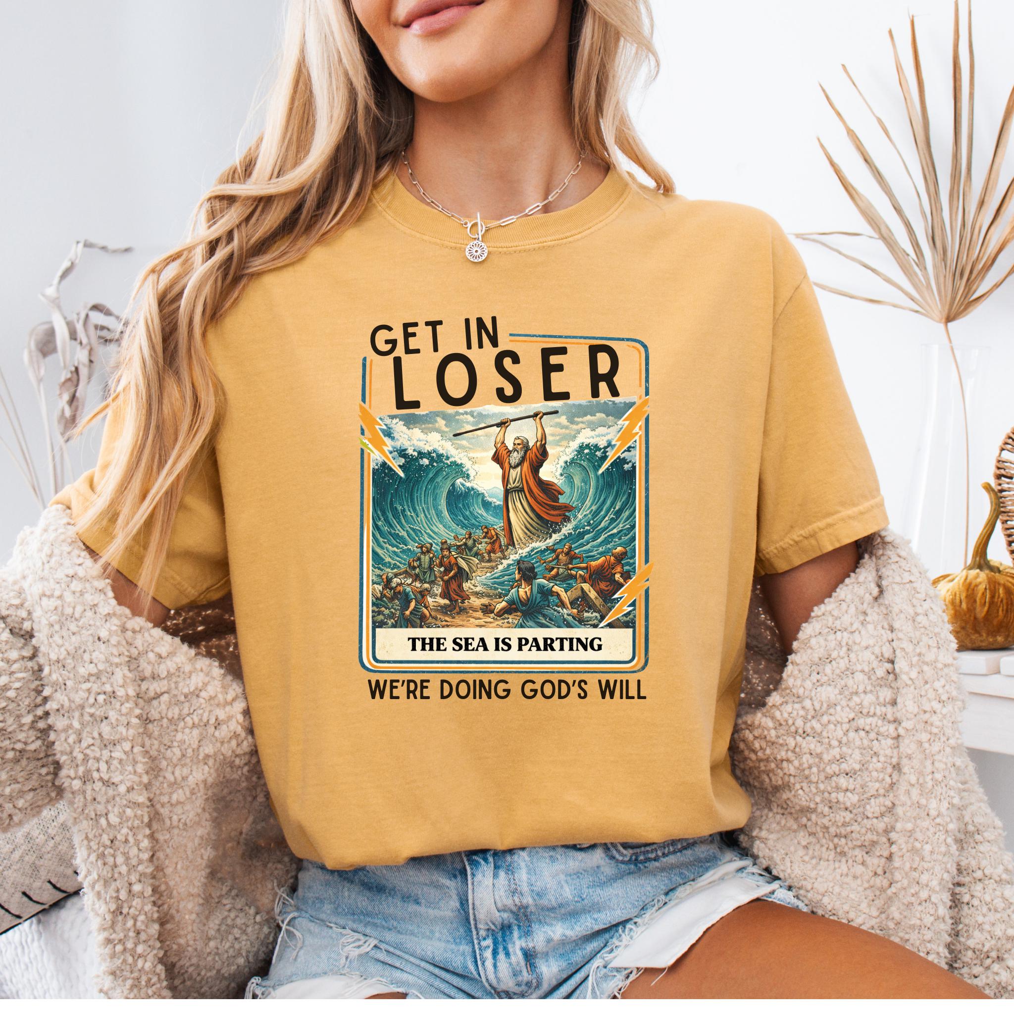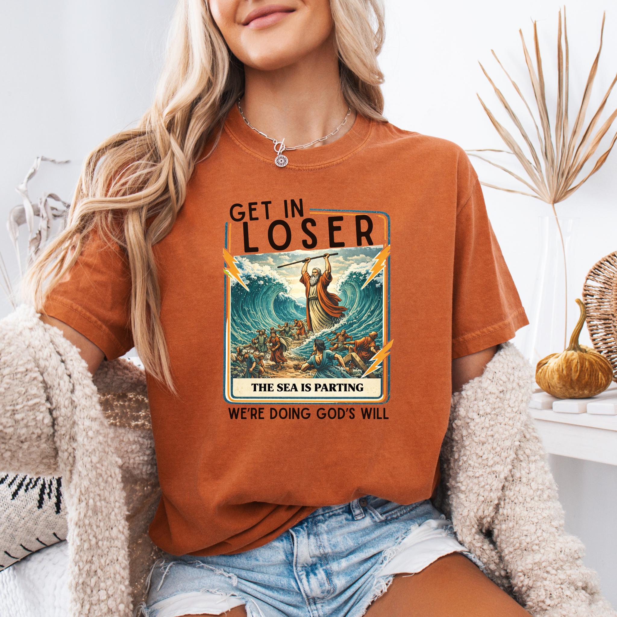 This Get In Loser The Sea Is Parting We're Doing God's Will shirt is a bold and funny faith-based design inspired by the biblical story of Moses parting the Red Sea.