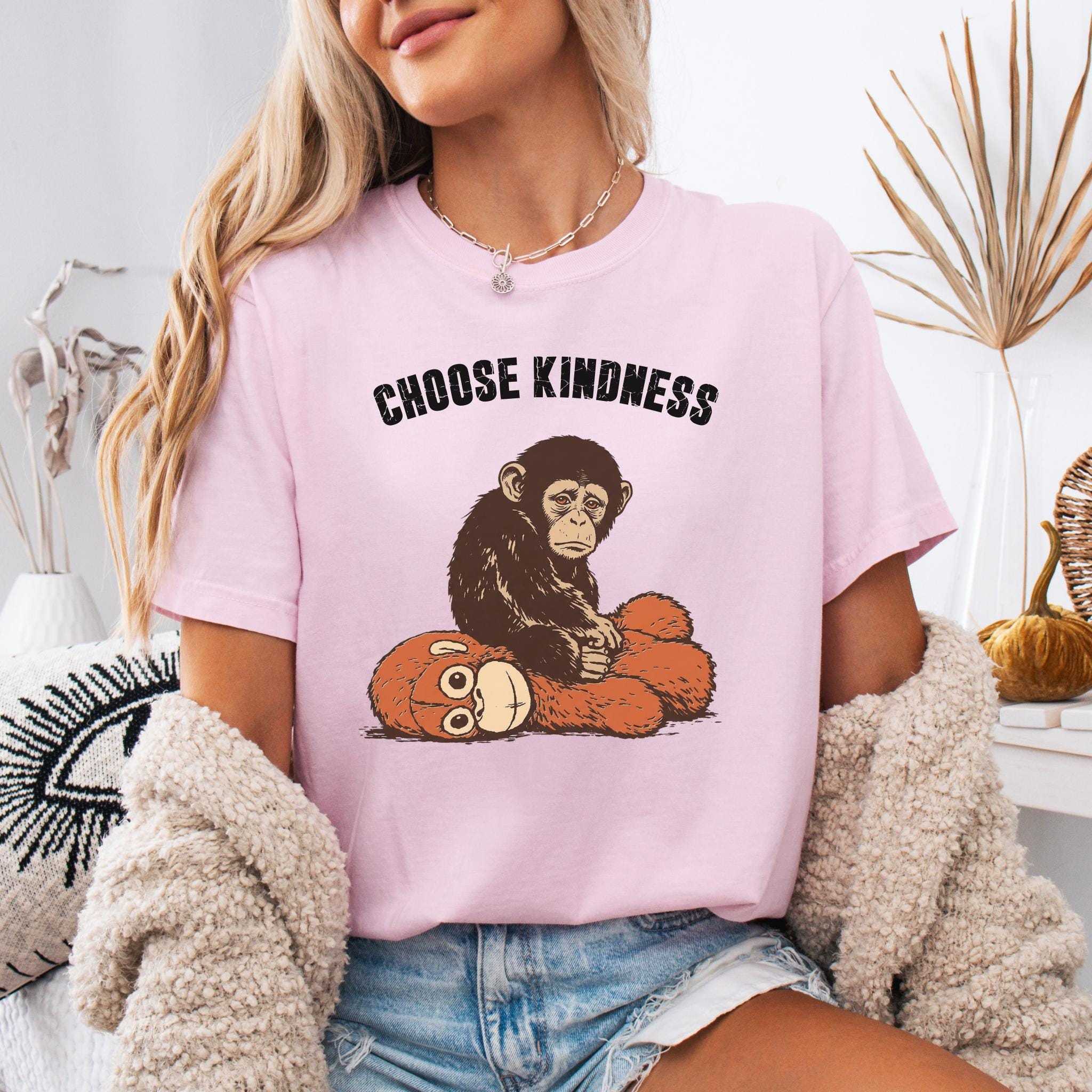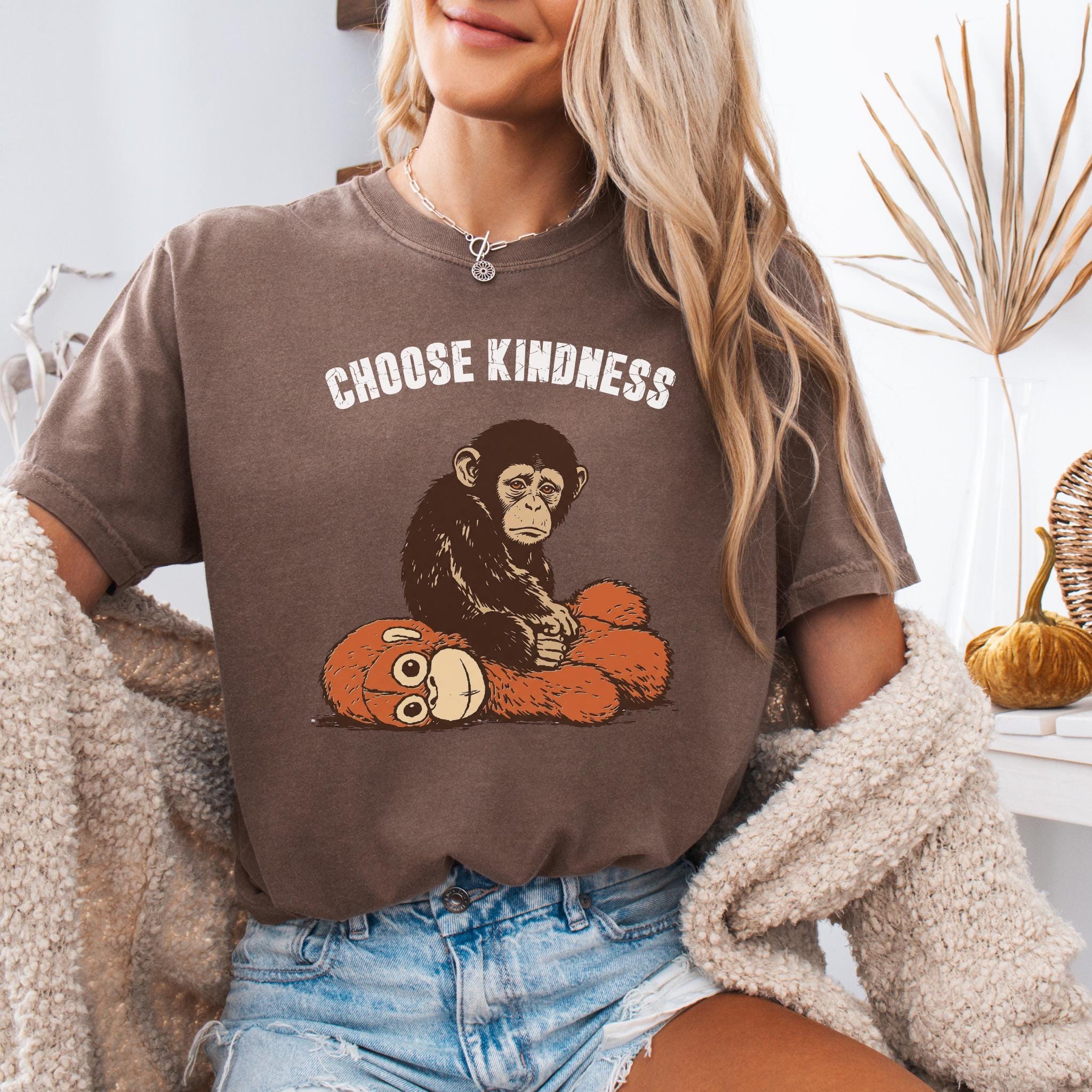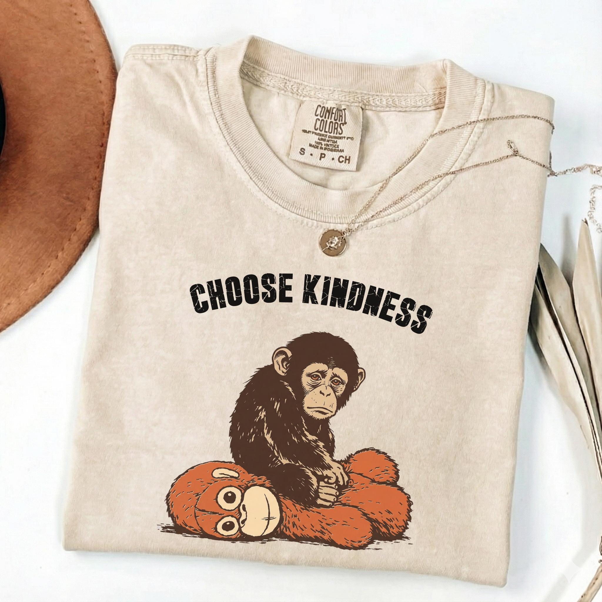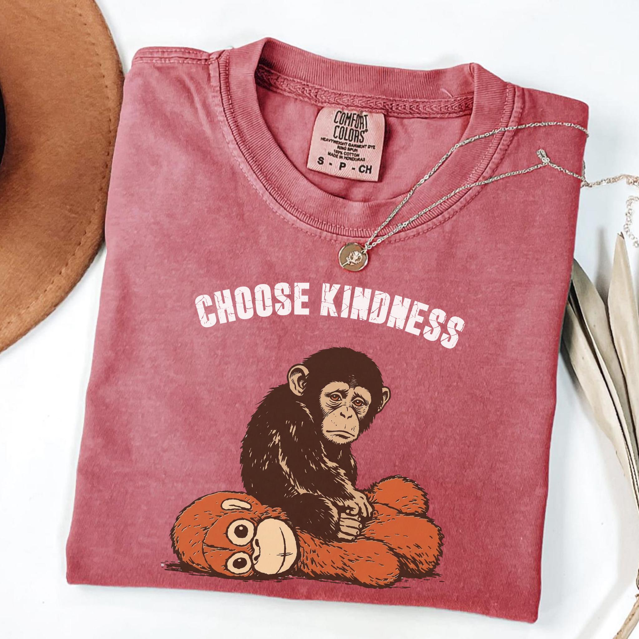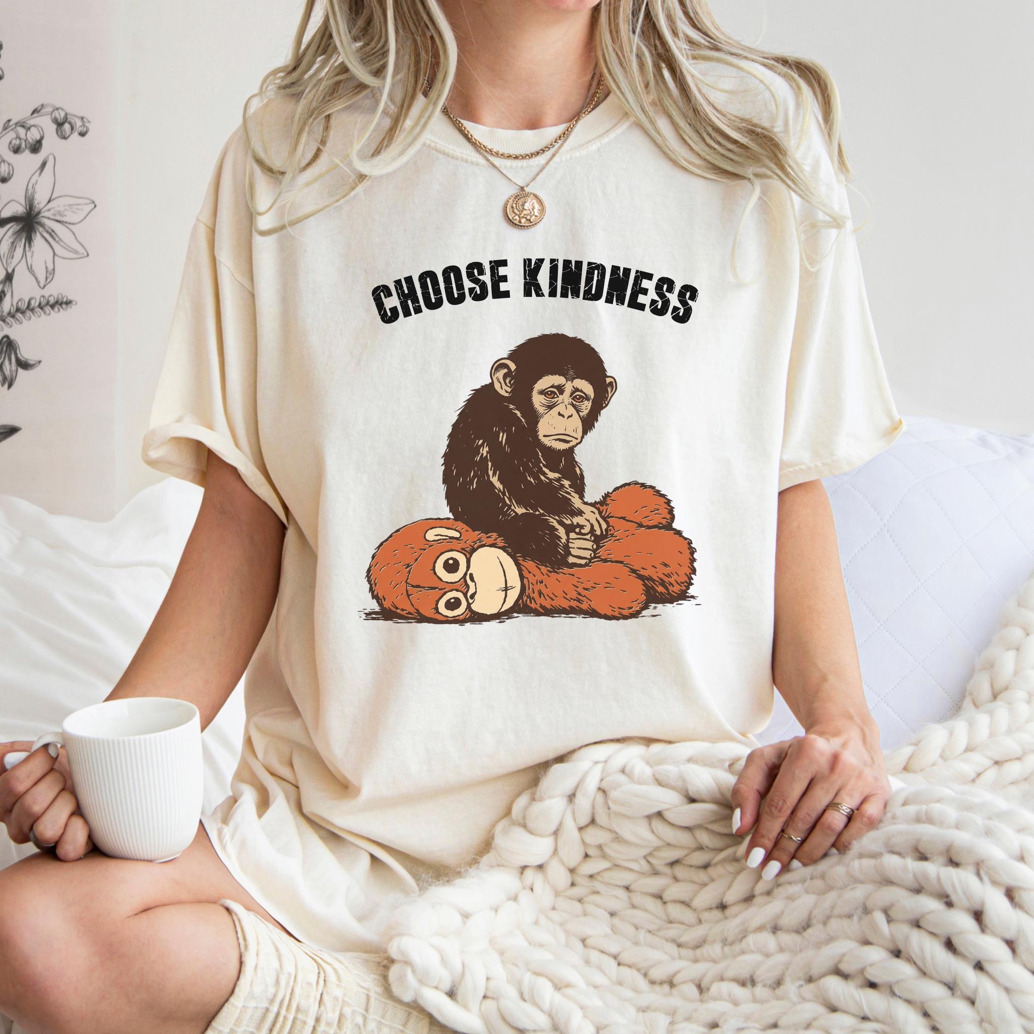 This emotional graphic features a sweet baby monkey sitting with a plush toy, paired with the uplifting phrase Choose Kindness. The design blends internet-inspired animal art with a positive message, making it perfect for shoppers who love meaningful graphics, soft emotional themes, and viral trend inspired apparel.