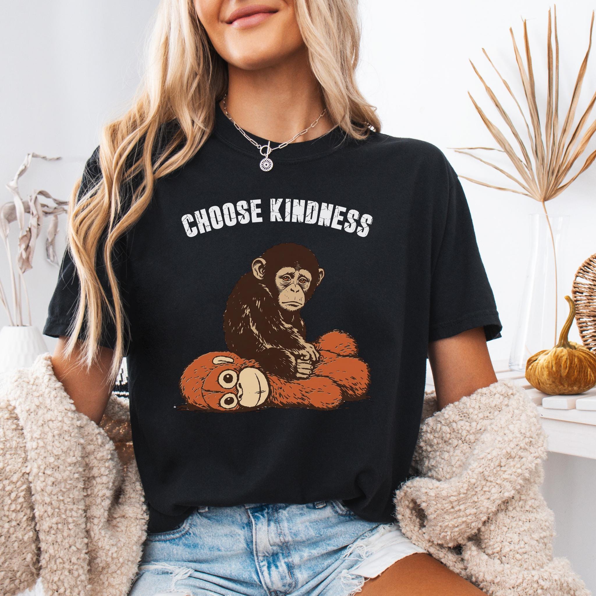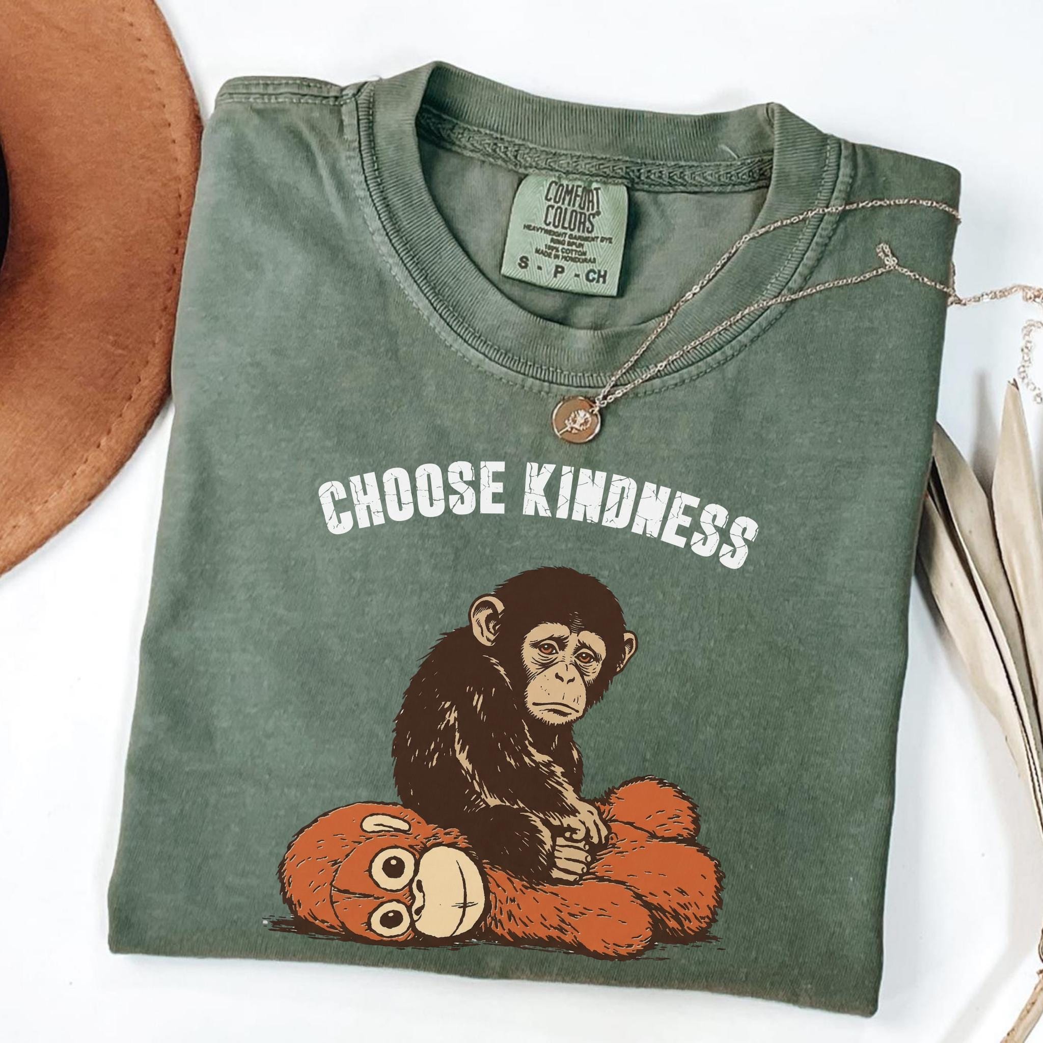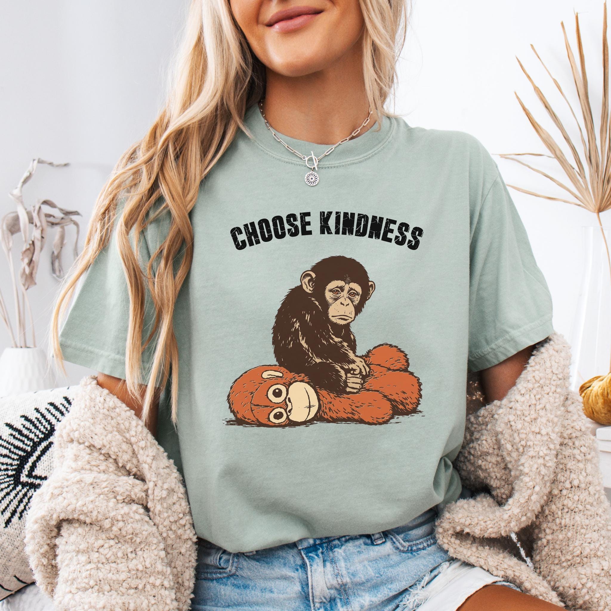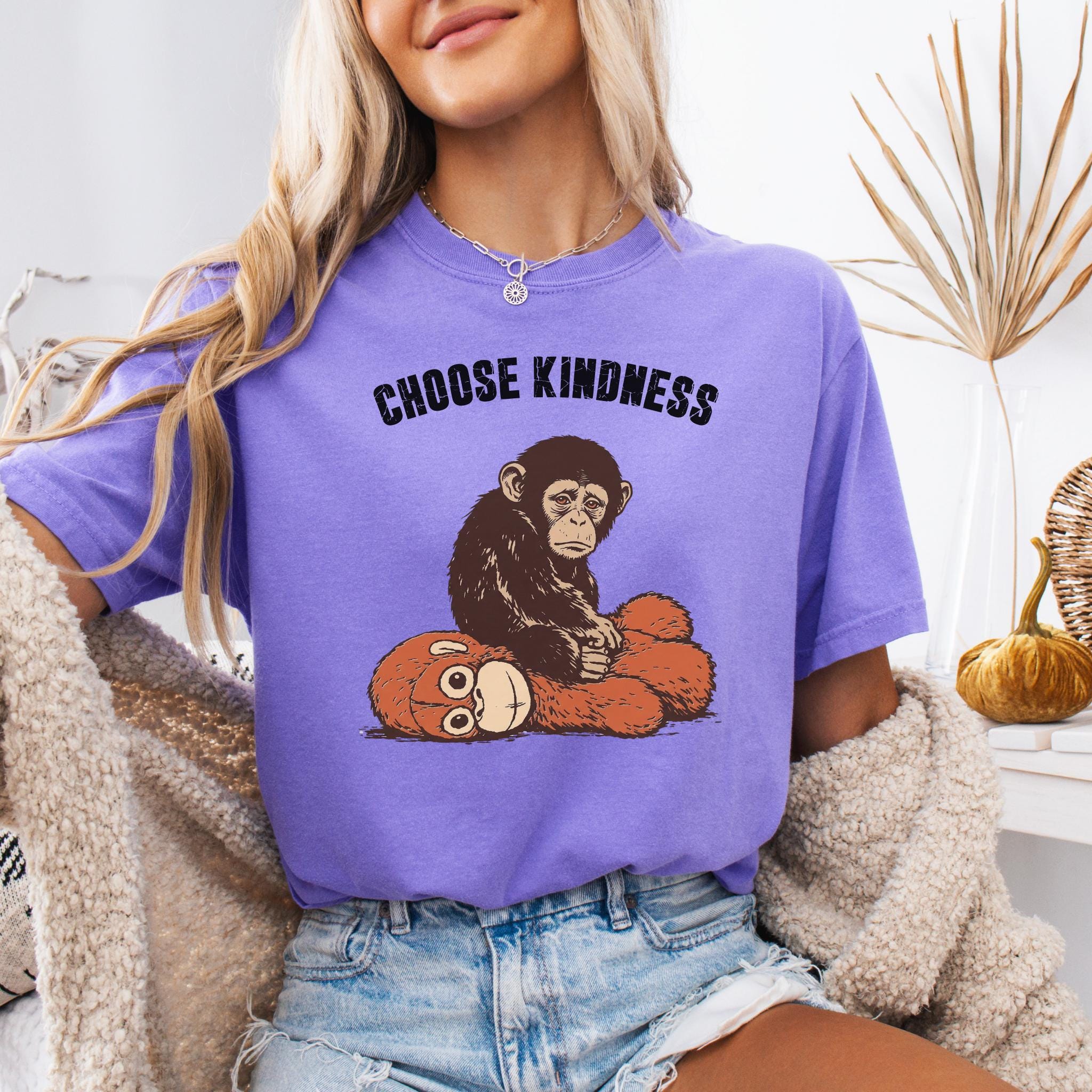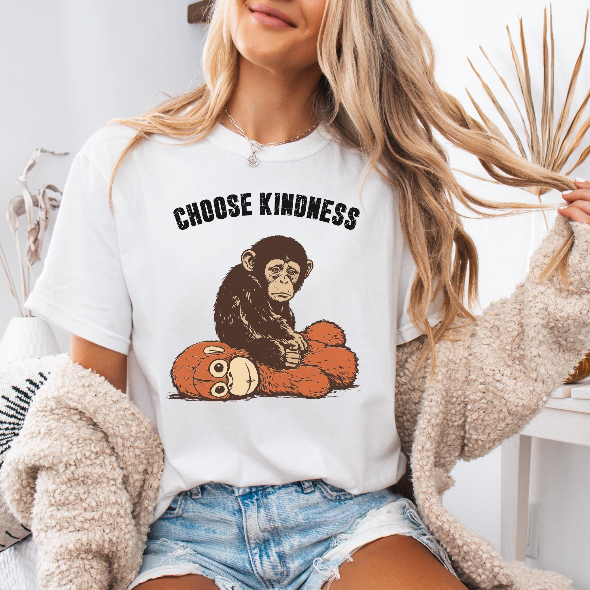 This emotional graphic features a sweet baby monkey sitting with a plush toy, paired with the uplifting phrase Choose Kindness. The design blends internet-inspired animal art with a positive message, making it perfect for shoppers who love meaningful graphics, soft emotional themes, and viral trend inspired apparel.
