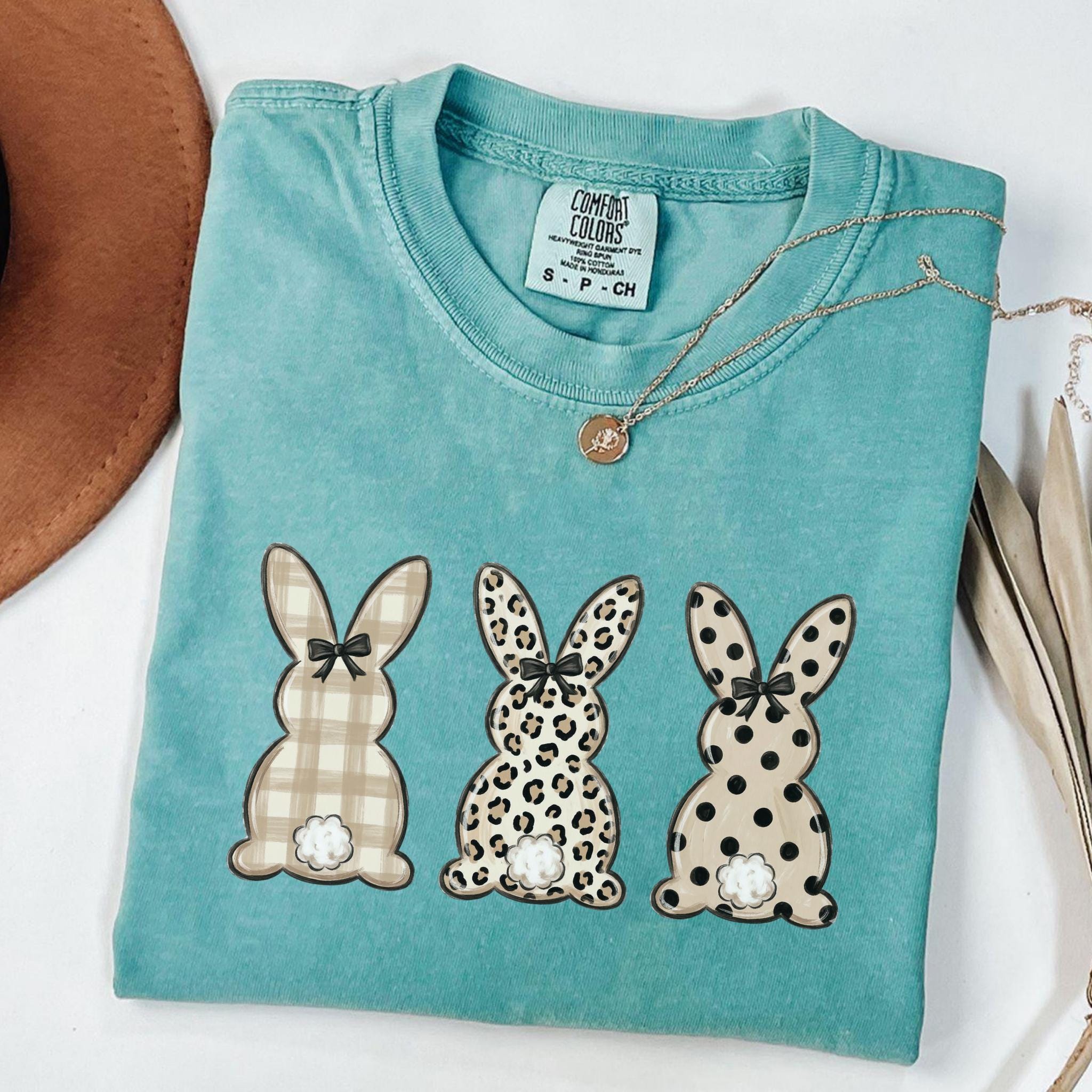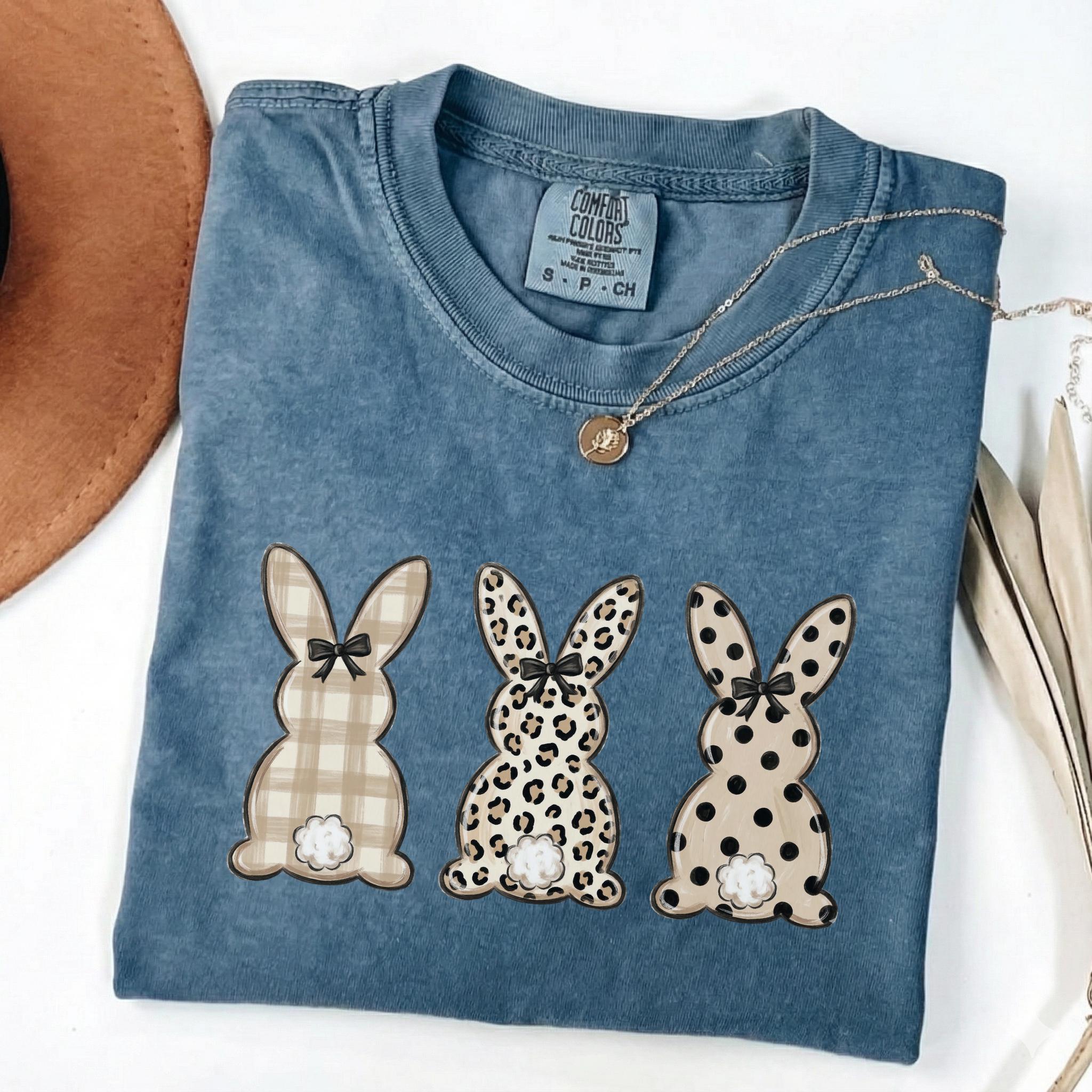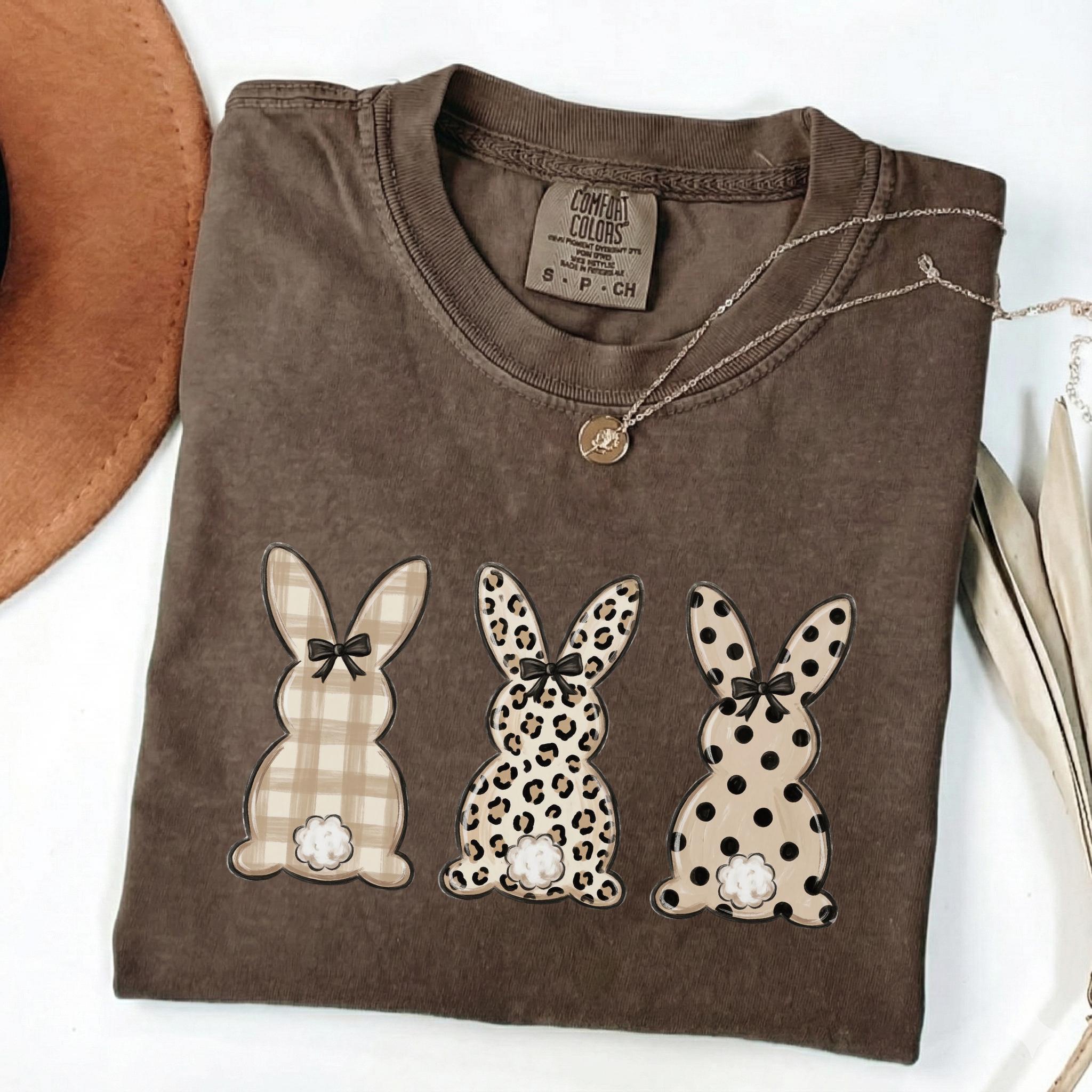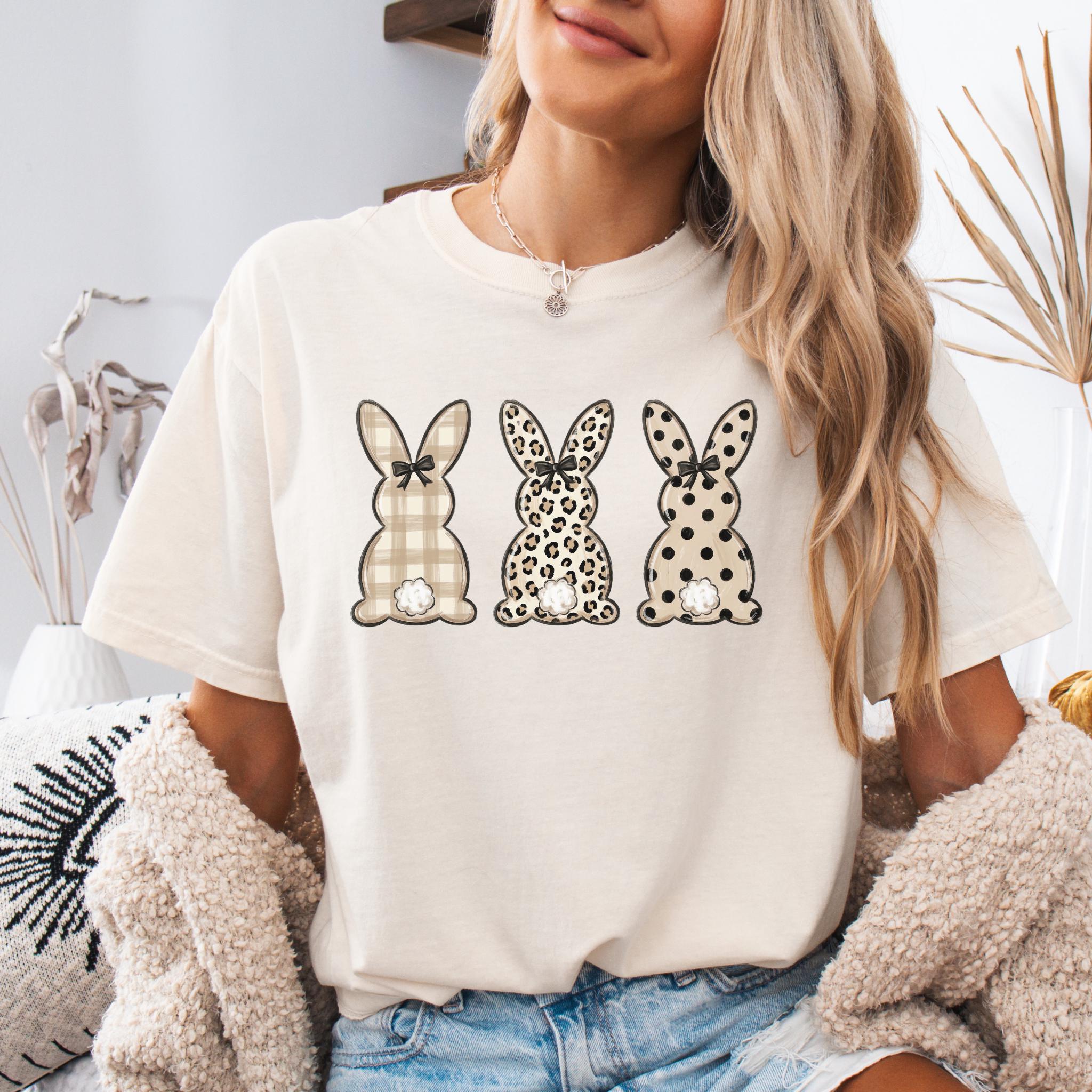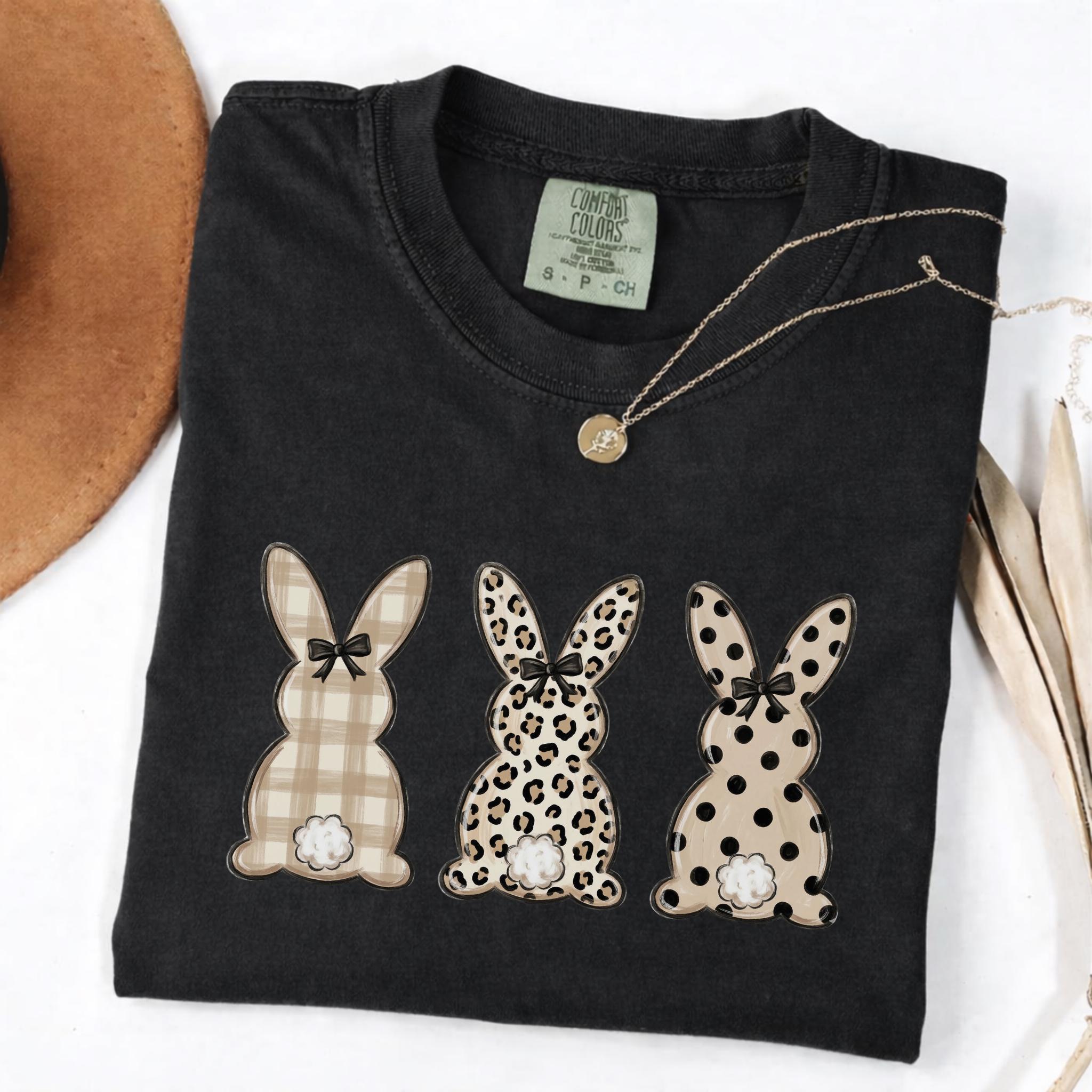 Celebrate spring in sweet neutral style with this adorable coquette Easter bunny design featuring three patterned bunny silhouettes with plaid, leopard pattern, and polka dot details finished with cute bow accents.