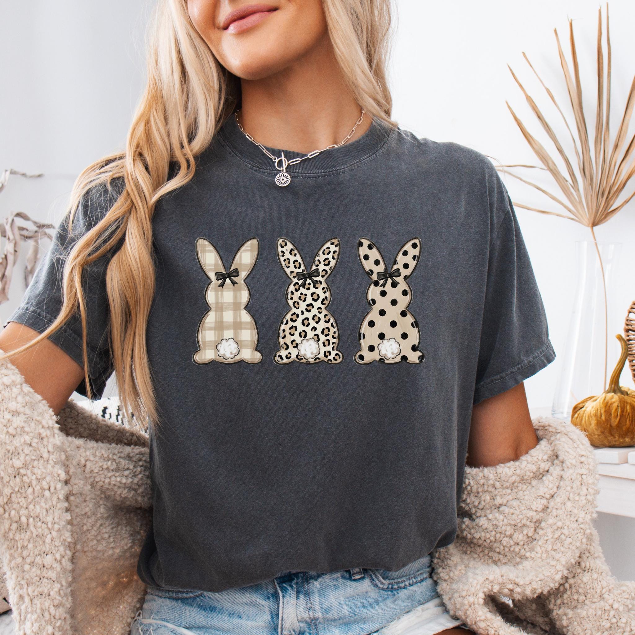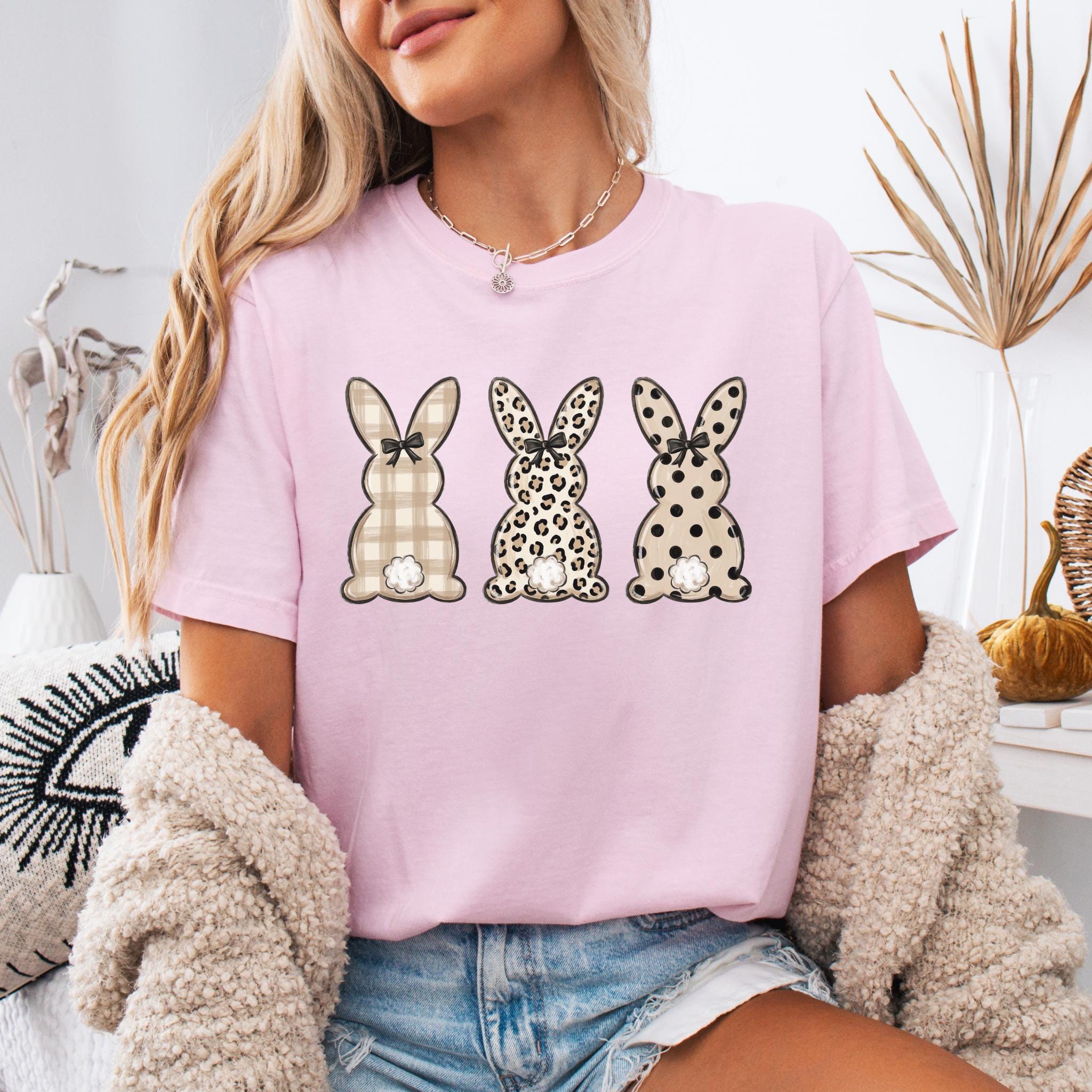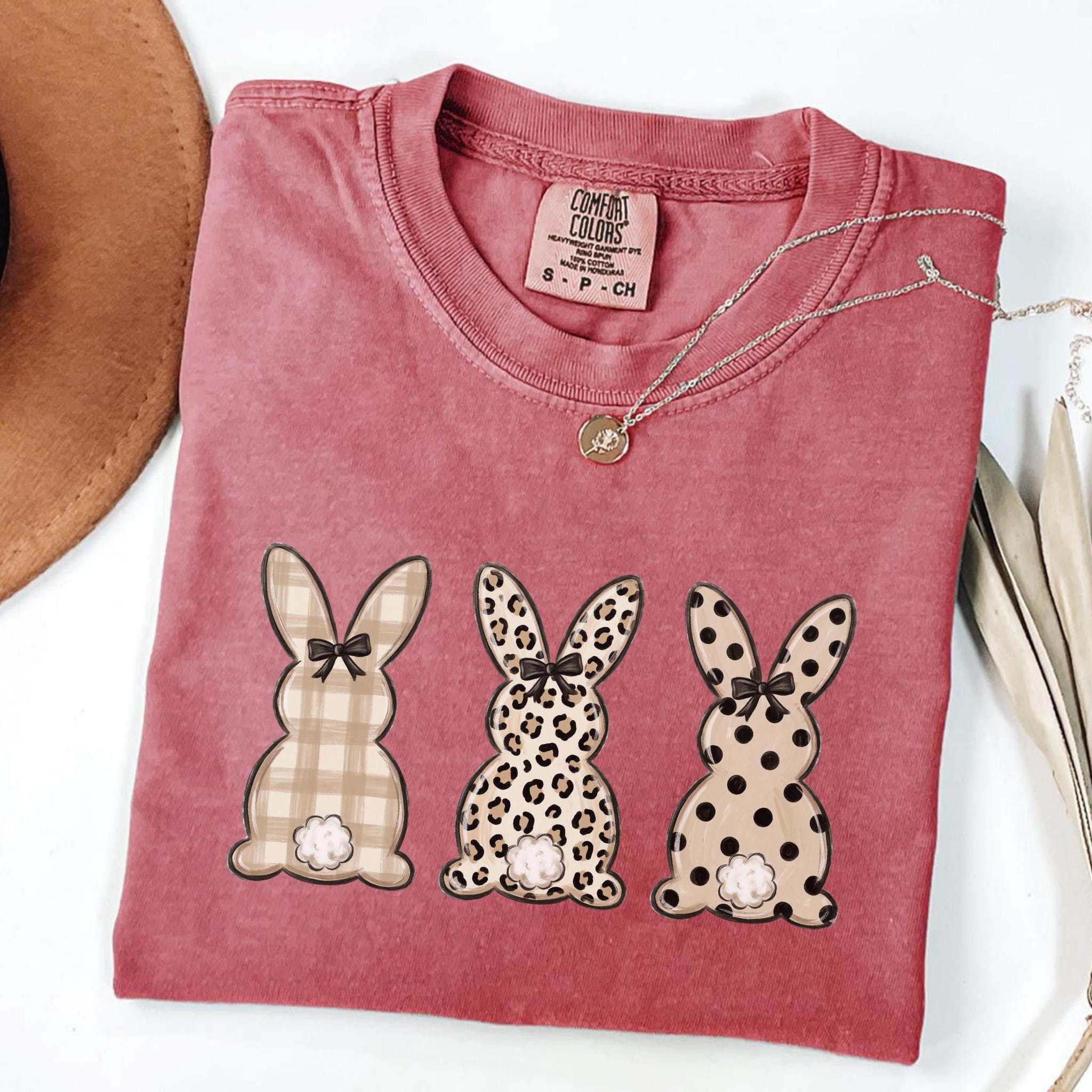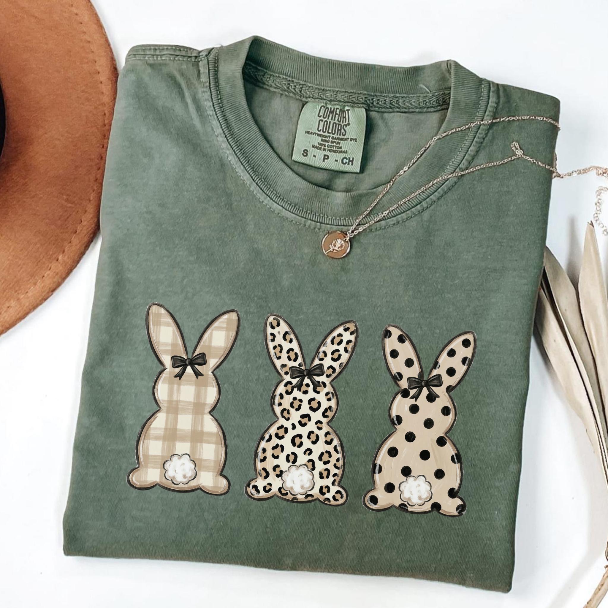 Celebrate spring in sweet neutral style with this adorable coquette Easter bunny design featuring three patterned bunny silhouettes with plaid, leopard pattern, and polka dot details finished with cute bow accents.