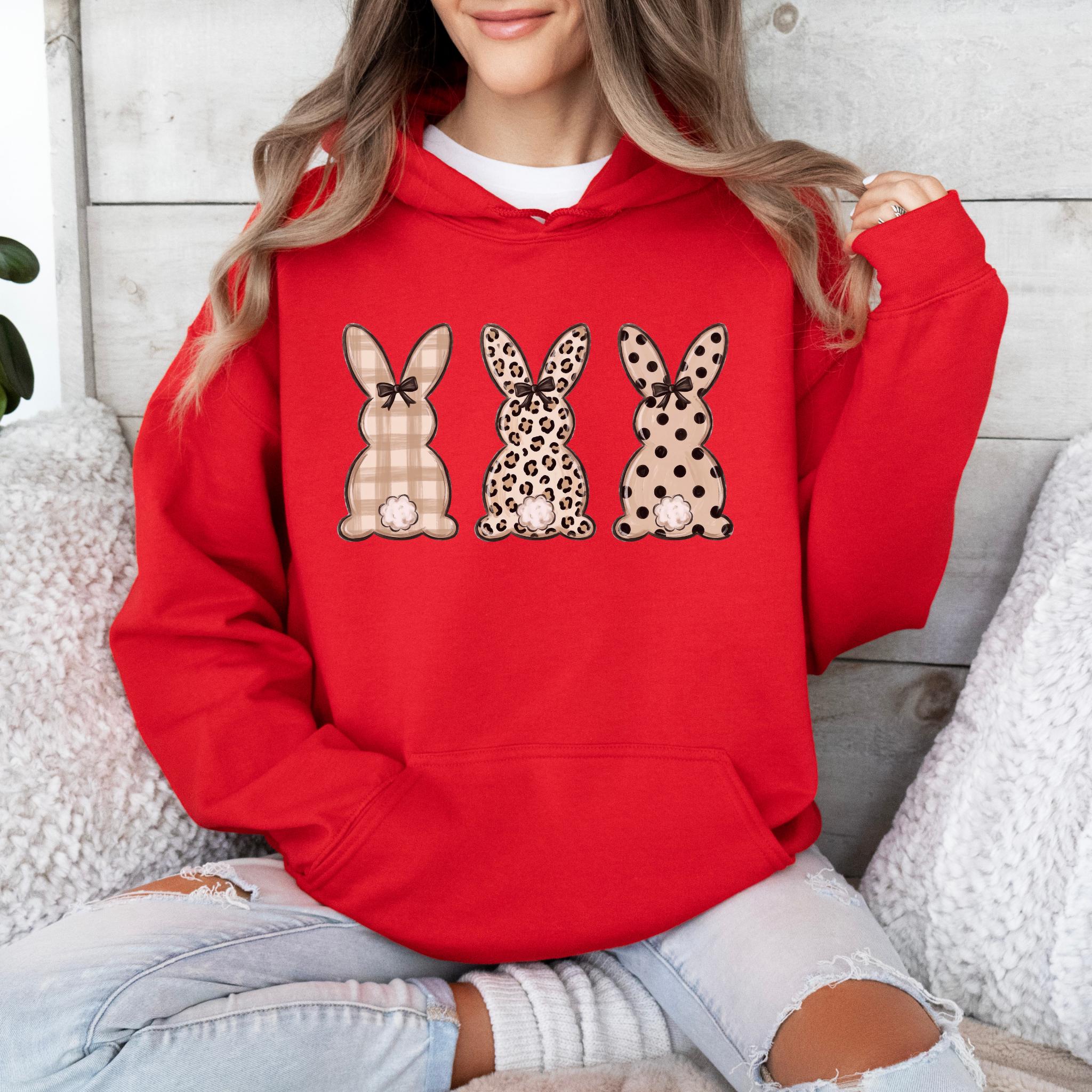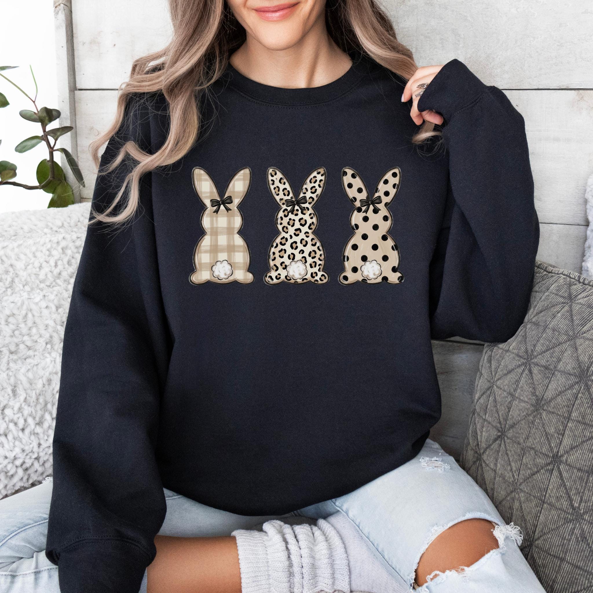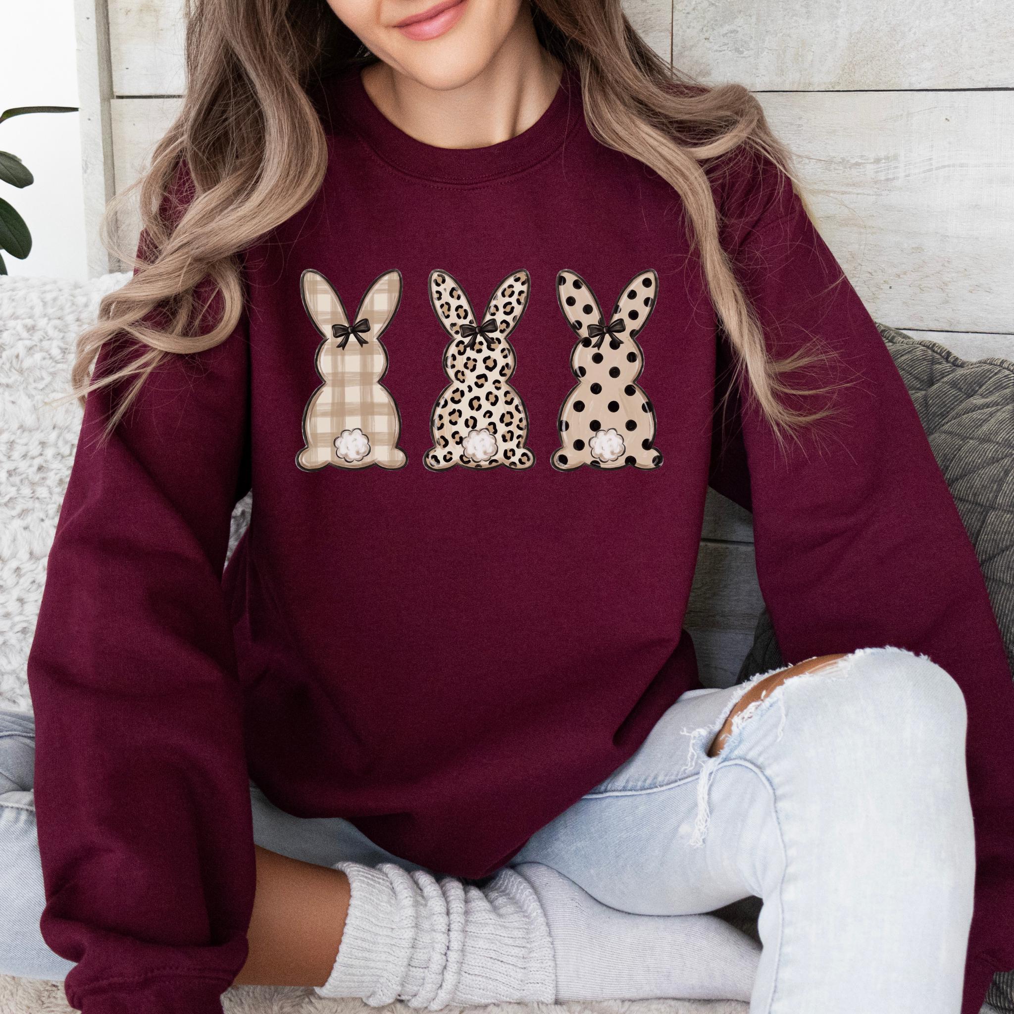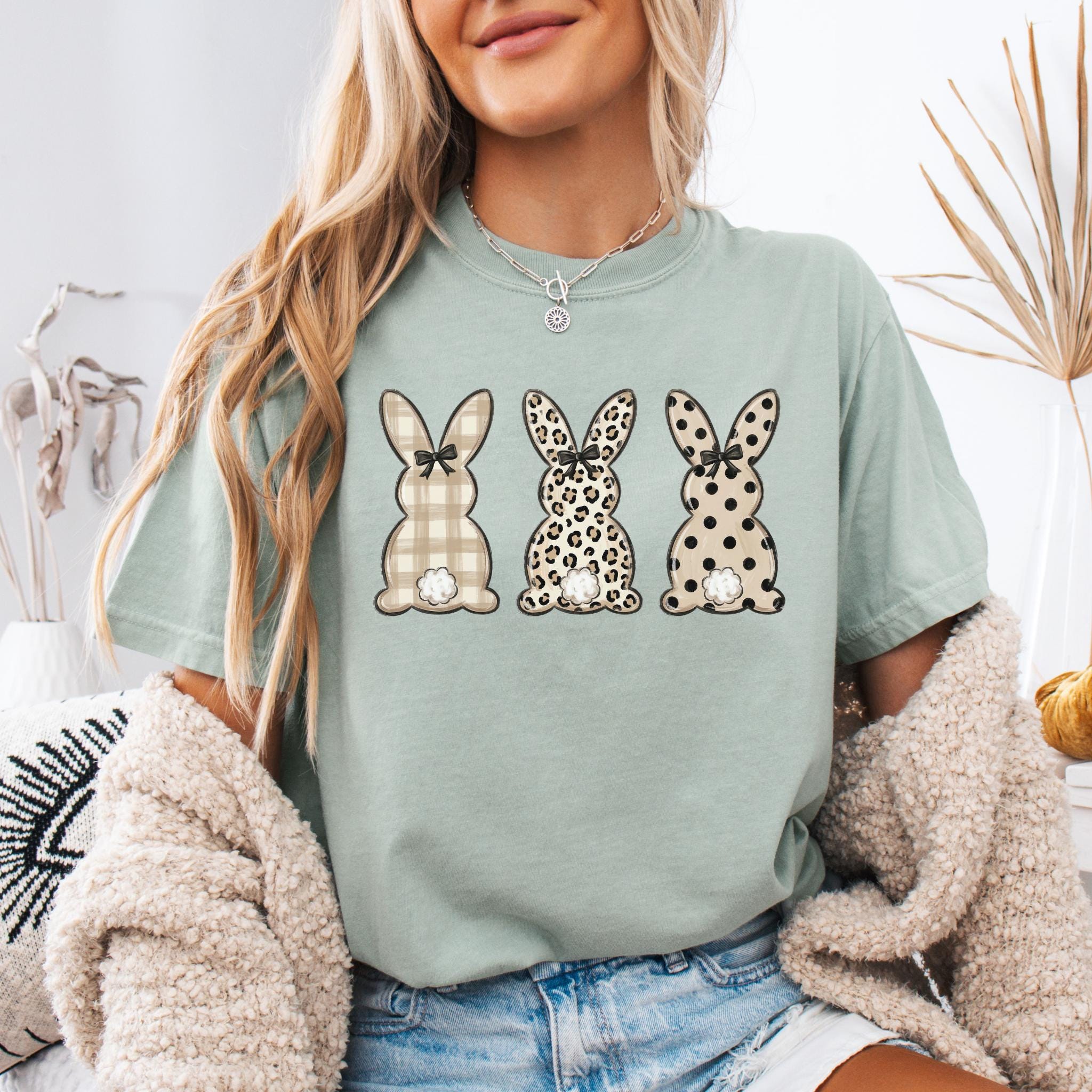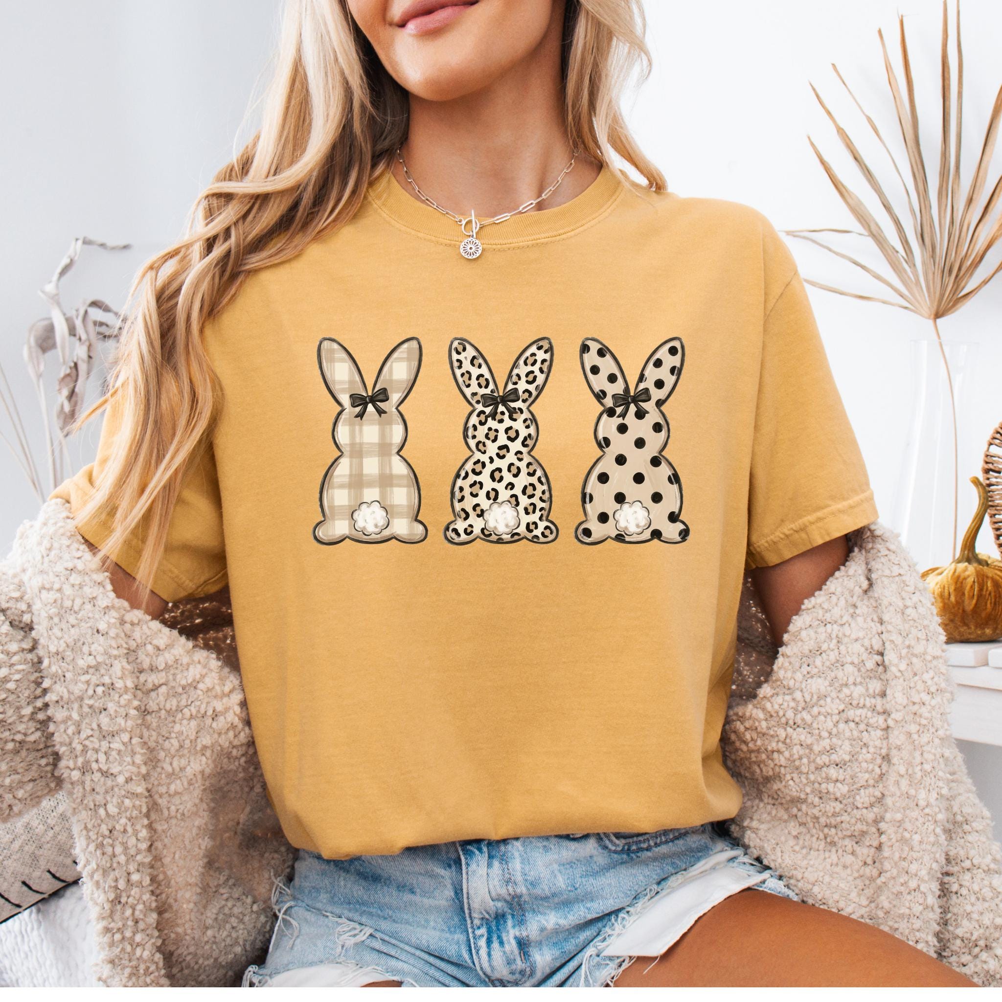 Celebrate spring in sweet neutral style with this adorable coquette Easter bunny design featuring three patterned bunny silhouettes with plaid, leopard pattern, and polka dot details finished with cute bow accents.