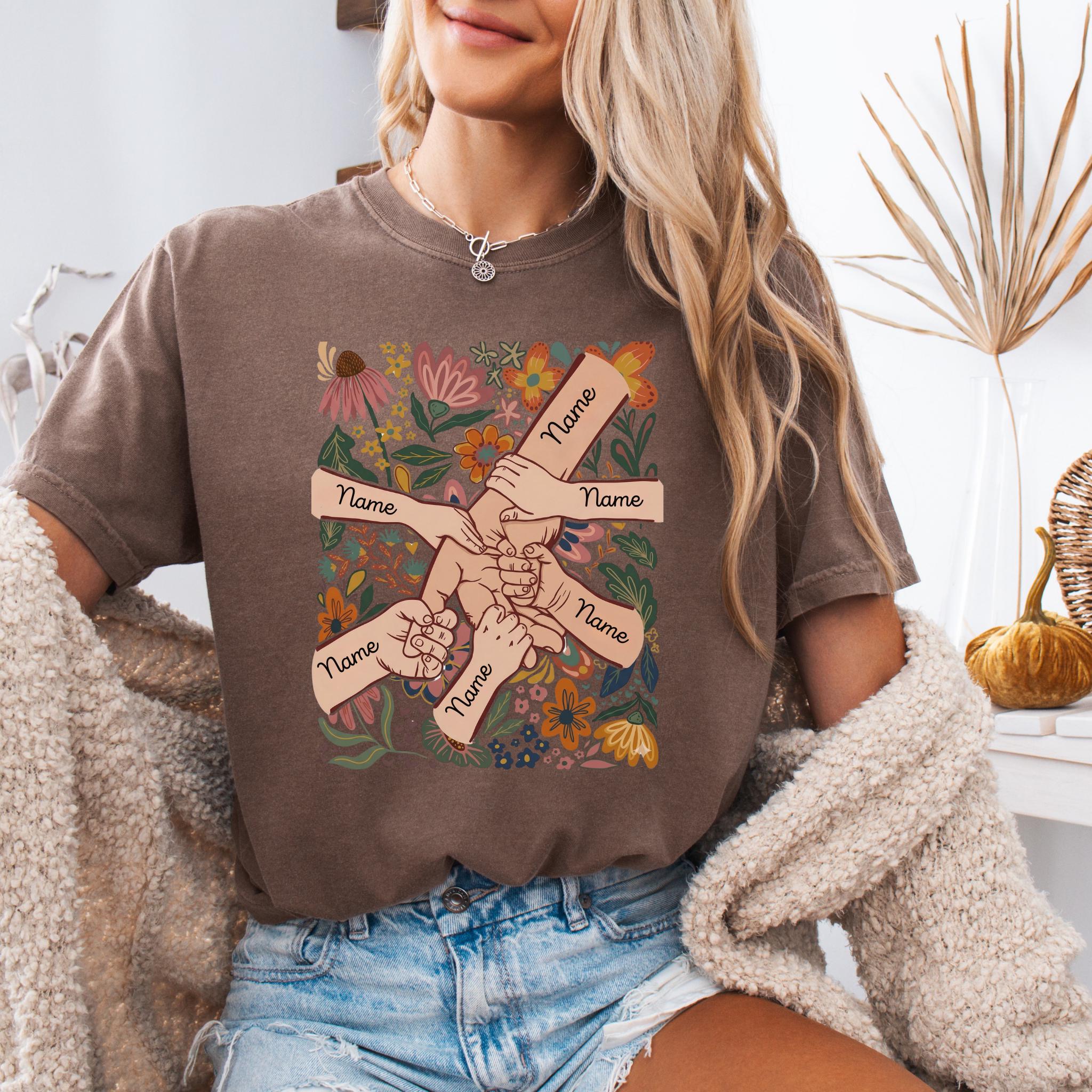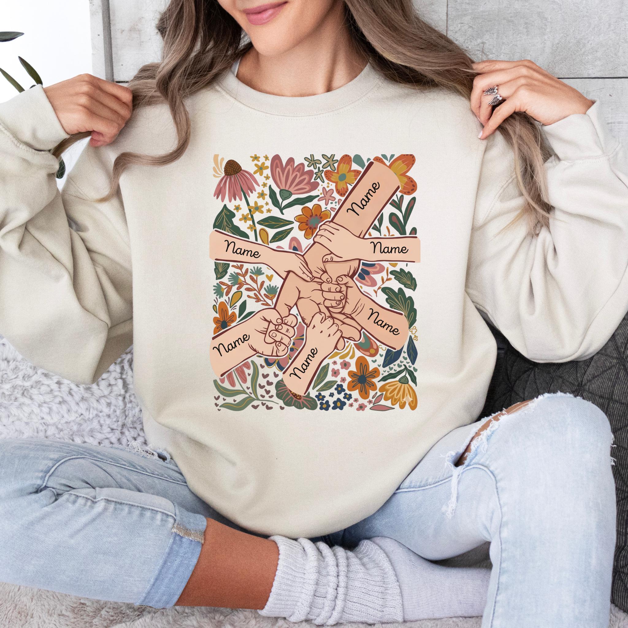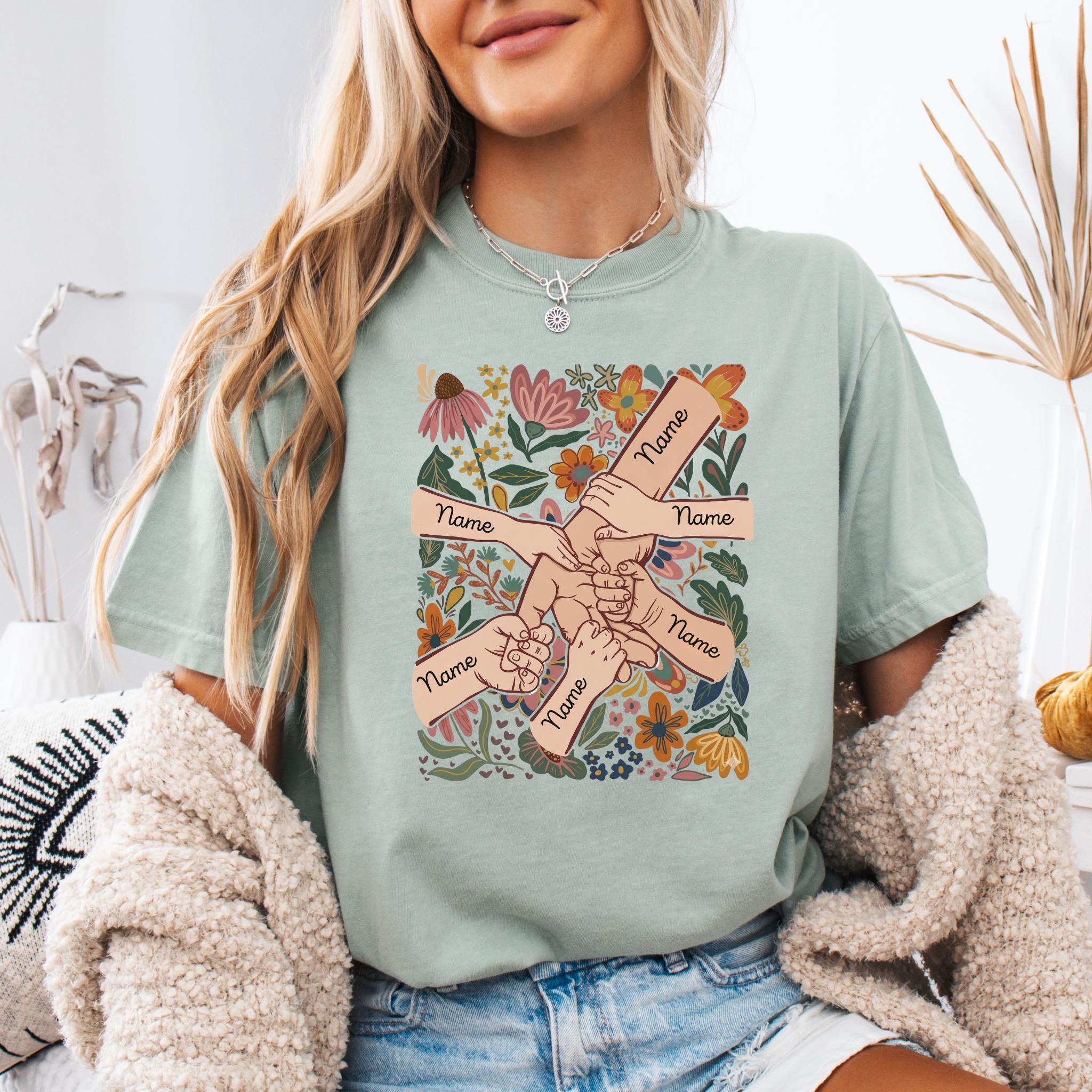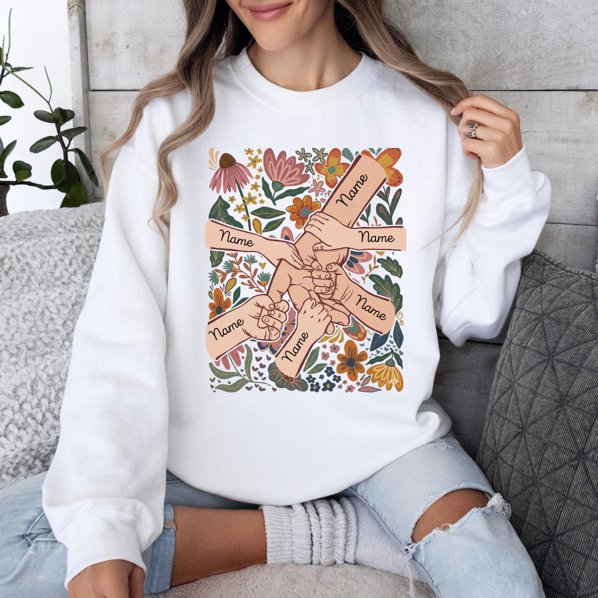Celebrate family love with this meaningful personalized mom design featuring linked hands surrounded by beautiful floral artwork and custom names on each arm.