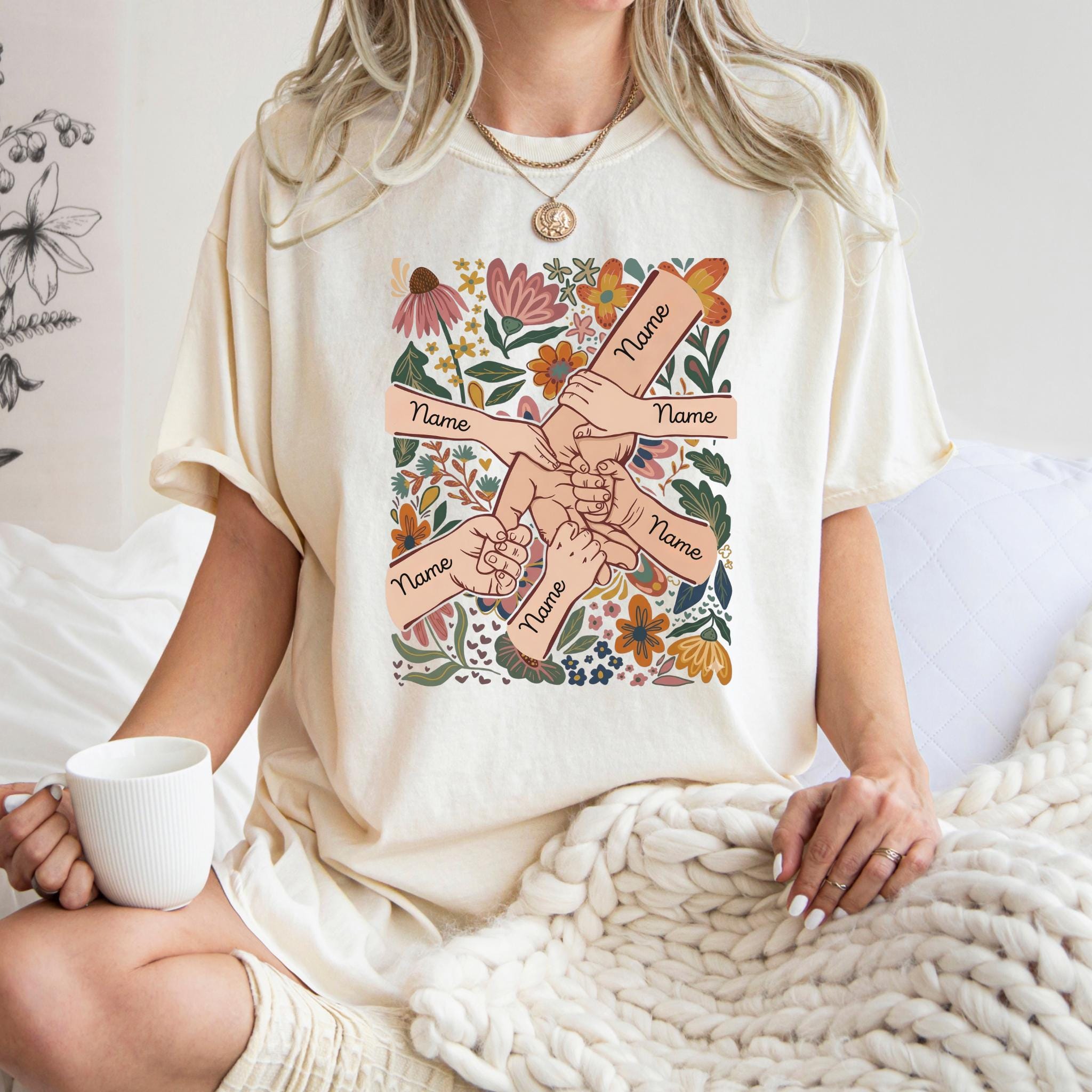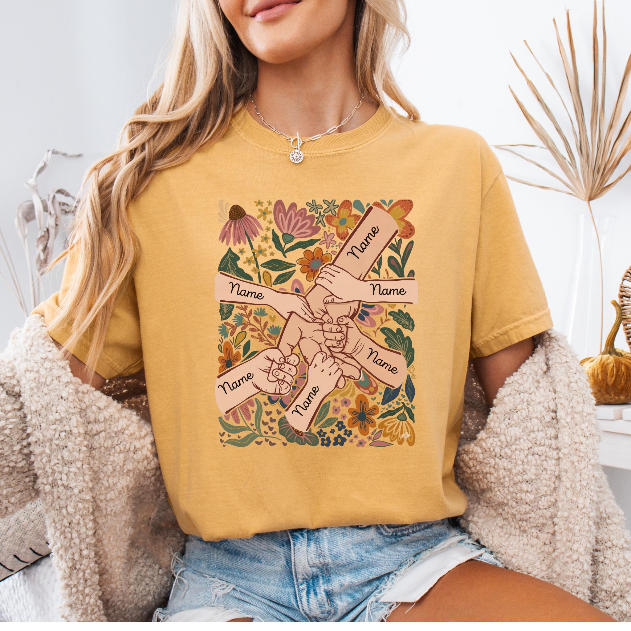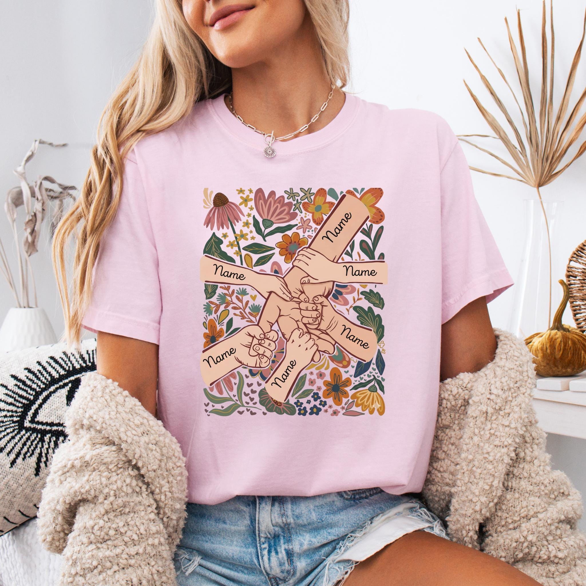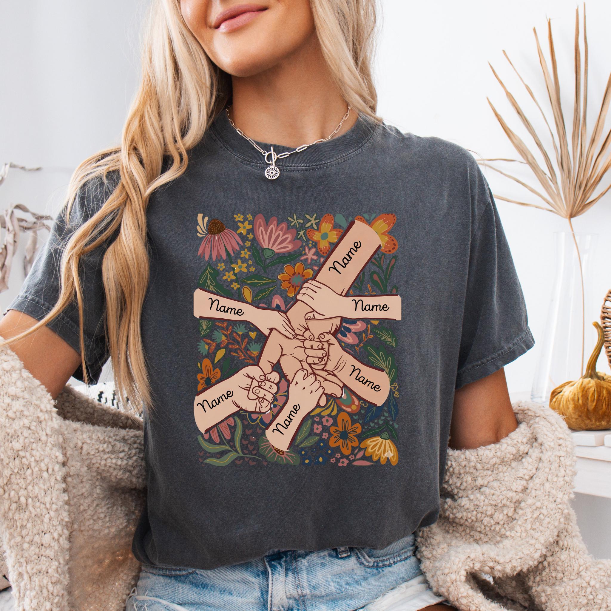 Celebrate family love with this meaningful personalized mom design featuring linked hands surrounded by beautiful floral artwork and custom names on each arm.