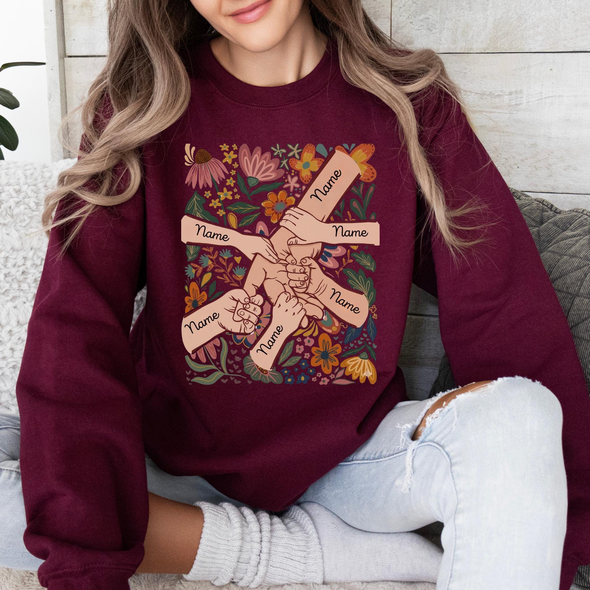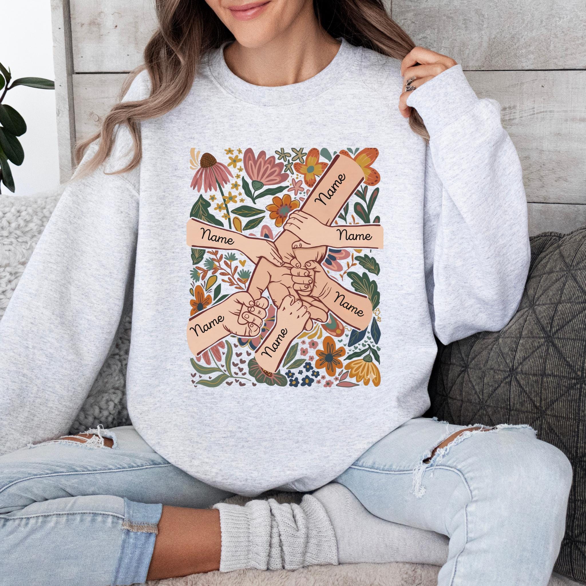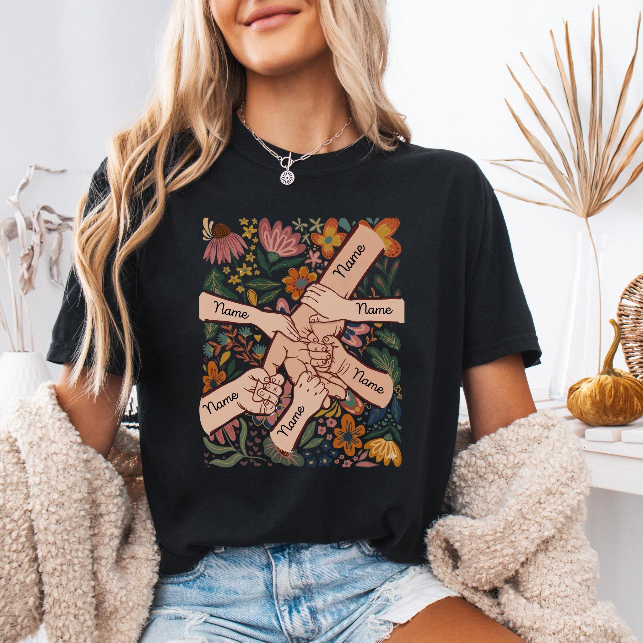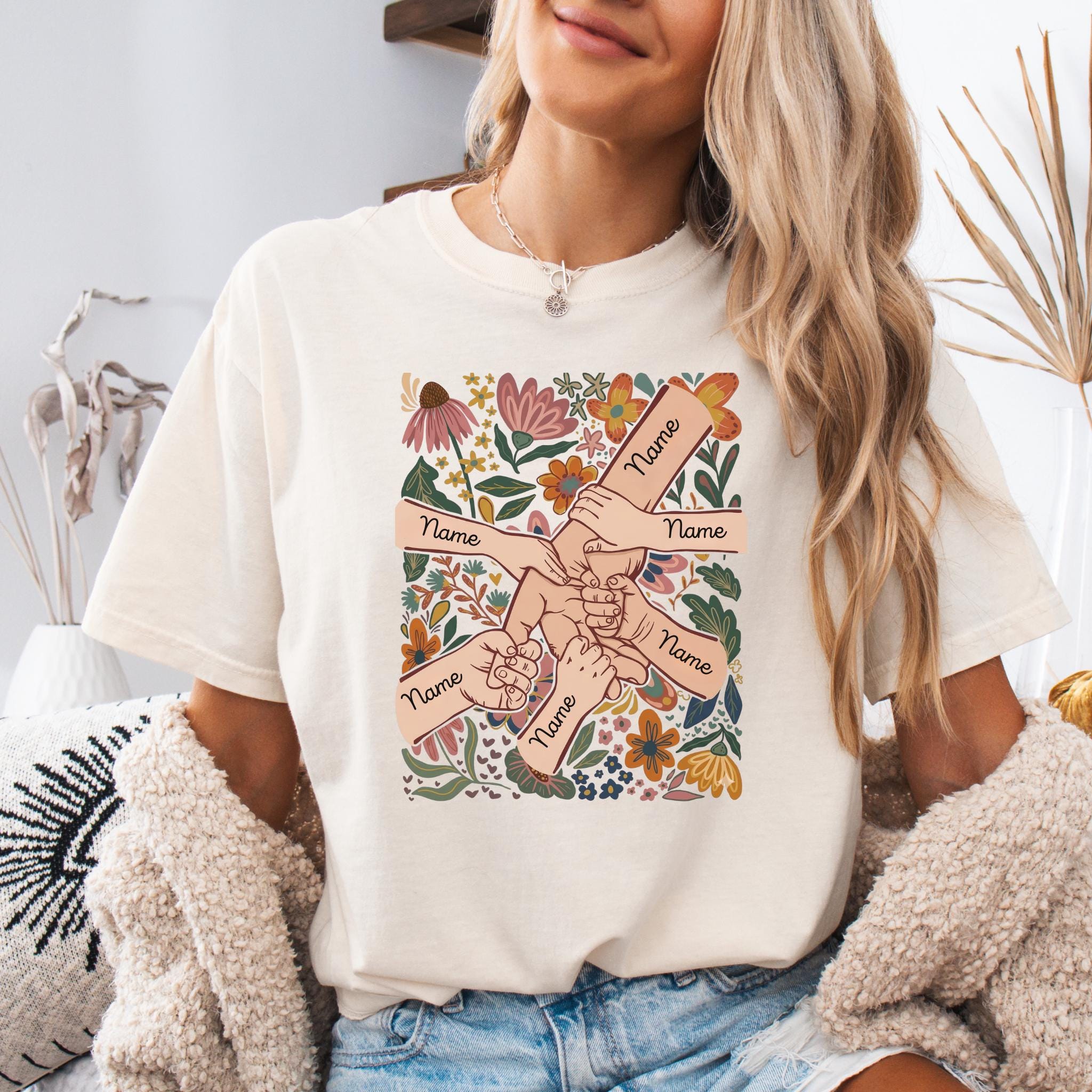Celebrate family love with this meaningful personalized mom design featuring linked hands surrounded by beautiful floral artwork and custom names on each arm.