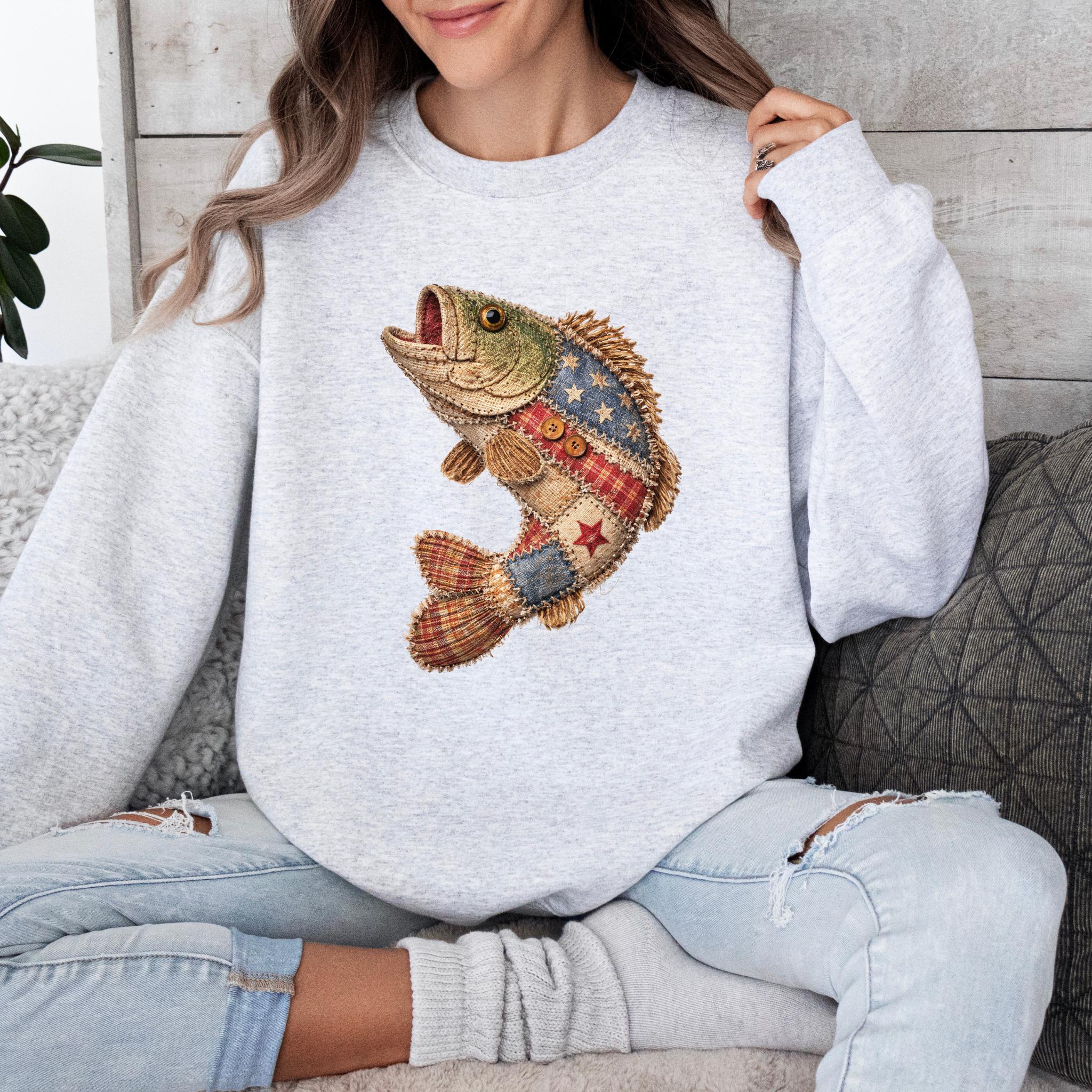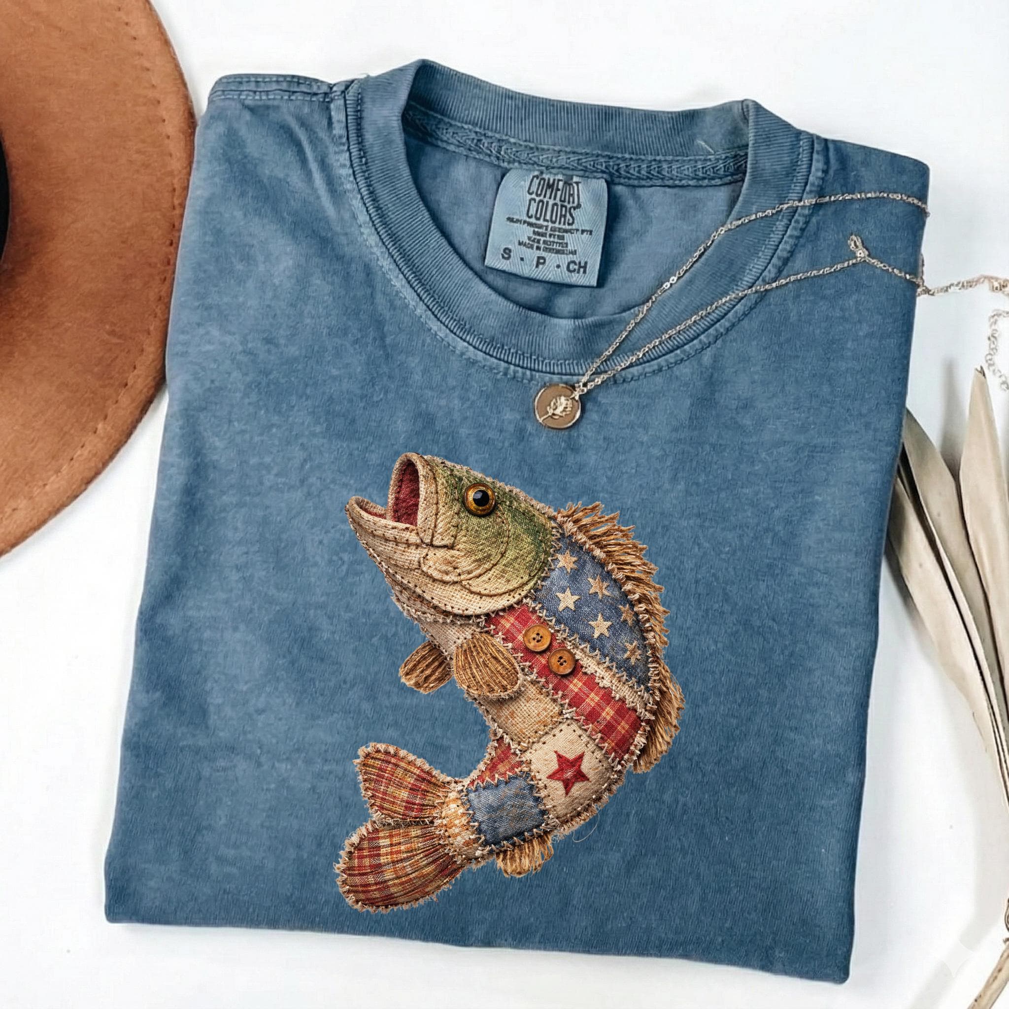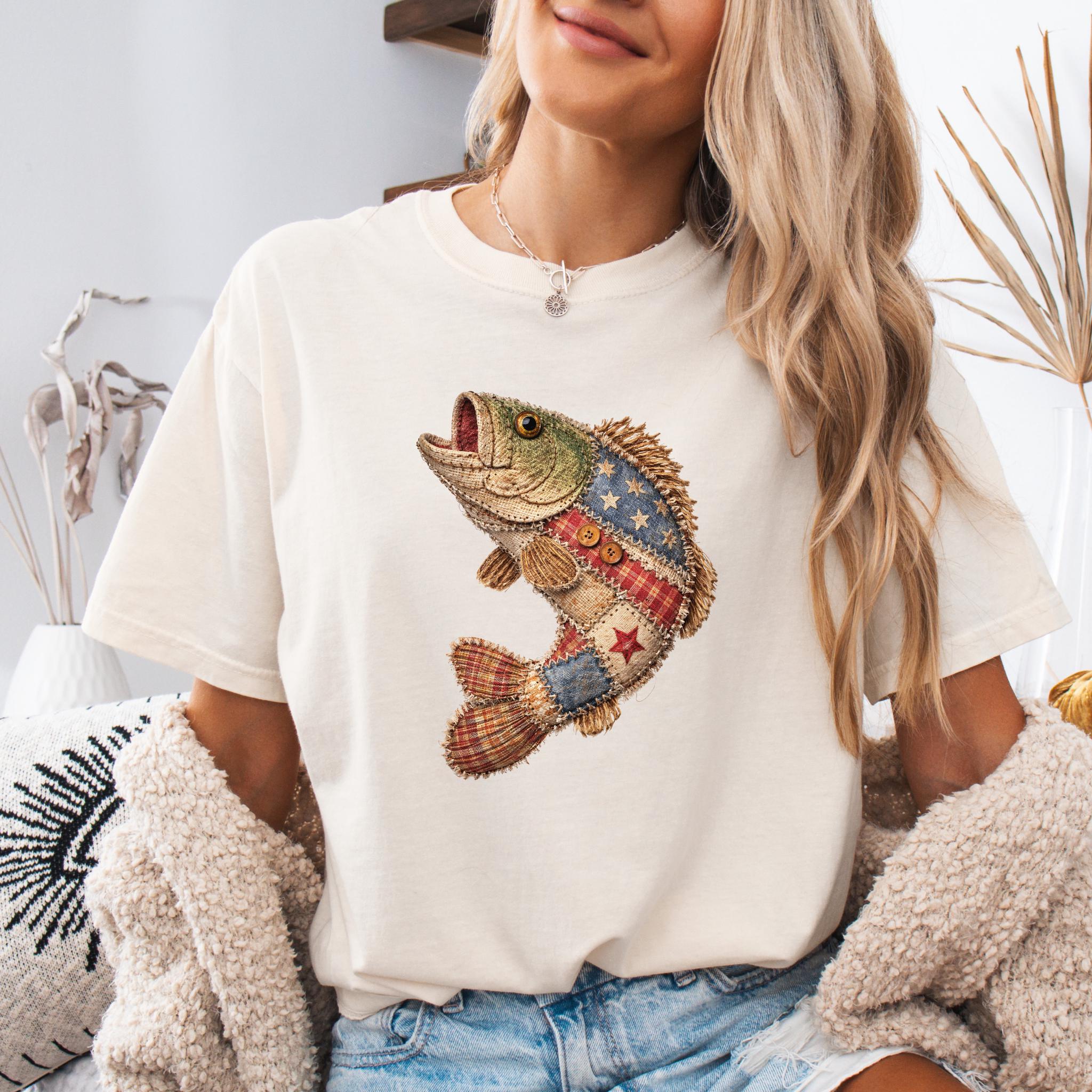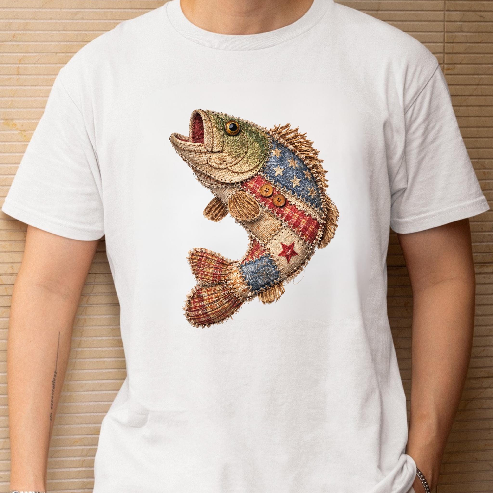 Celebrate American pride and lake life style with this unique patriotic fish design featuring a rustic patchwork fish made with Americana-inspired fabric details, stars, stripes, plaid textures, and handmade-style stitching accents.