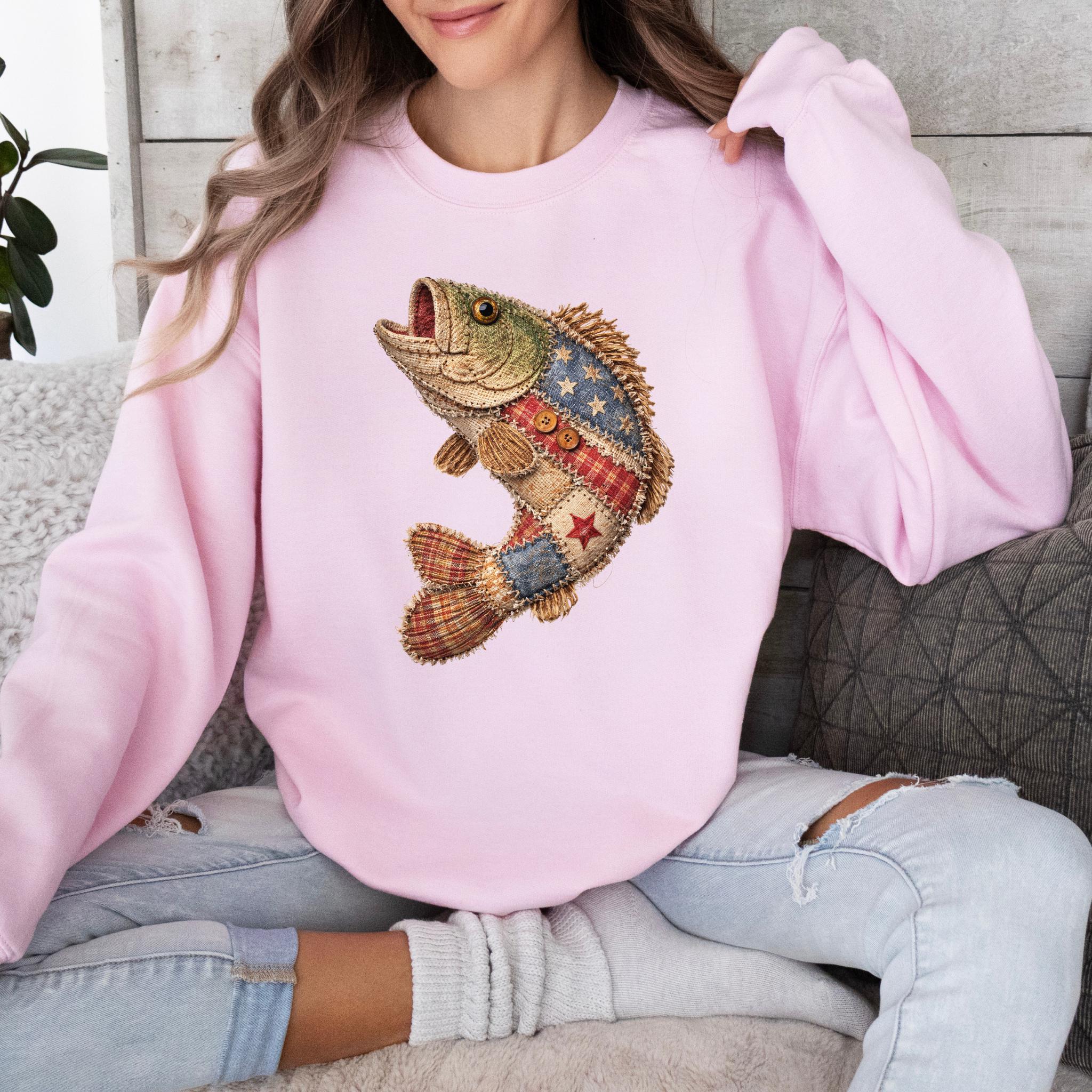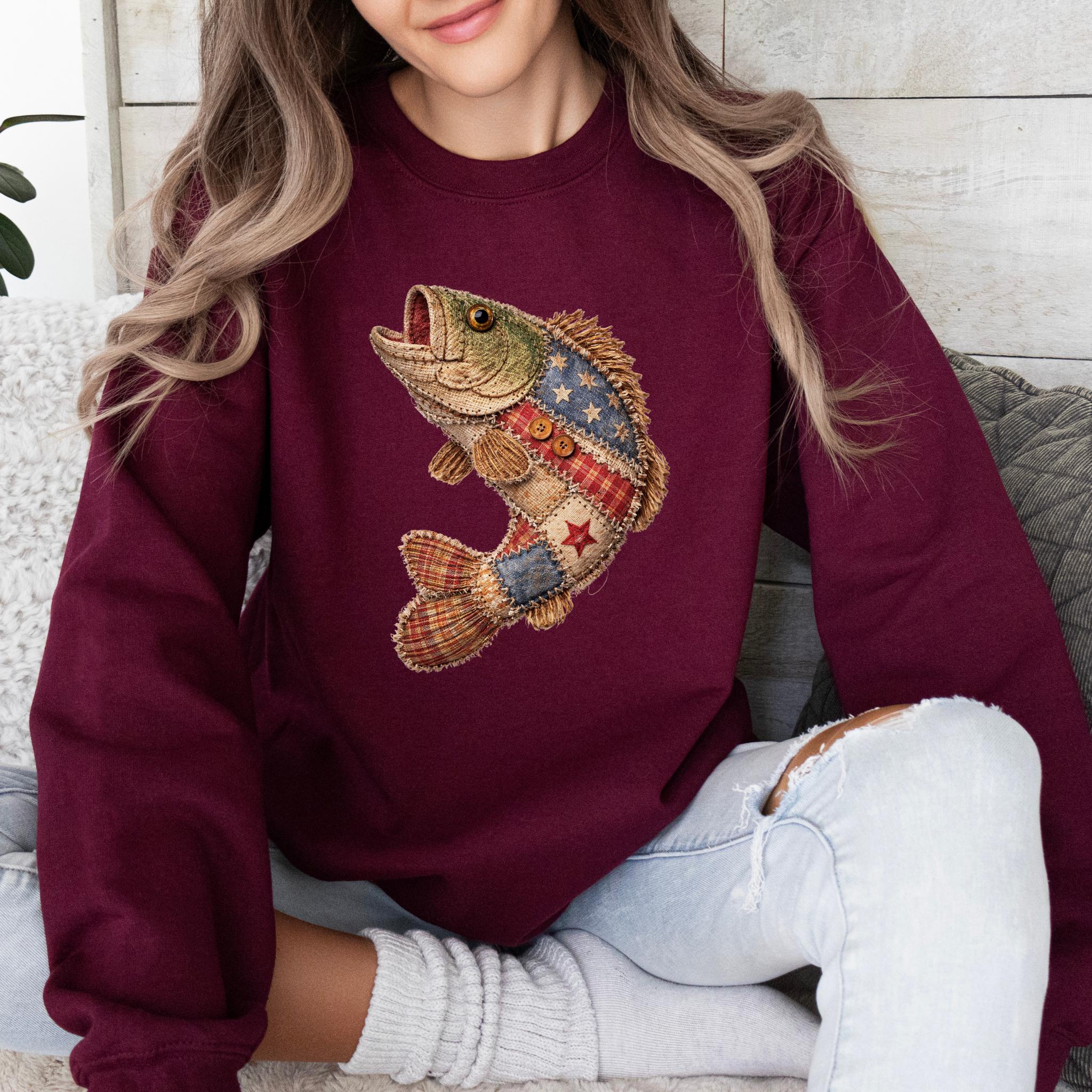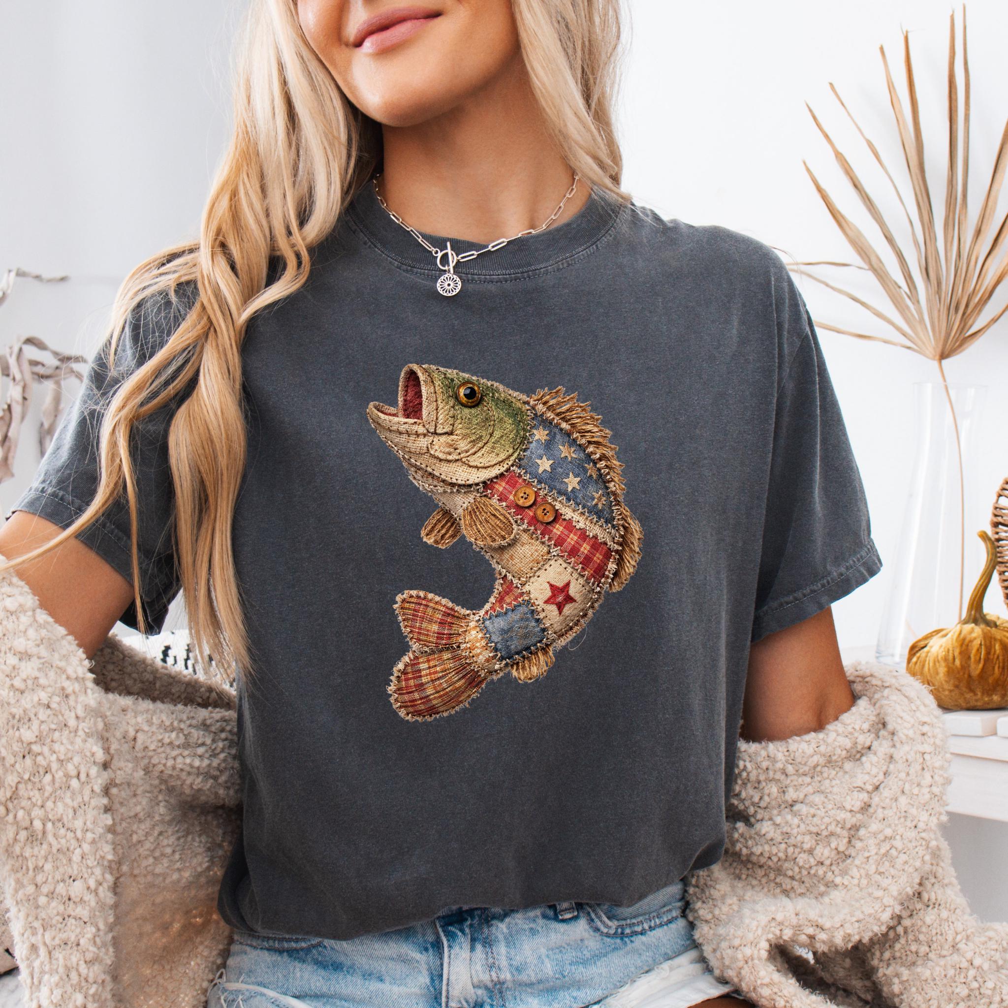 Celebrate American pride and lake life style with this unique patriotic fish design featuring a rustic patchwork fish made with Americana-inspired fabric details, stars, stripes, plaid textures, and handmade-style stitching accents.