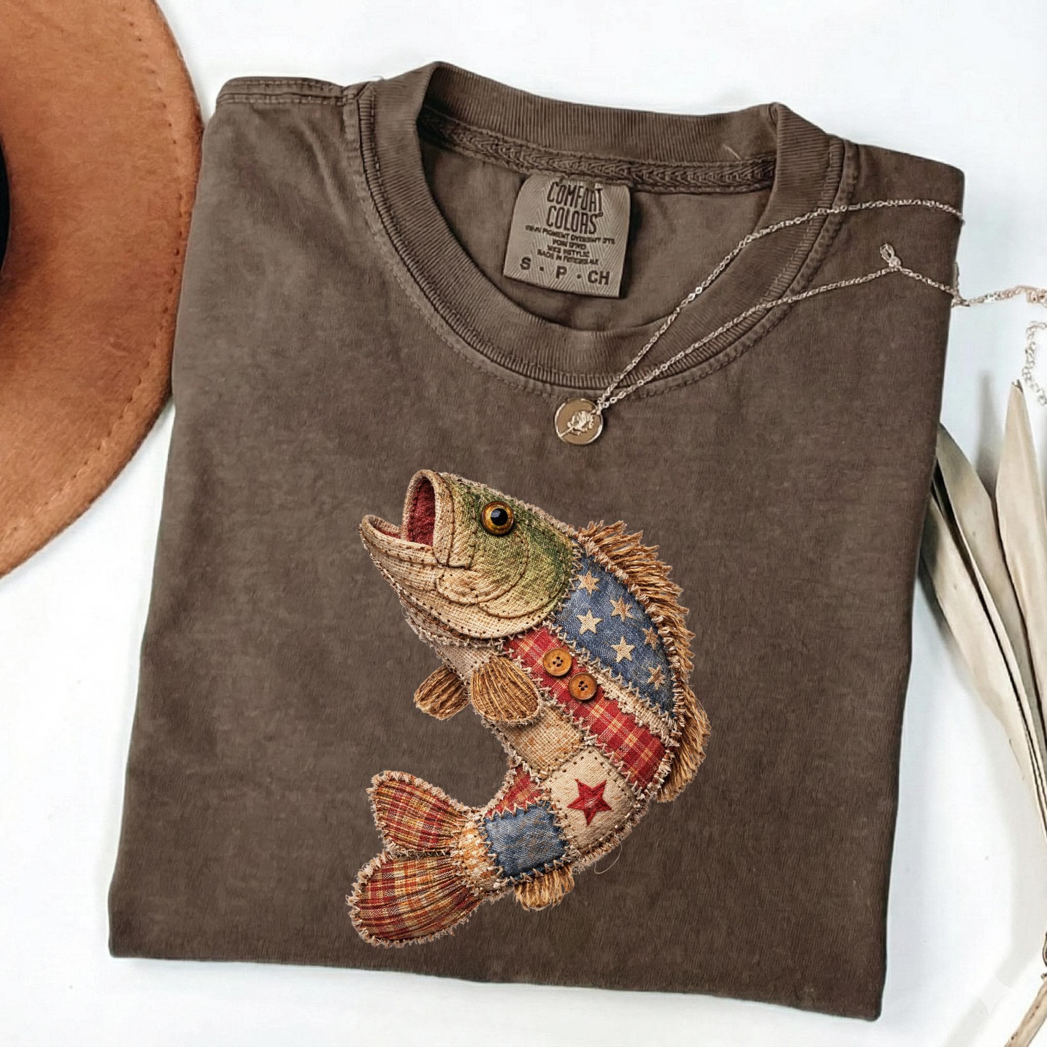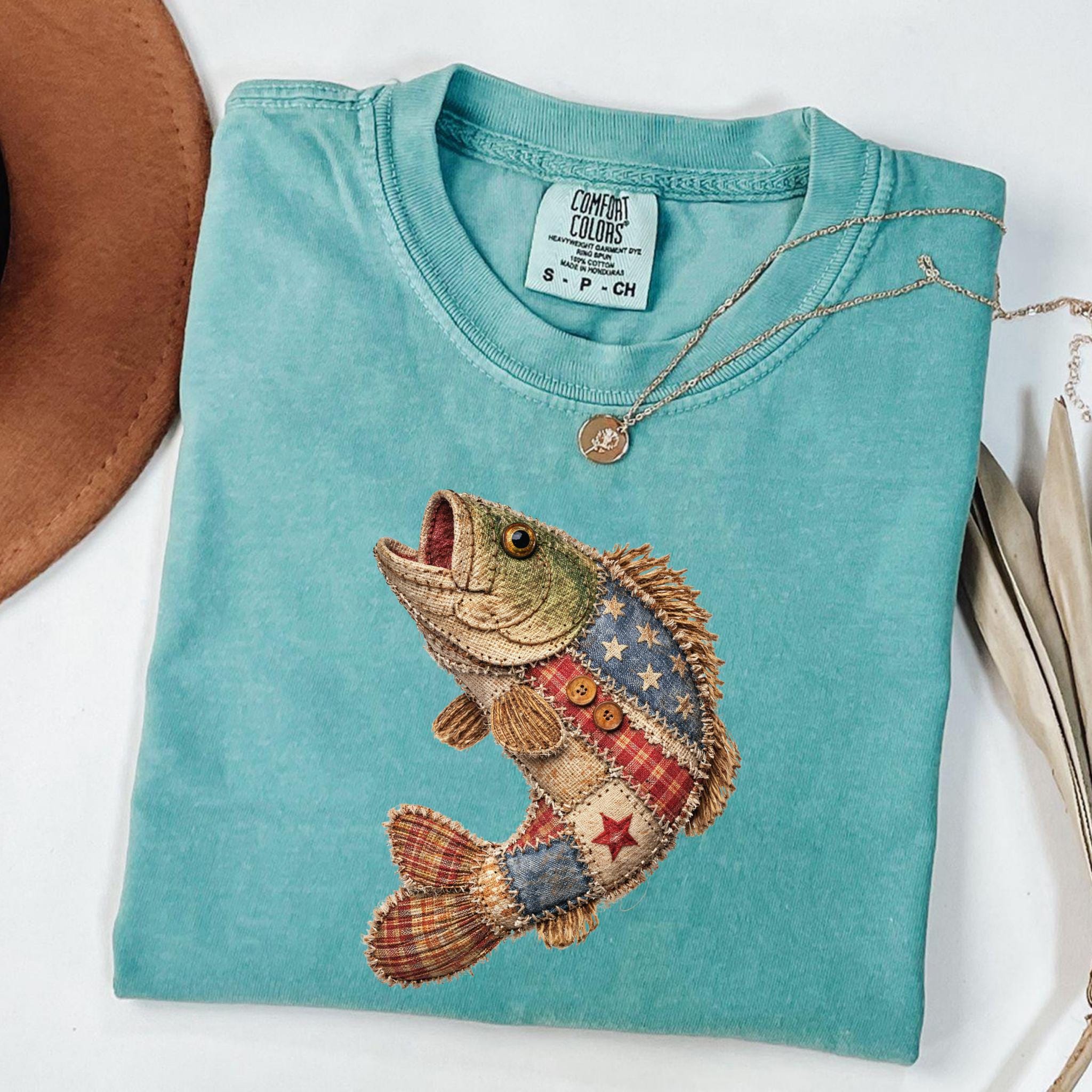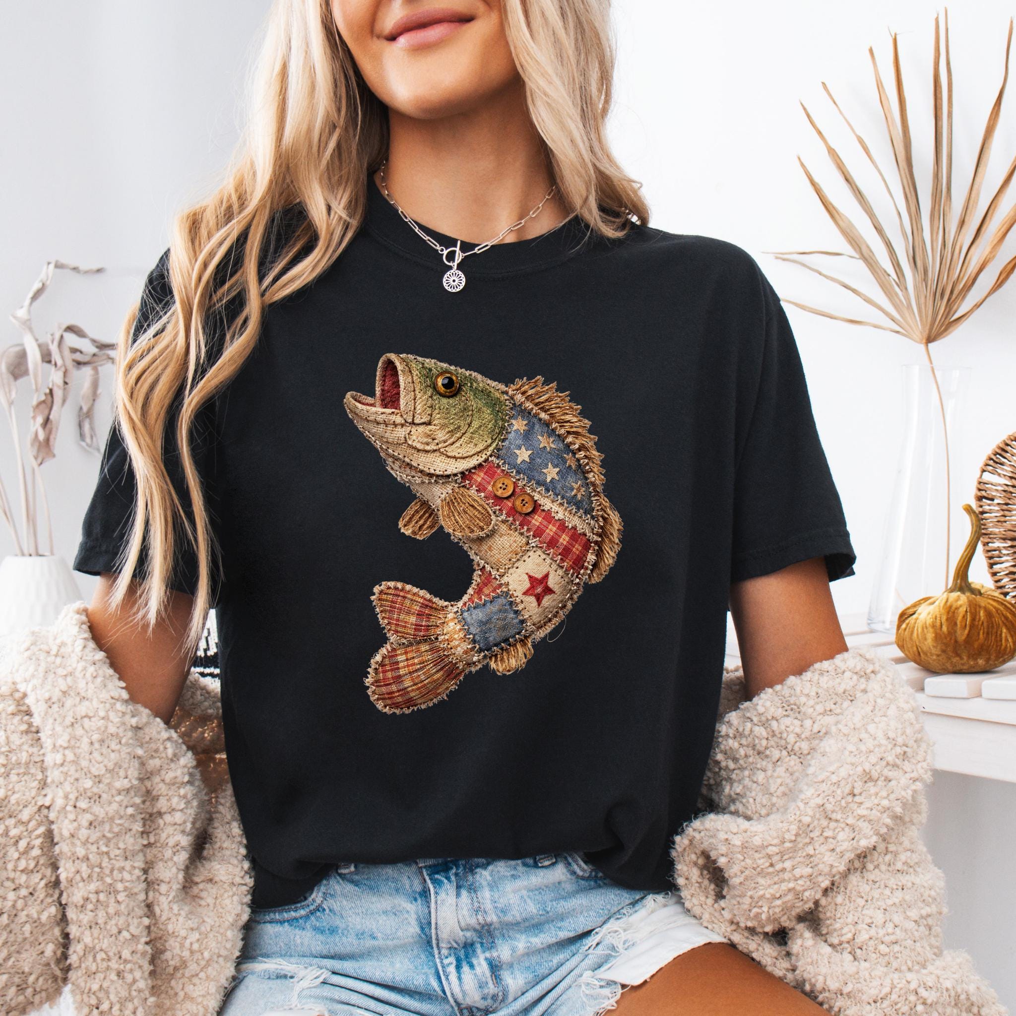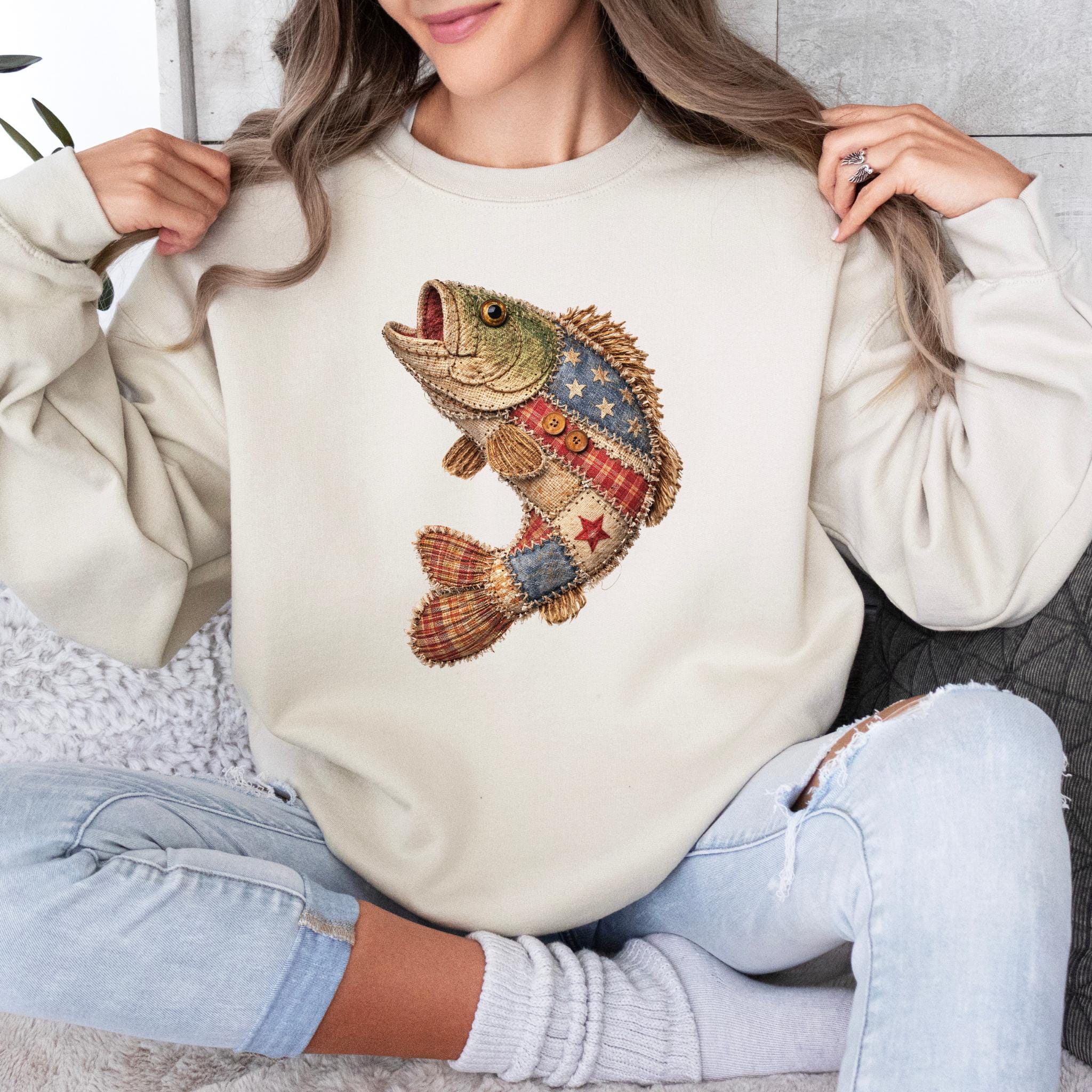 Celebrate American pride and lake life style with this unique patriotic fish design featuring a rustic patchwork fish made with Americana-inspired fabric details, stars, stripes, plaid textures, and handmade-style stitching accents.