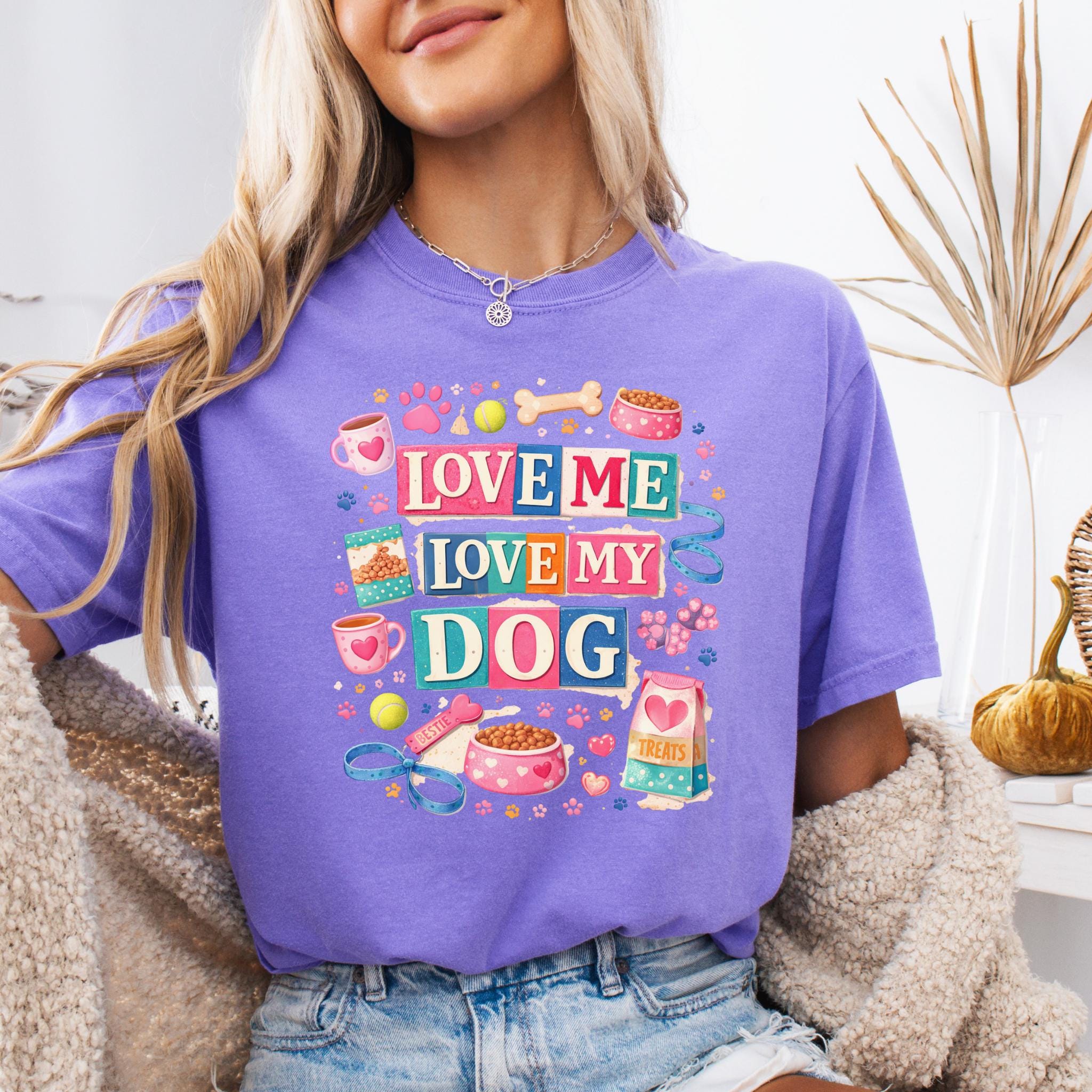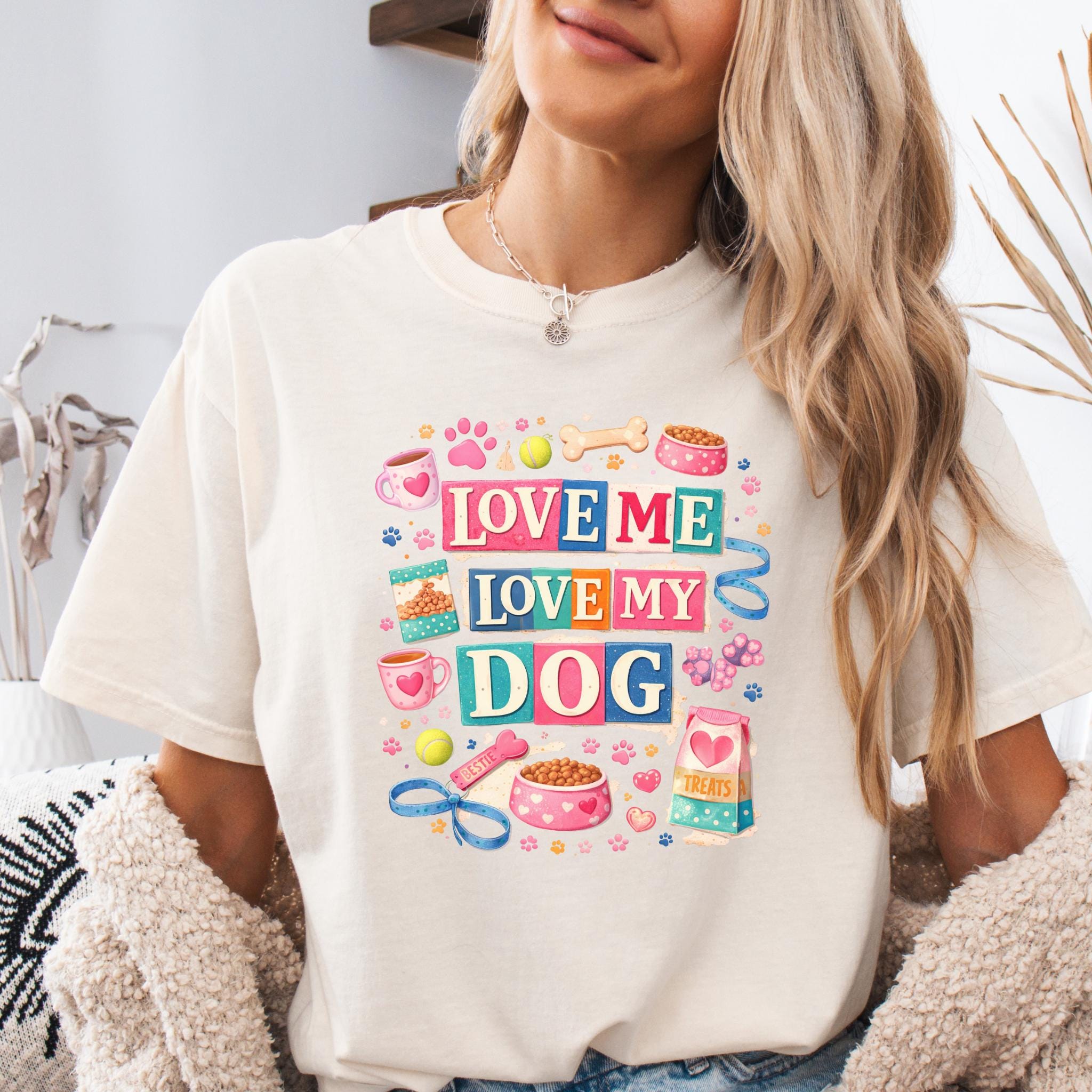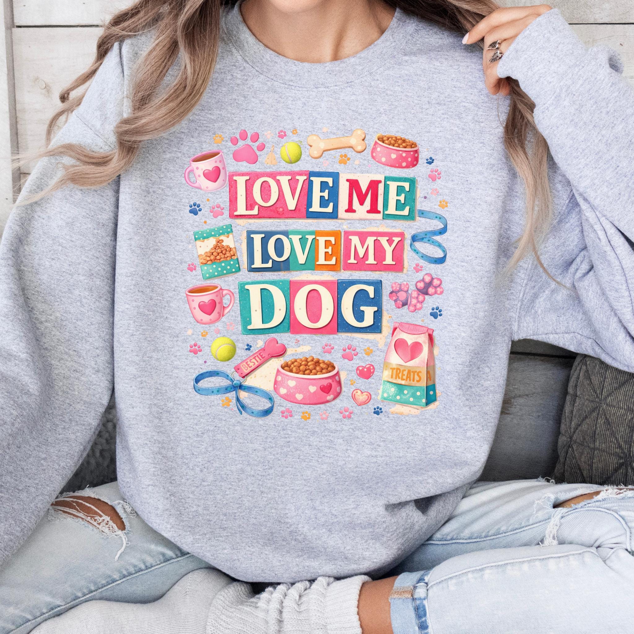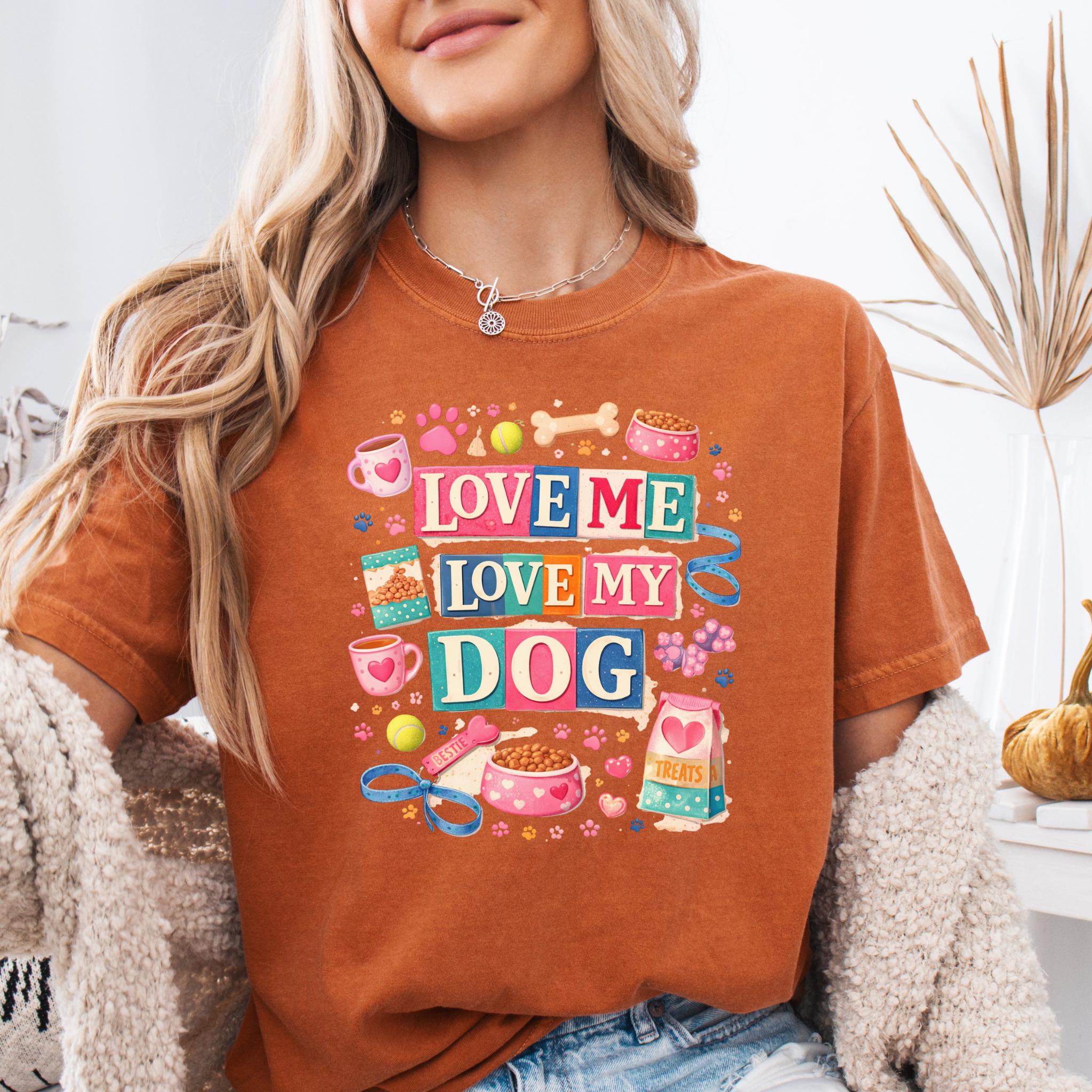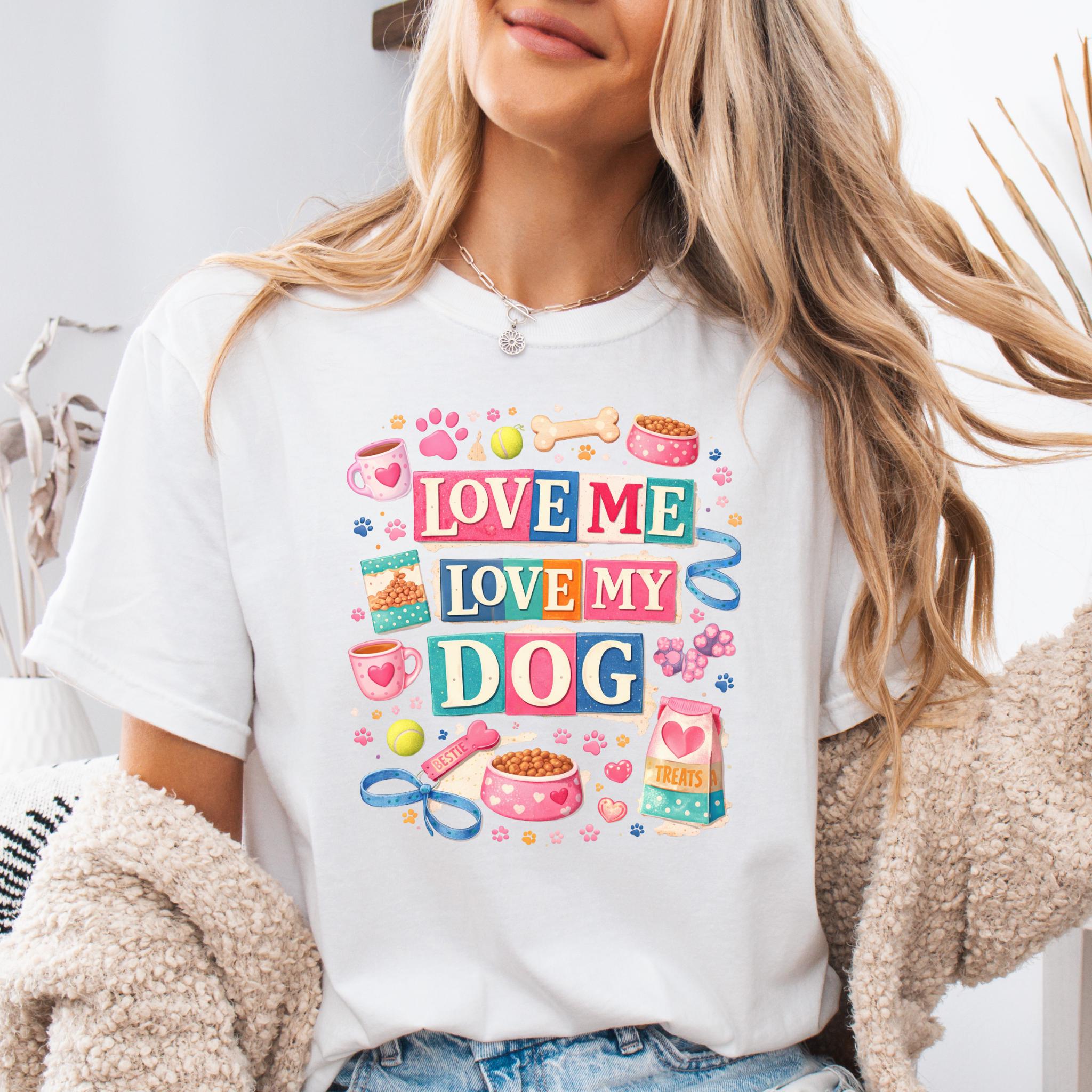 Show off your love for your furry best friend with this fun and colorful “Love Me Love My Dog” design. Featuring playful typography and adorable dog-themed elements like paw prints, treats, bowls, and toys, this design is perfect for proud dog moms and pet lovers.