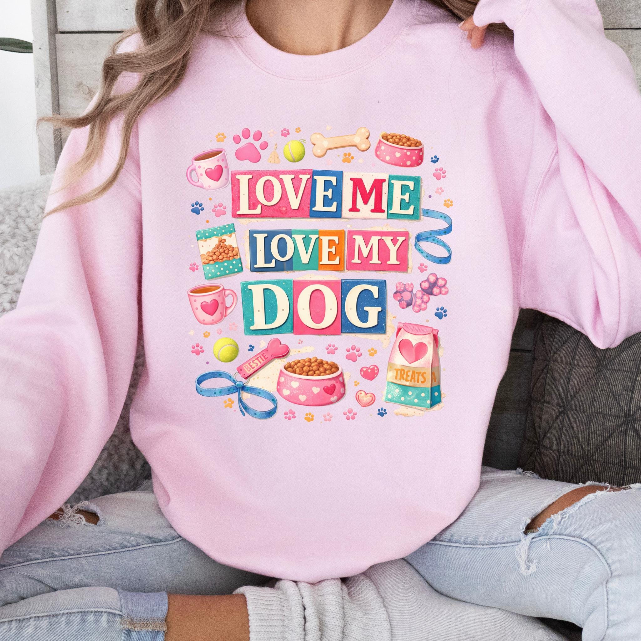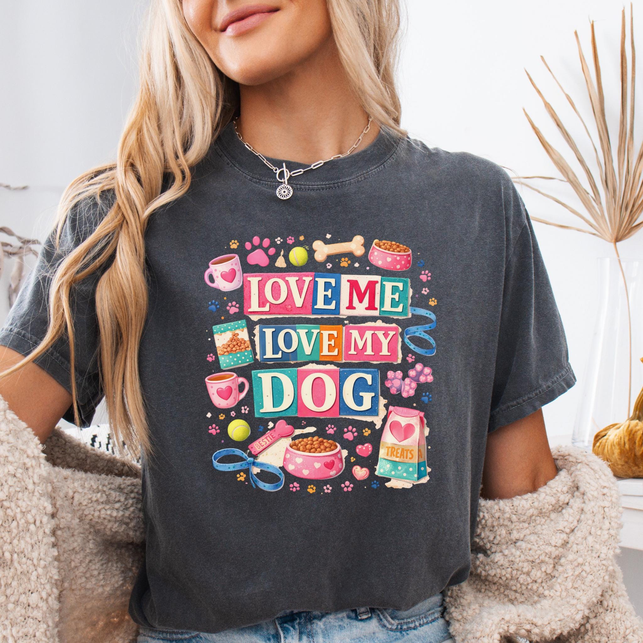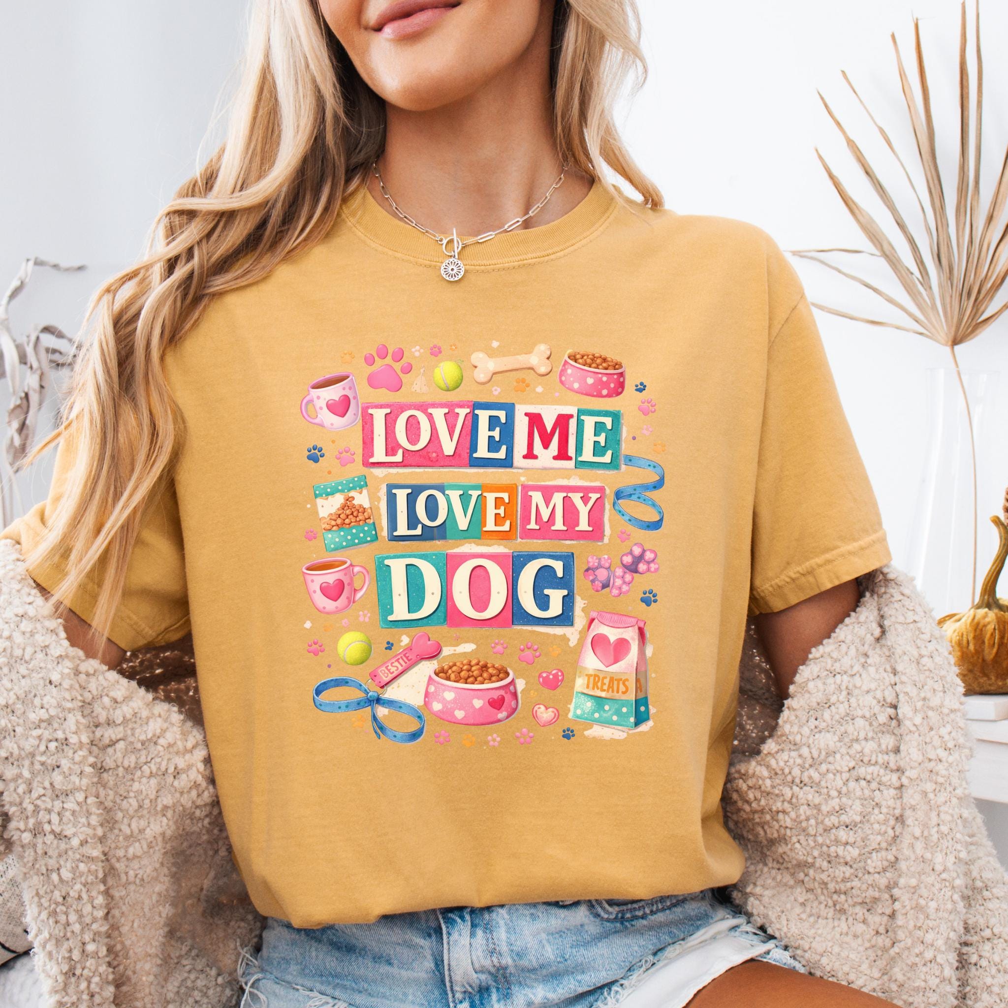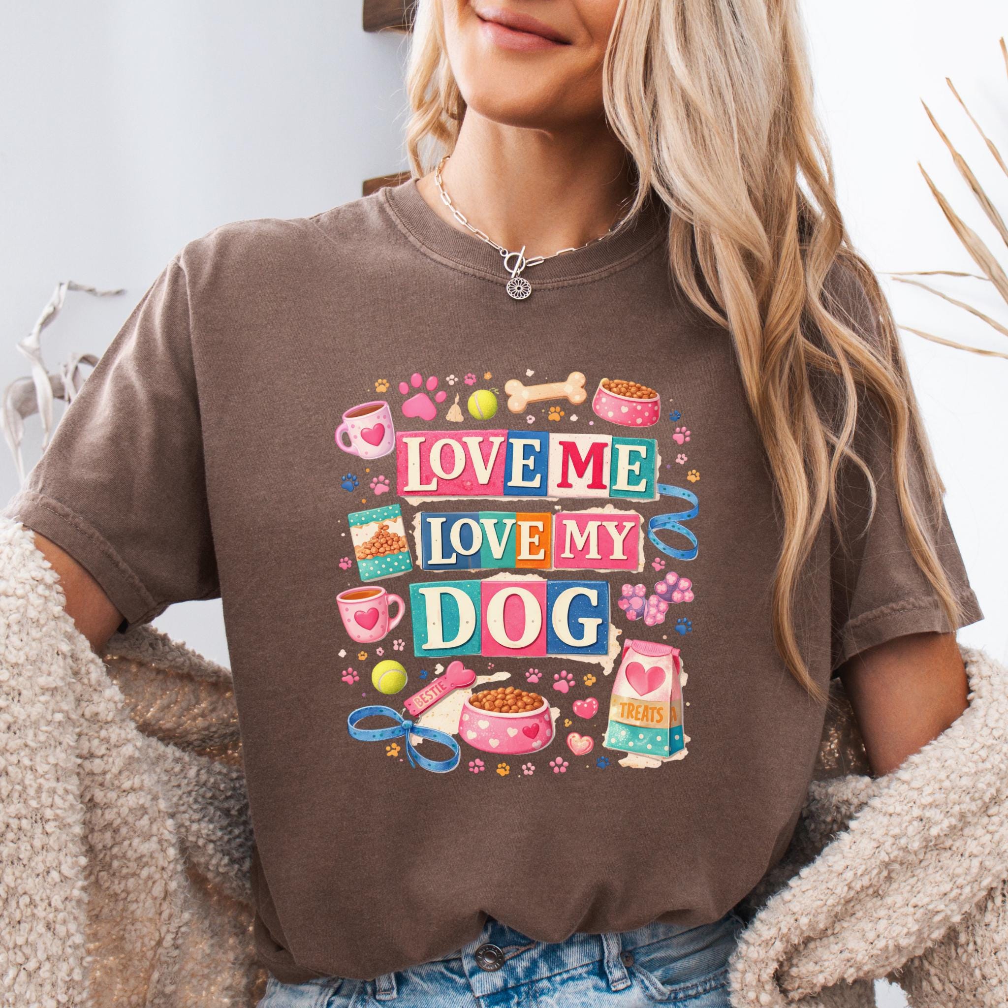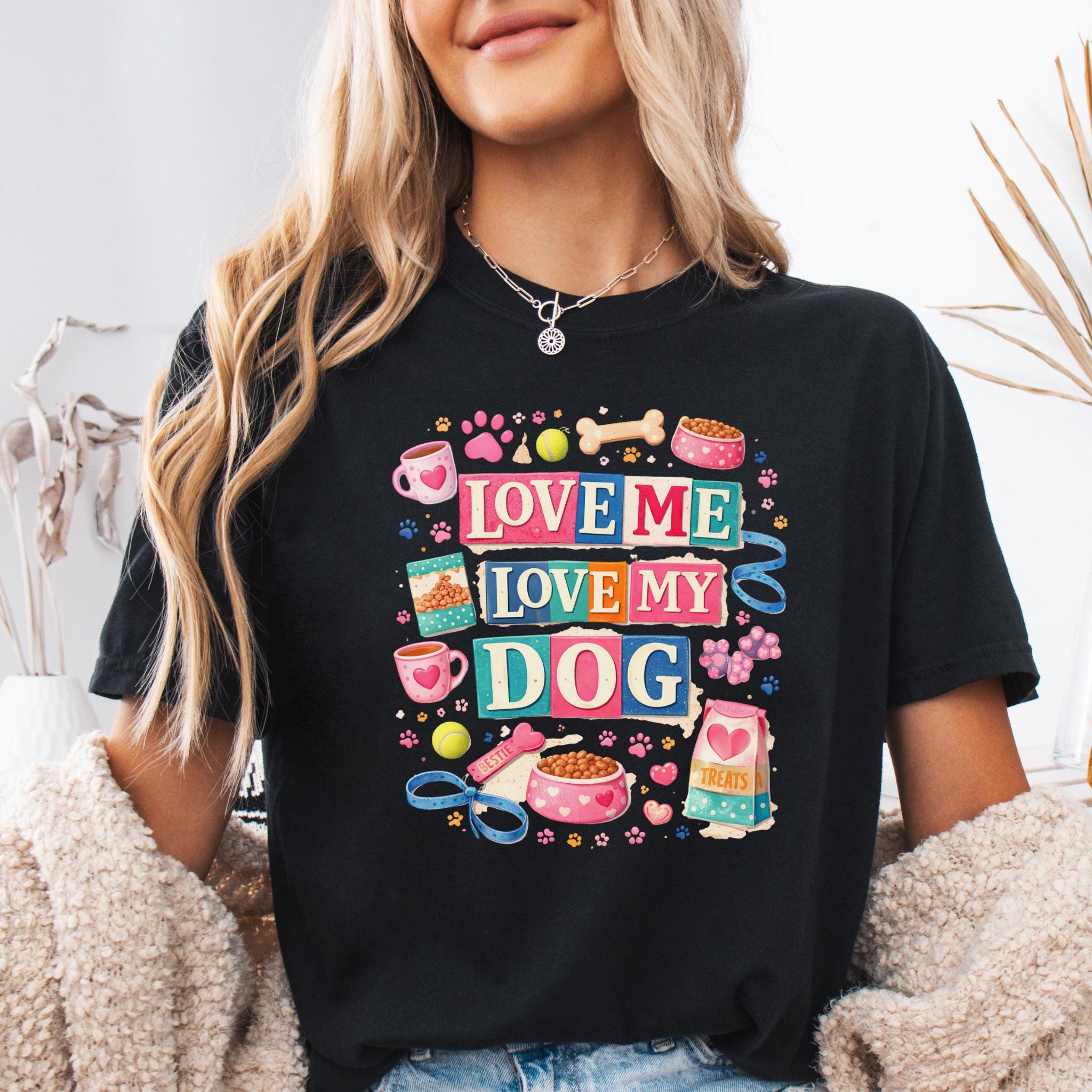 Show off your love for your furry best friend with this fun and colorful “Love Me Love My Dog” design. Featuring playful typography and adorable dog-themed elements like paw prints, treats, bowls, and toys, this design is perfect for proud dog moms and pet lovers.