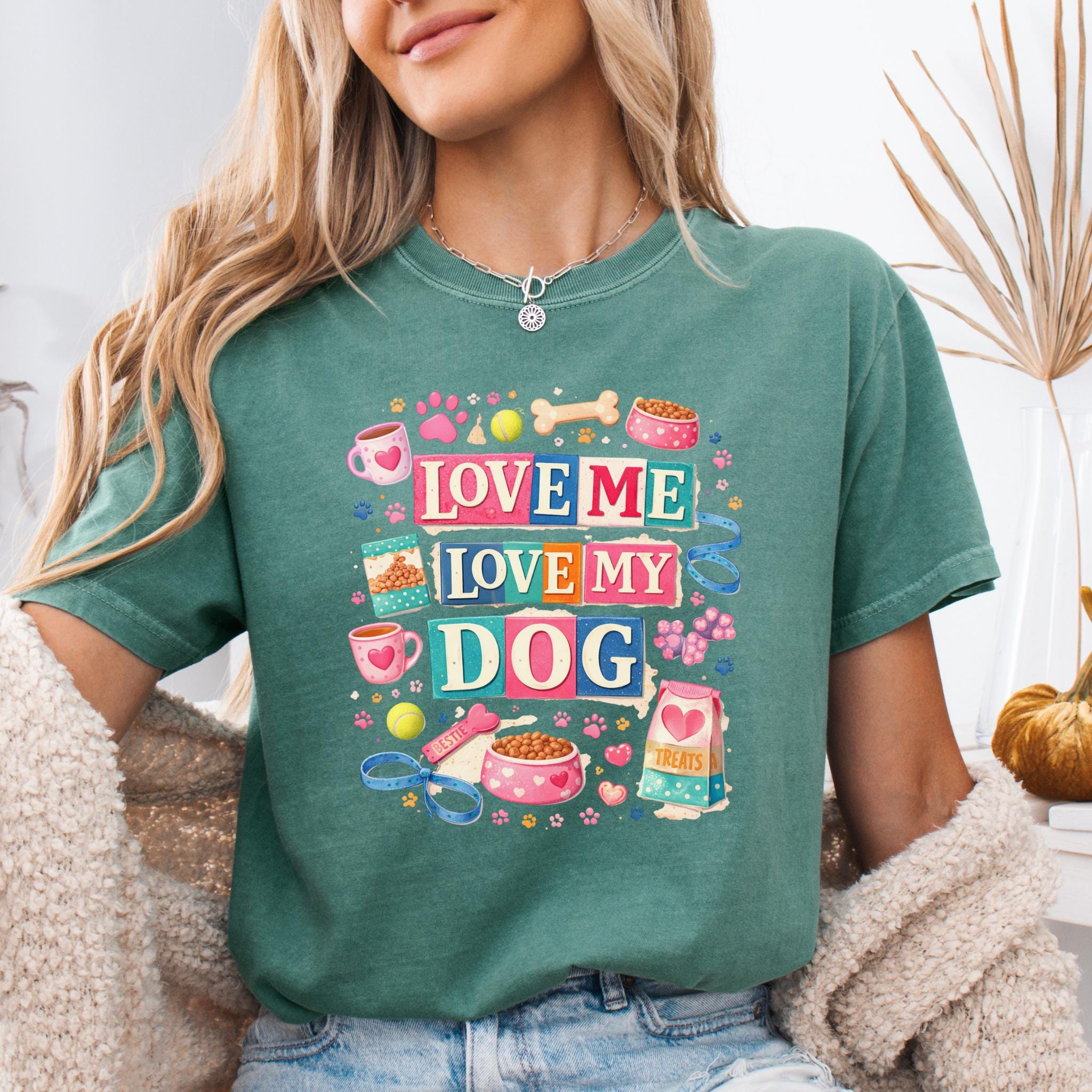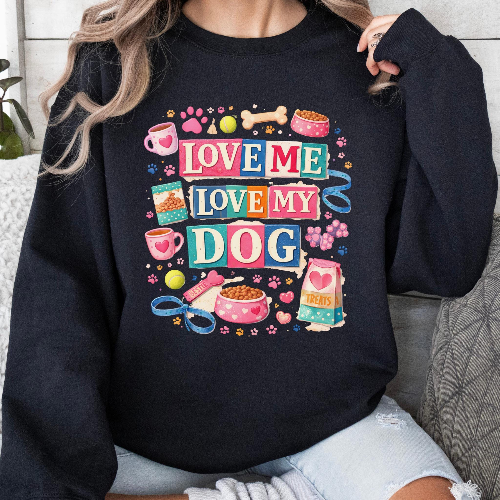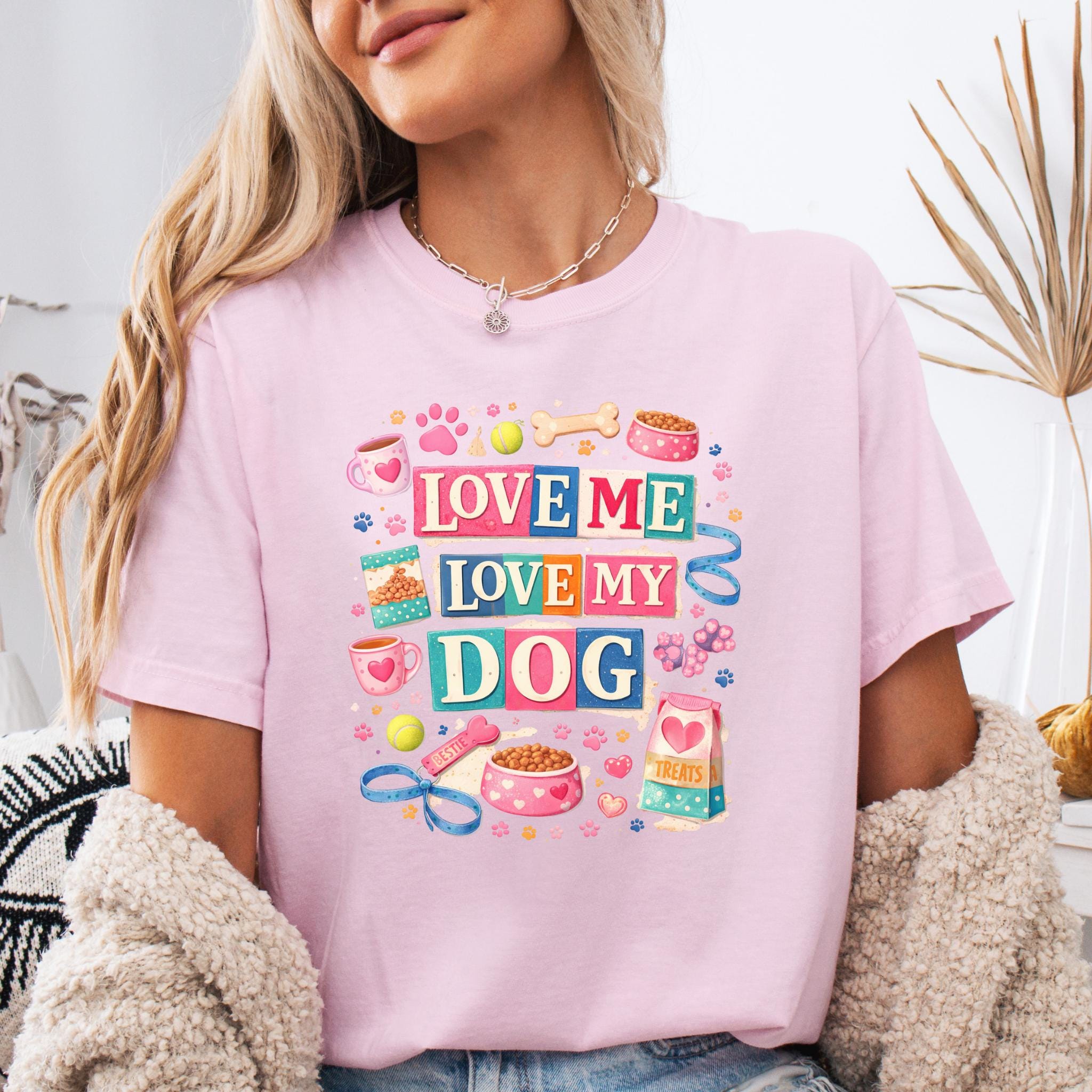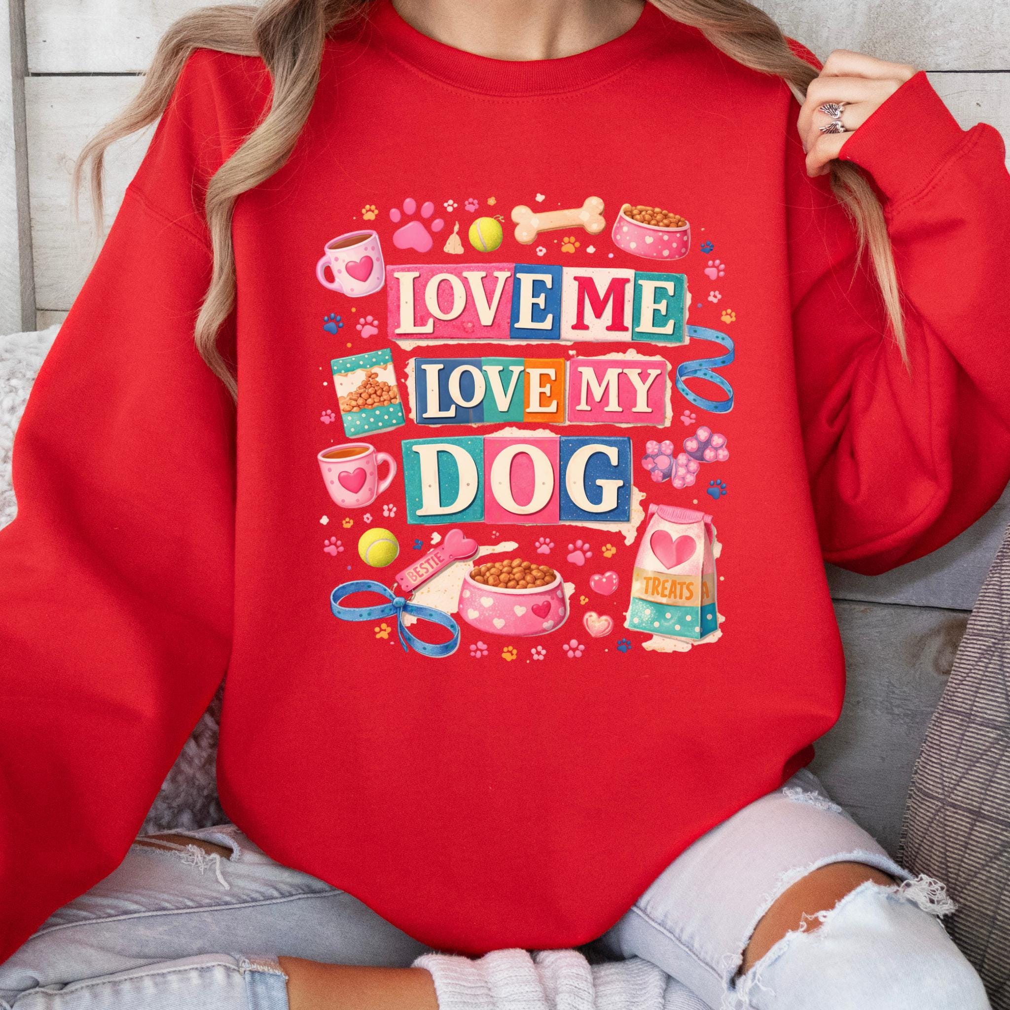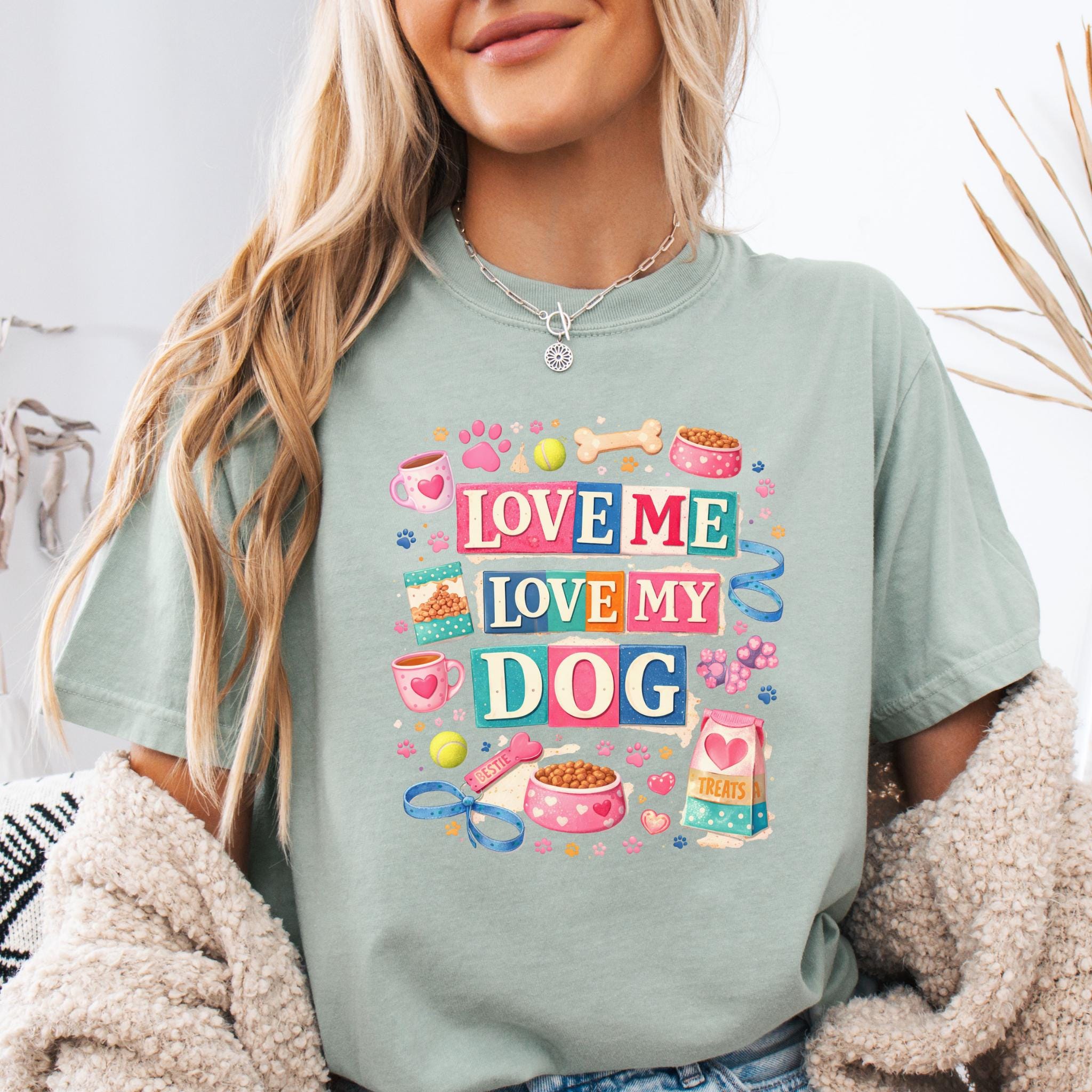Show off your love for your furry best friend with this fun and colorful “Love Me Love My Dog” design. Featuring playful typography and adorable dog-themed elements like paw prints, treats, bowls, and toys, this design is perfect for proud dog moms and pet lovers.