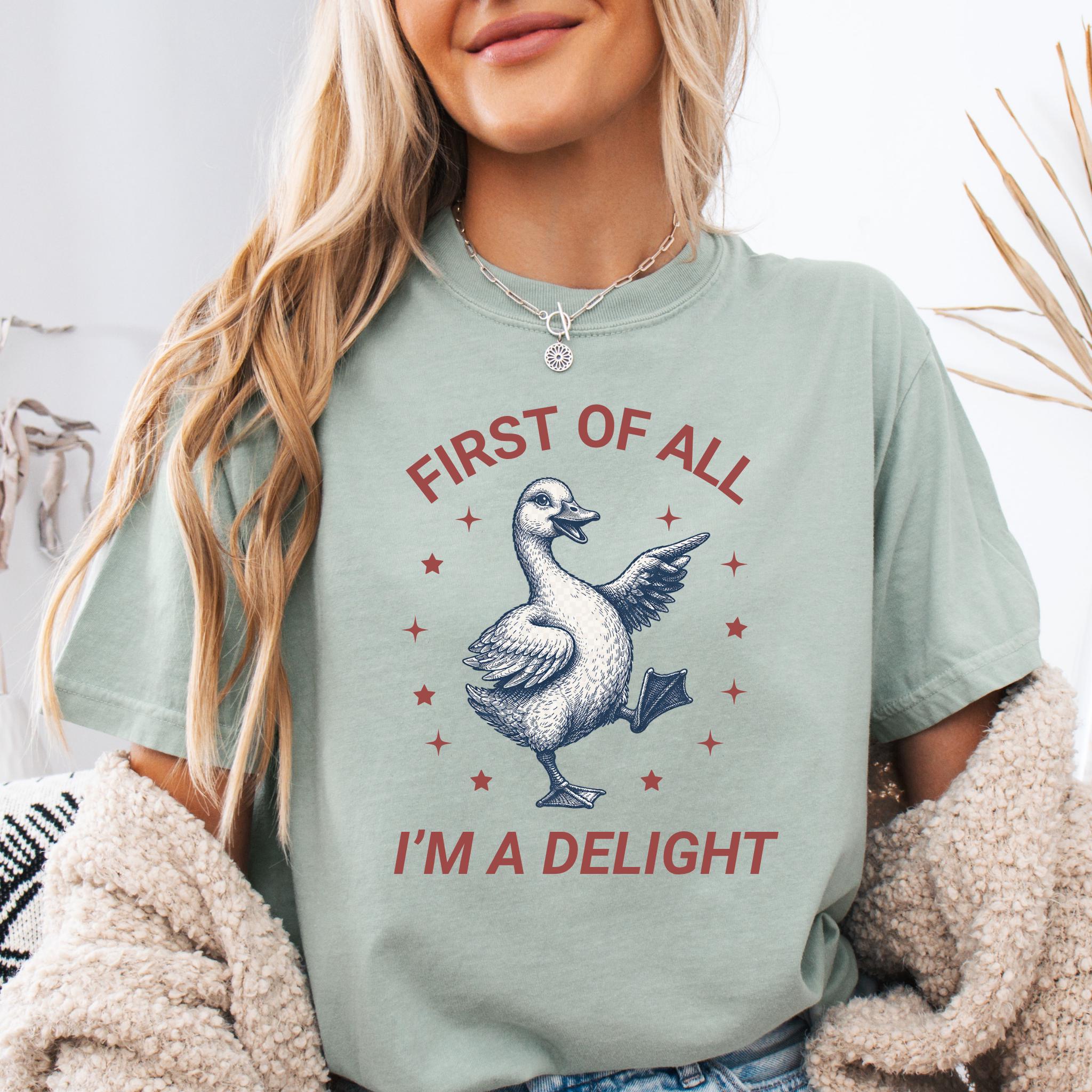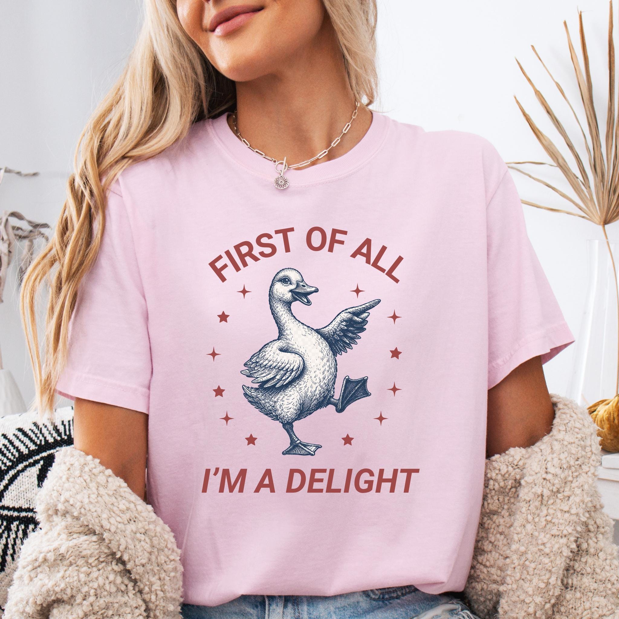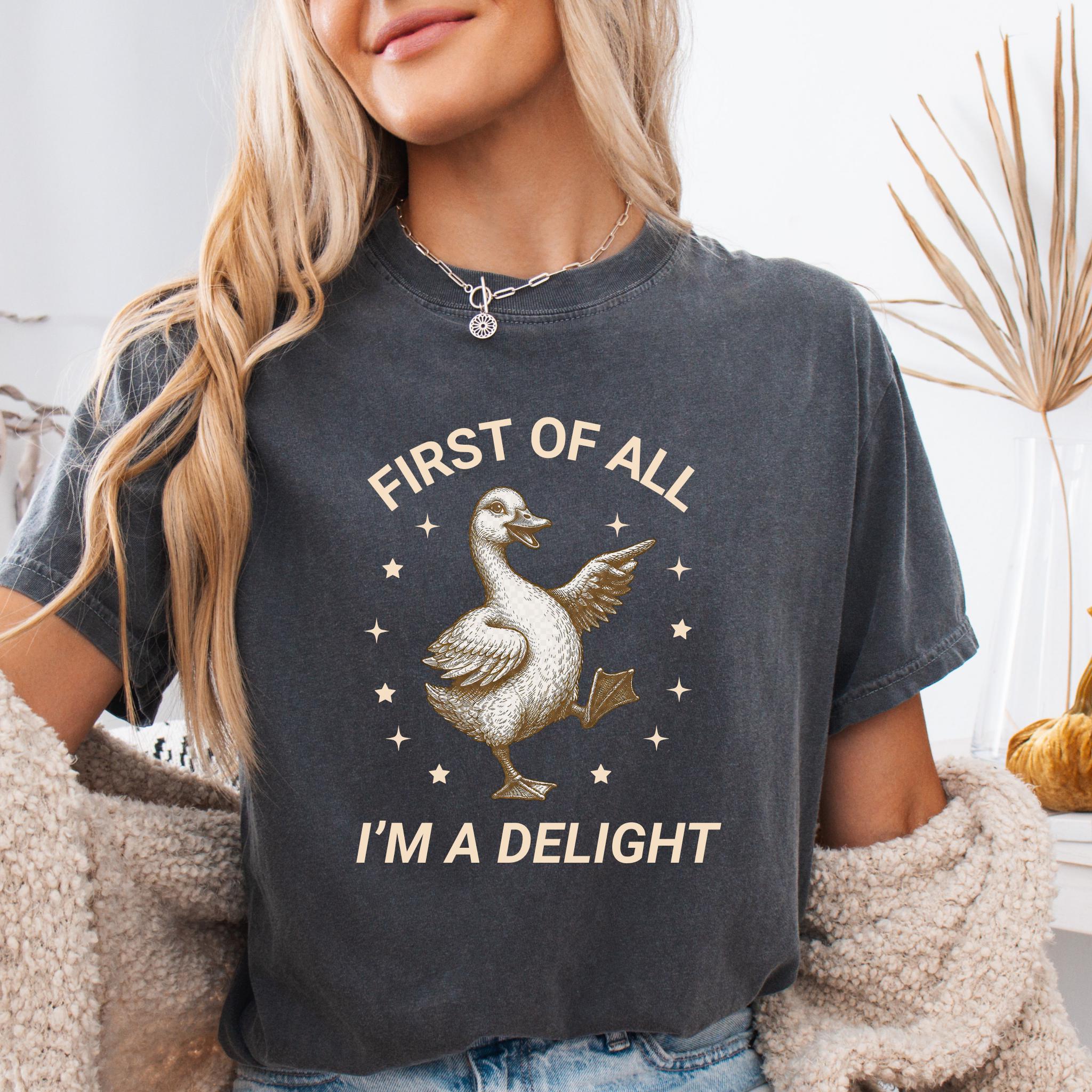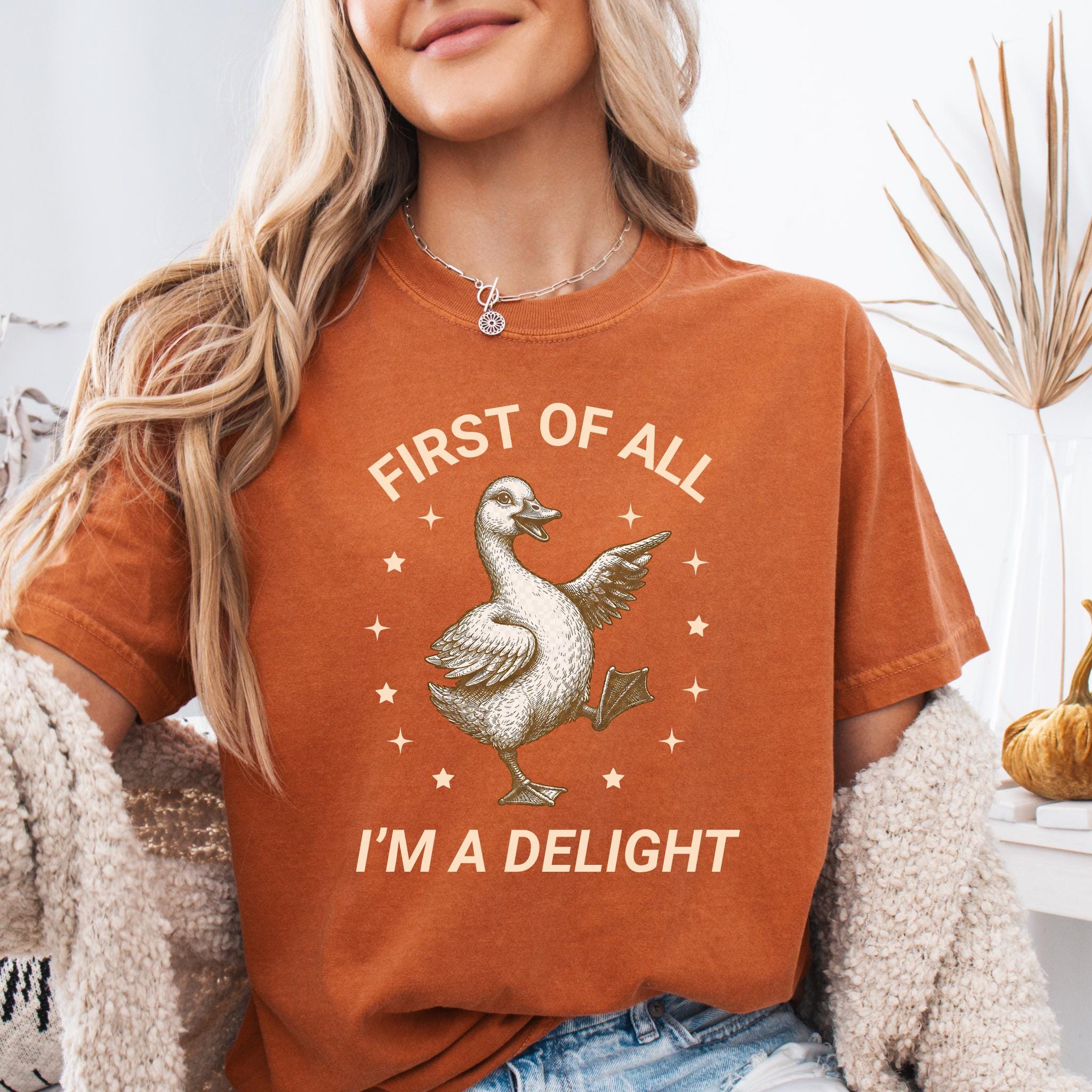 Show off your quirky side with this cozy tee featuring a charming goose and the witty phrase “First of All, I’m a Delight.” Crafted from soft cotton and printed with oversized typography for maximum impact, it’s a perfect reminder to celebrate yourself or gift to a friend who loves humor and self‑love.