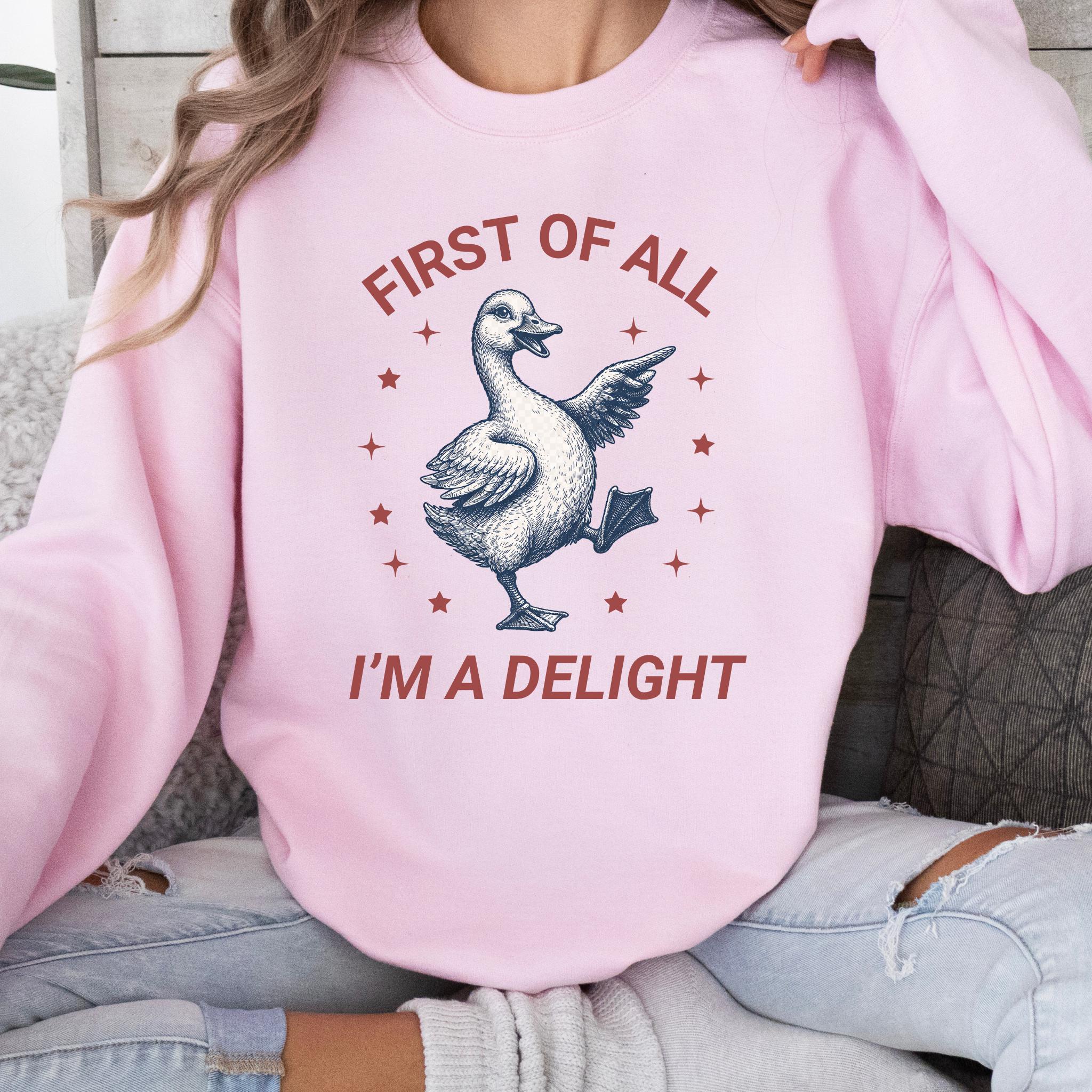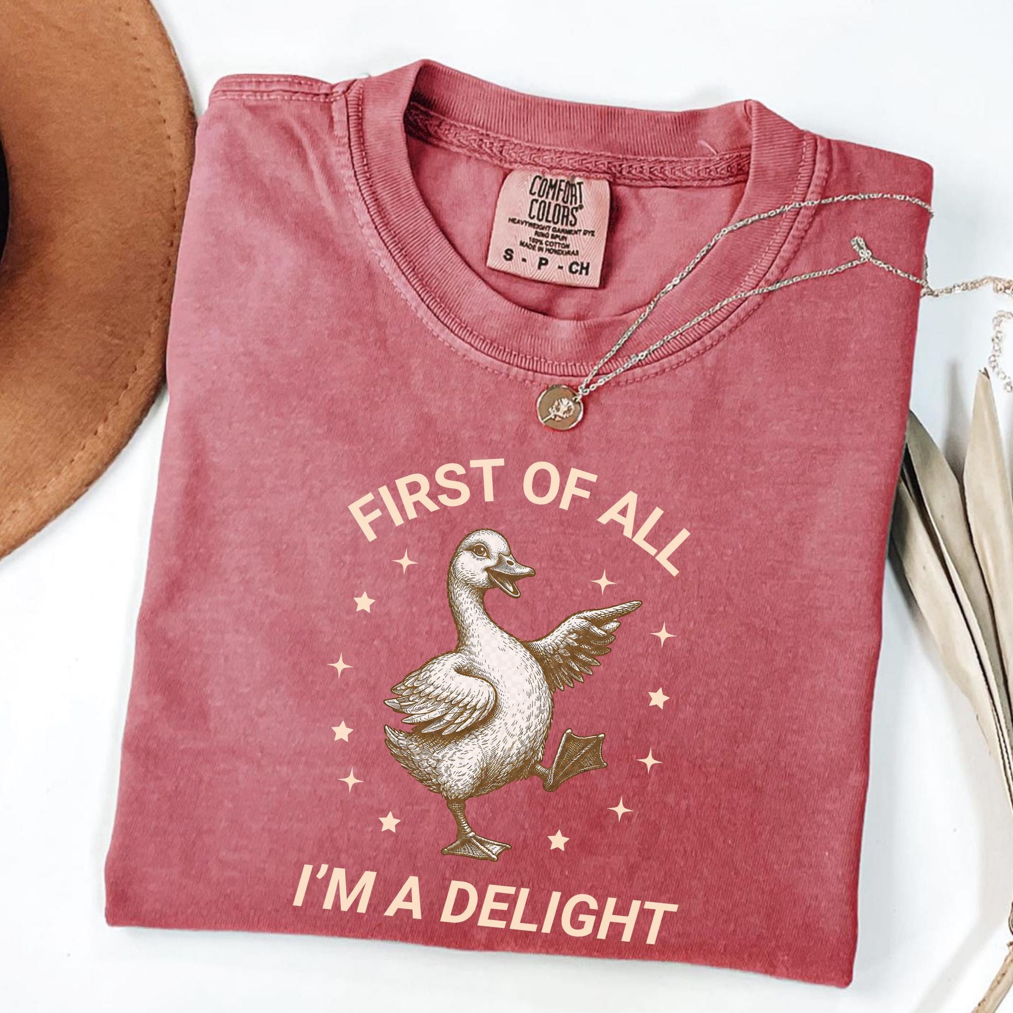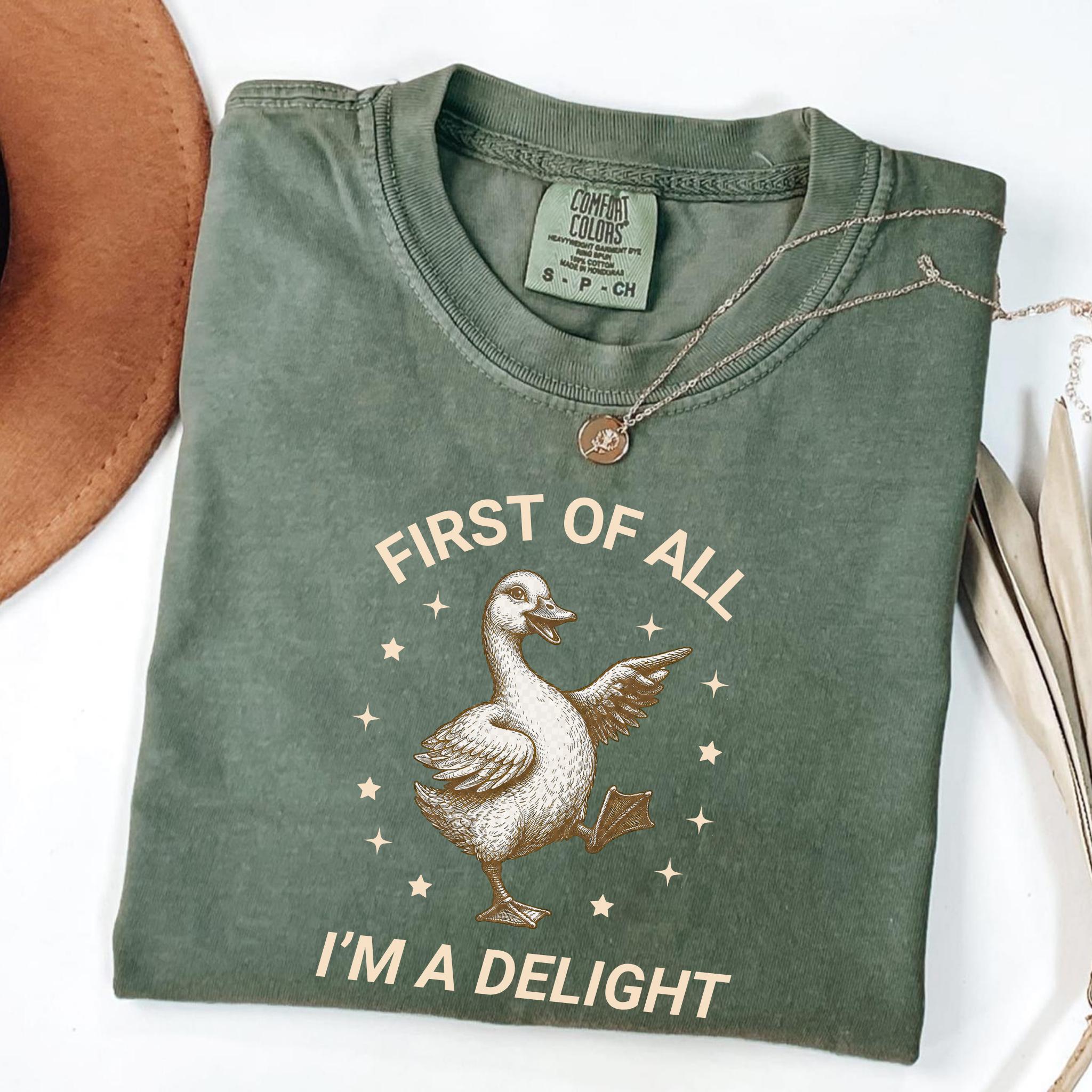 Show off your quirky side with this cozy tee featuring a charming goose and the witty phrase “First of All, I’m a Delight.” Crafted from soft cotton and printed with oversized typography for maximum impact, it’s a perfect reminder to celebrate yourself or gift to a friend who loves humor and self‑love.