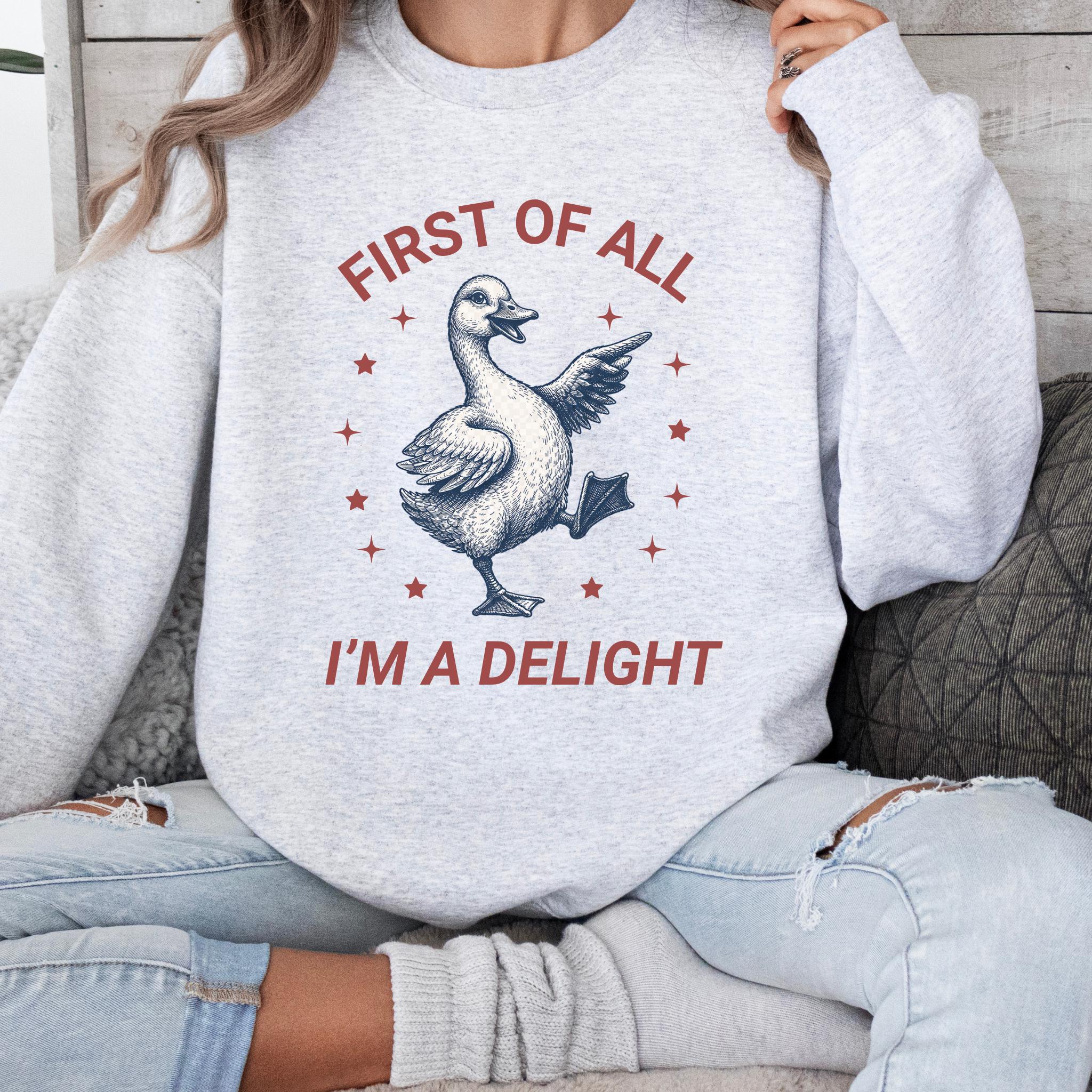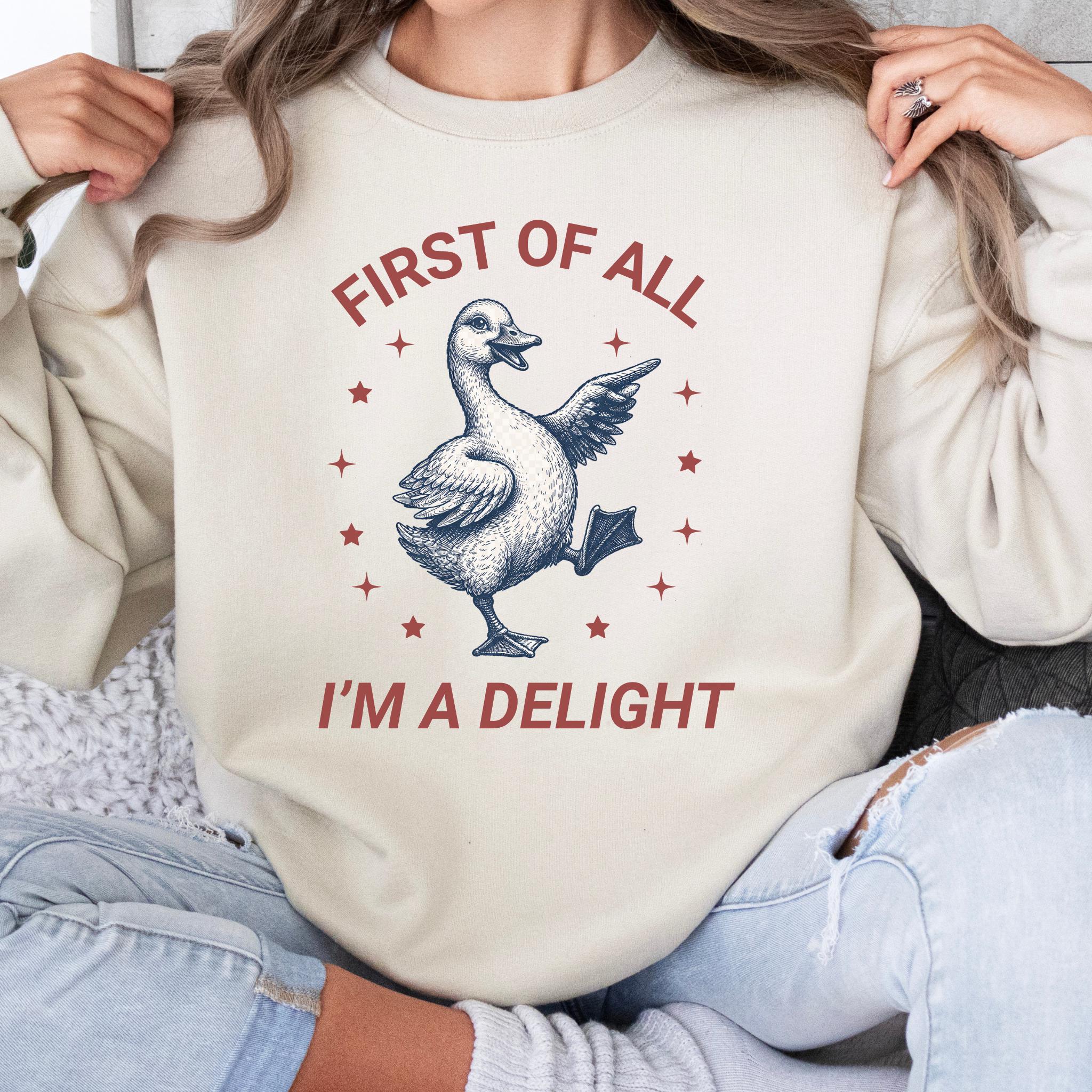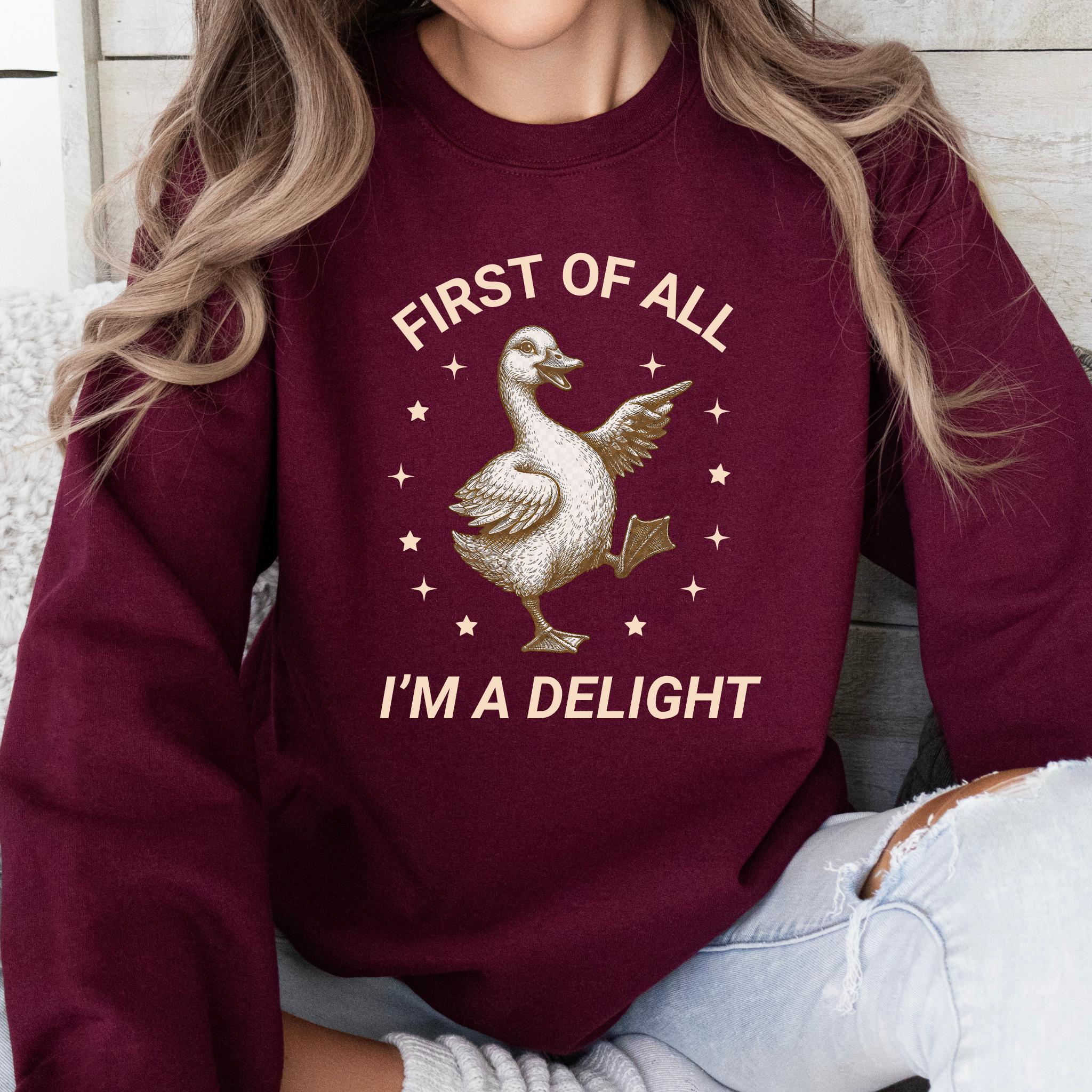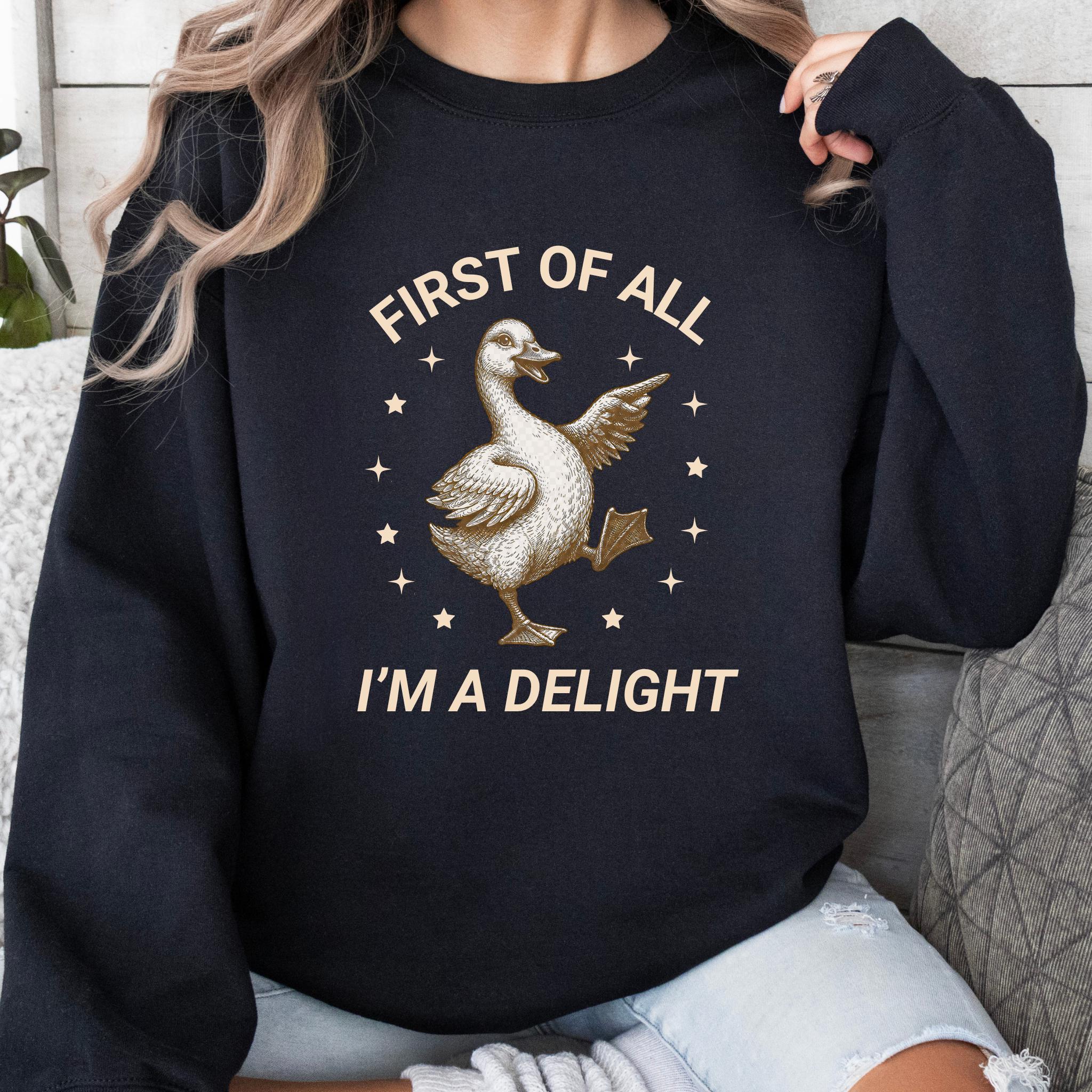 Show off your quirky side with this cozy tee featuring a charming goose and the witty phrase “First of All, I’m a Delight.” Crafted from soft cotton and printed with oversized typography for maximum impact, it’s a perfect reminder to celebrate yourself or gift to a friend who loves humor and self‑love.