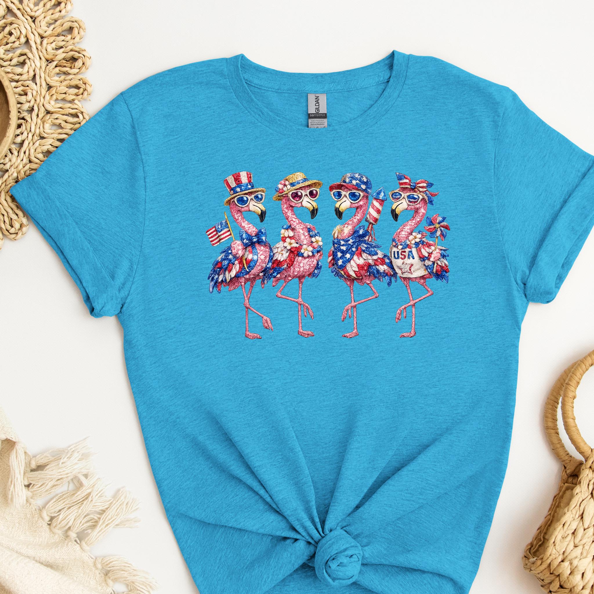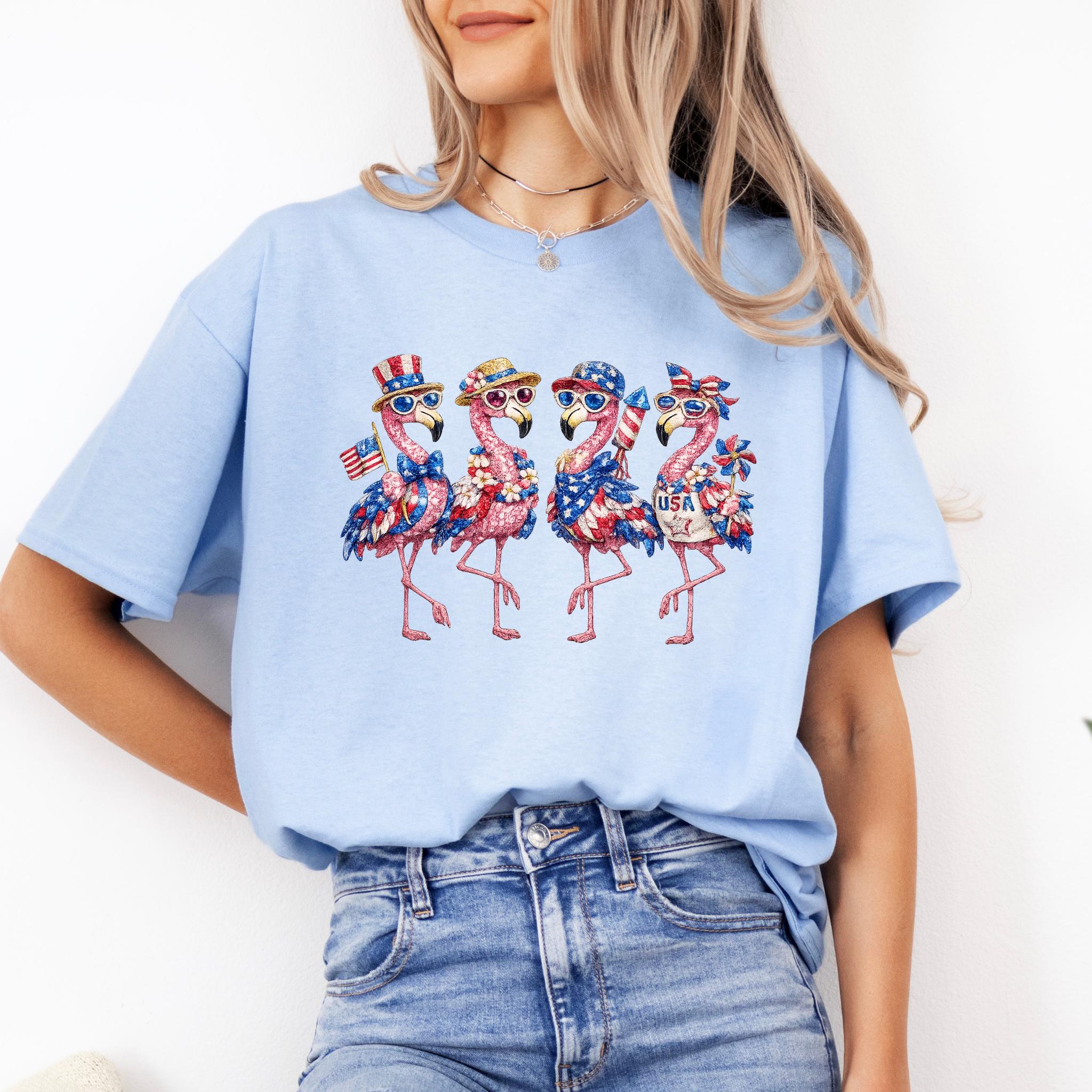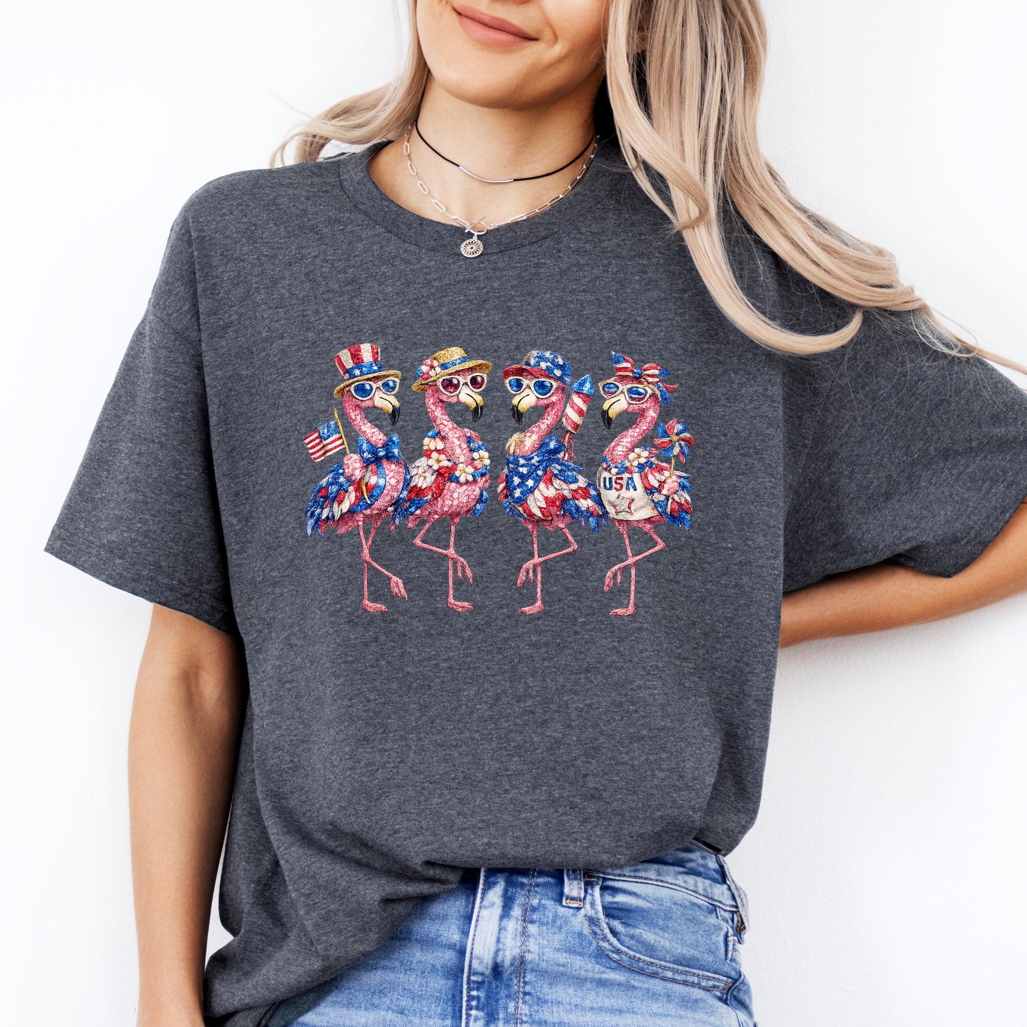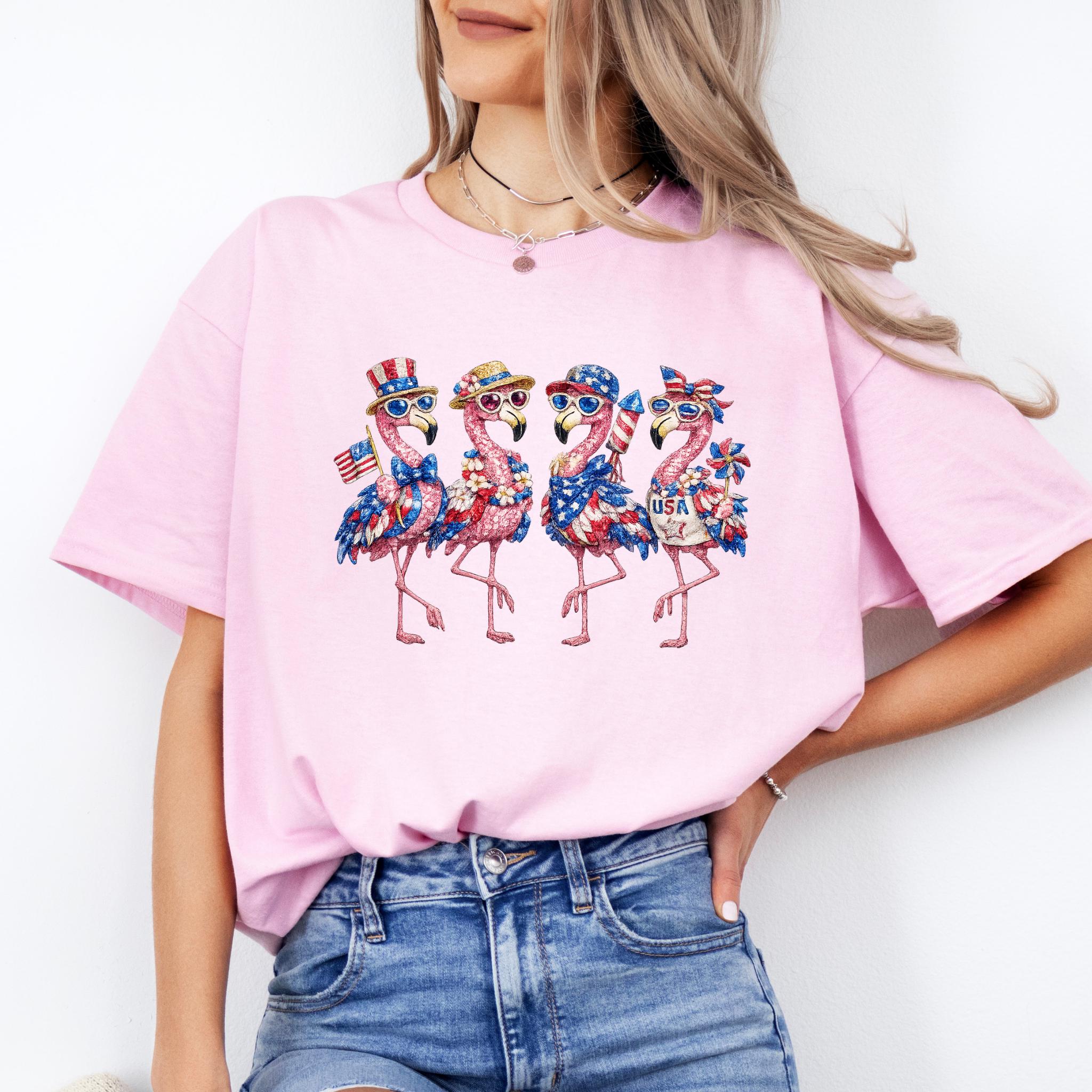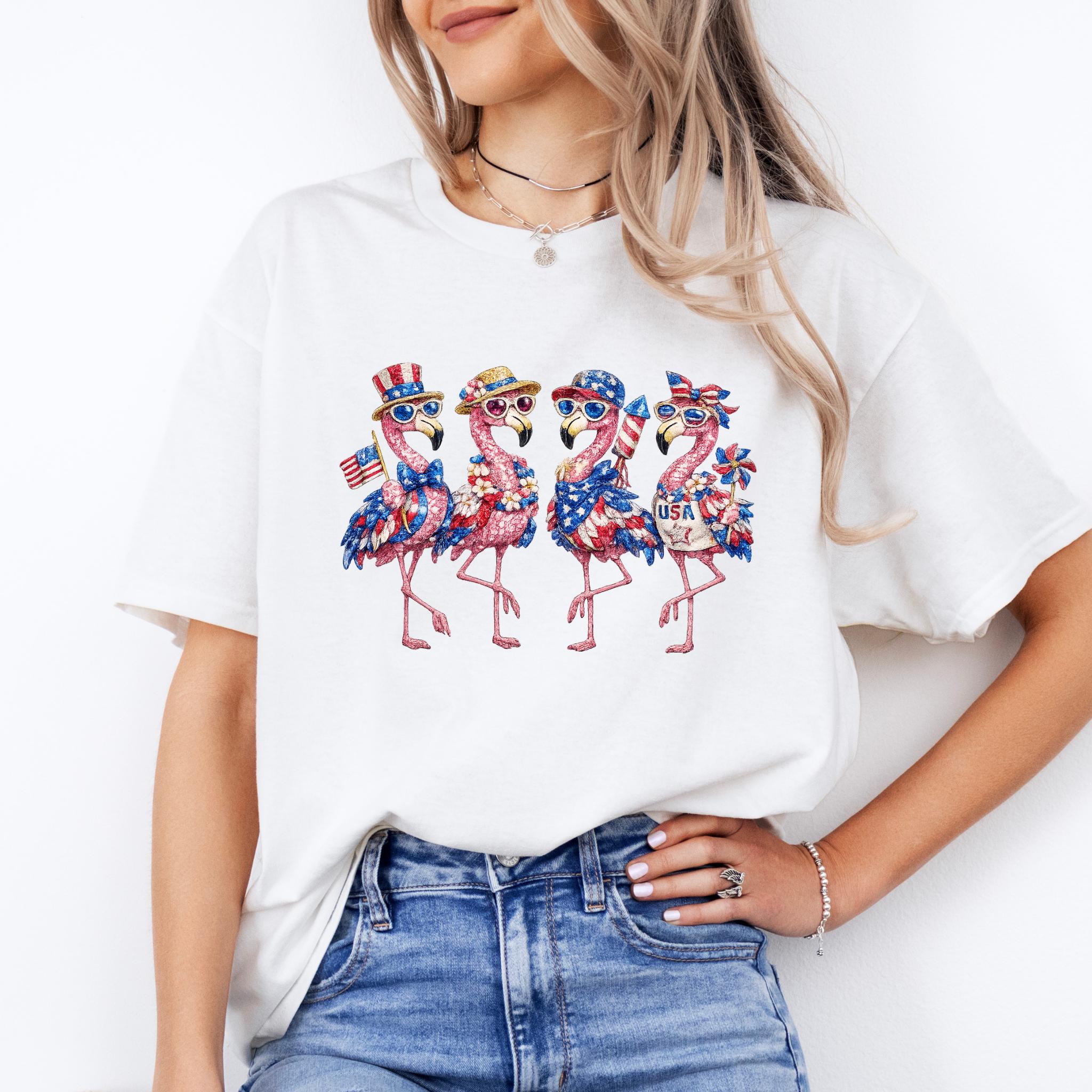 Its biggest strength is the way it combines whimsical flamingo charm with a bold patriotic theme, making it eye-catching, memorable, and easy to style for holiday events, parades, and summer gatherings. It is a standout choice for anyone who wants something more unique than a typical USA shirt. Printed using DTG (Direct to Garment) printing, this tee offers a soft feel with vibrant, lasting detail.