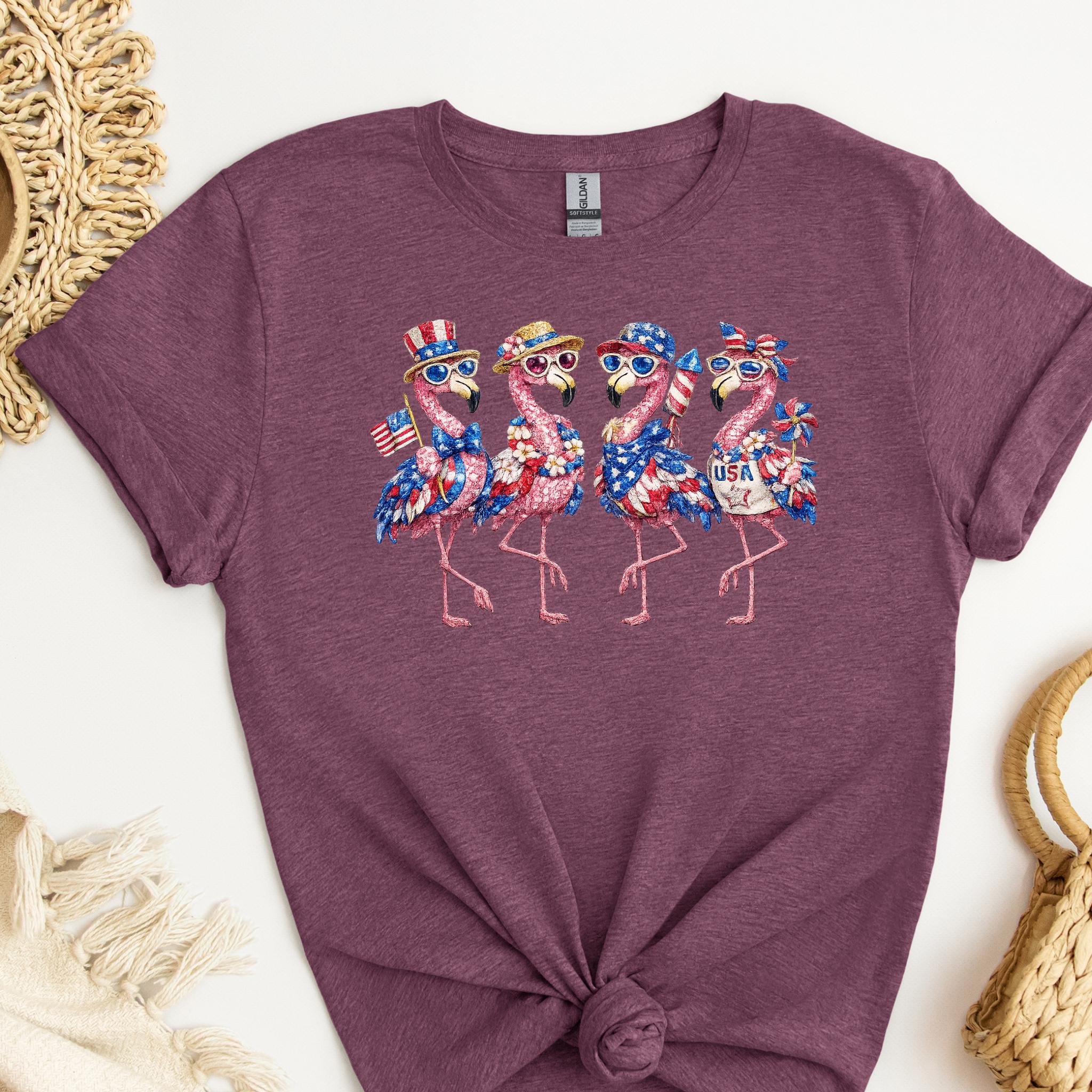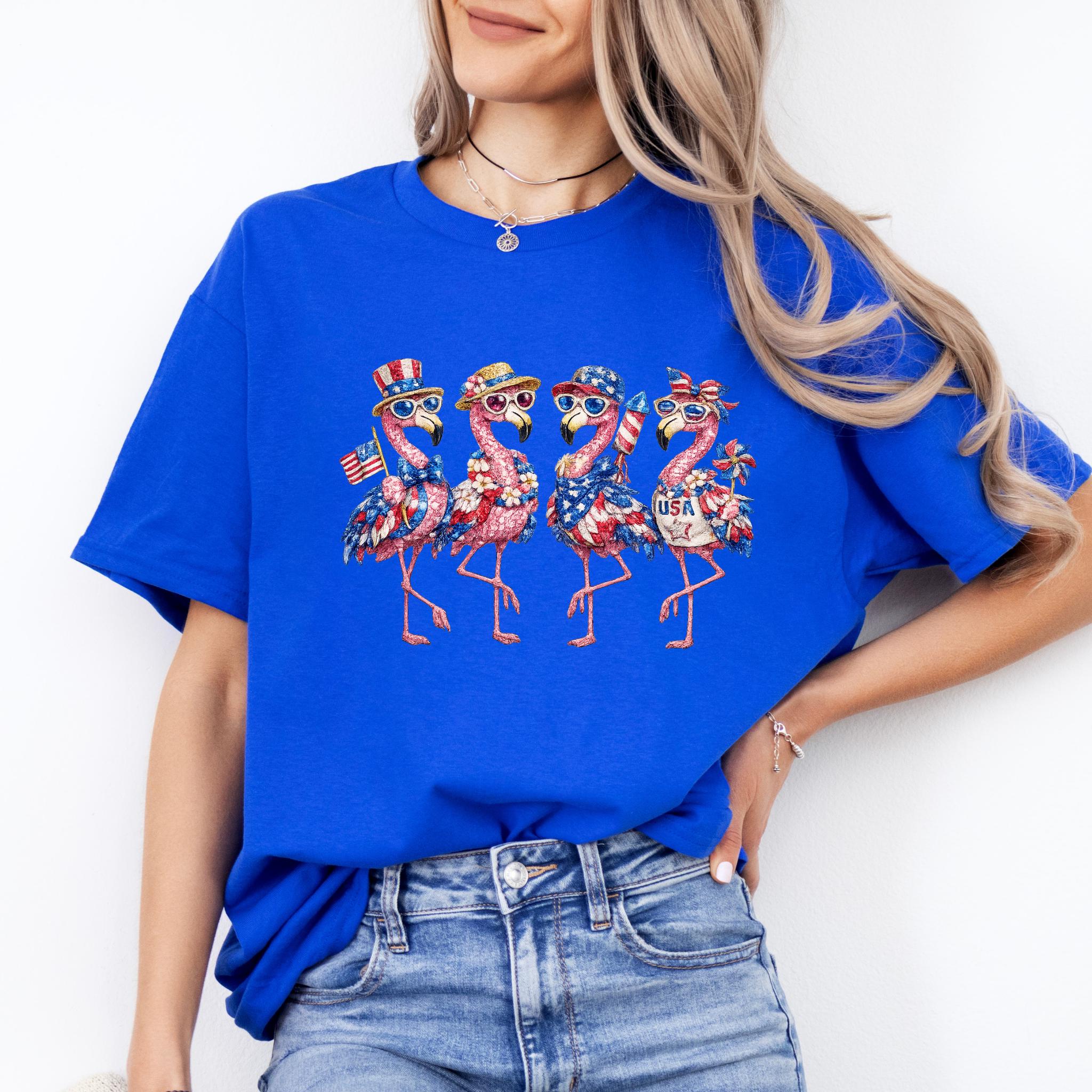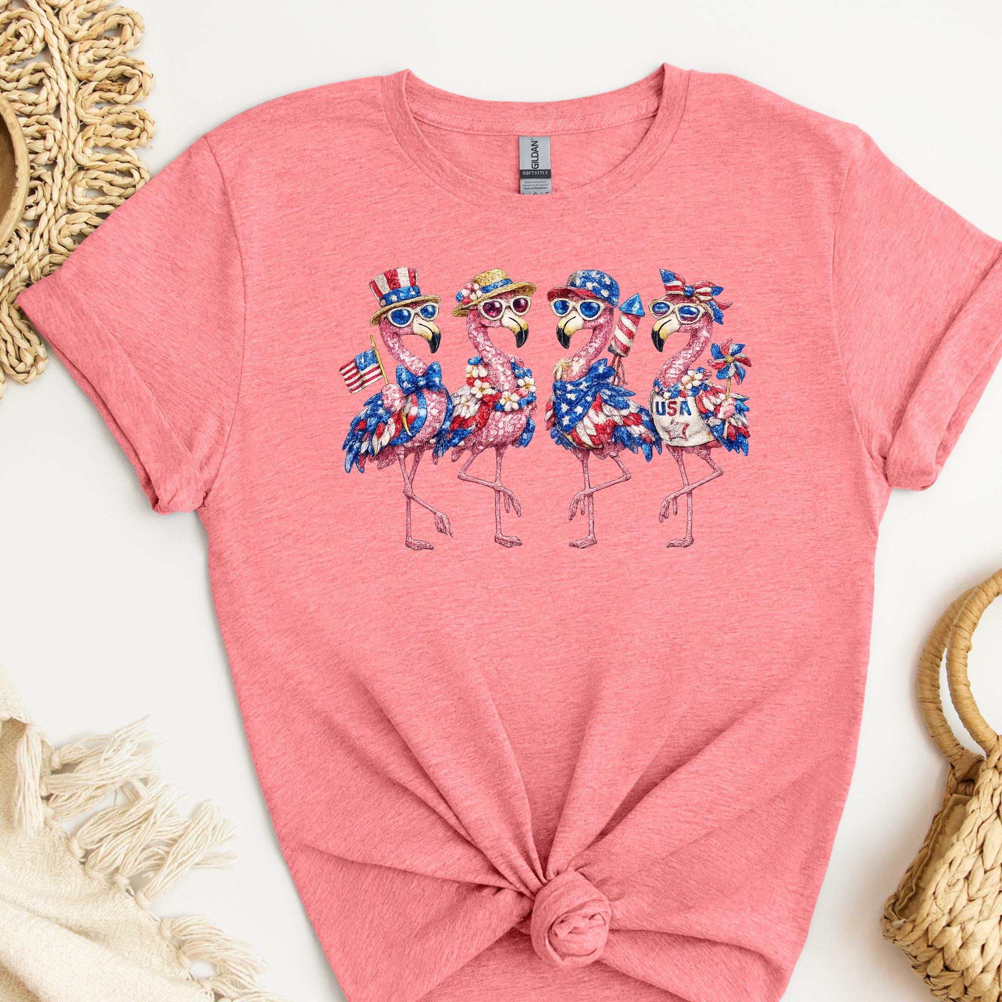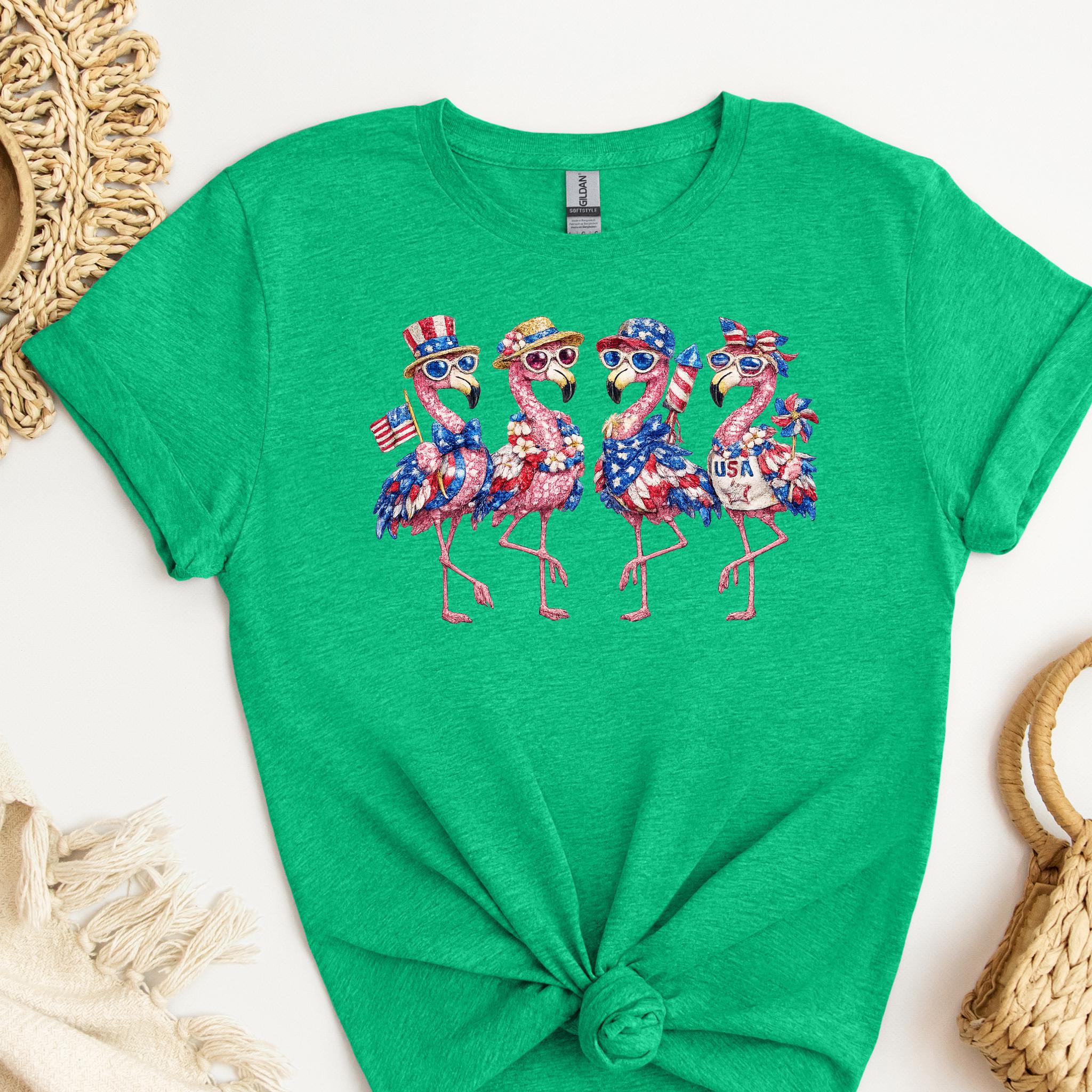 Its biggest strength is the way it combines whimsical flamingo charm with a bold patriotic theme, making it eye-catching, memorable, and easy to style for holiday events, parades, and summer gatherings. It is a standout choice for anyone who wants something more unique than a typical USA shirt. Printed using DTG (Direct to Garment) printing, this tee offers a soft feel with vibrant, lasting detail.