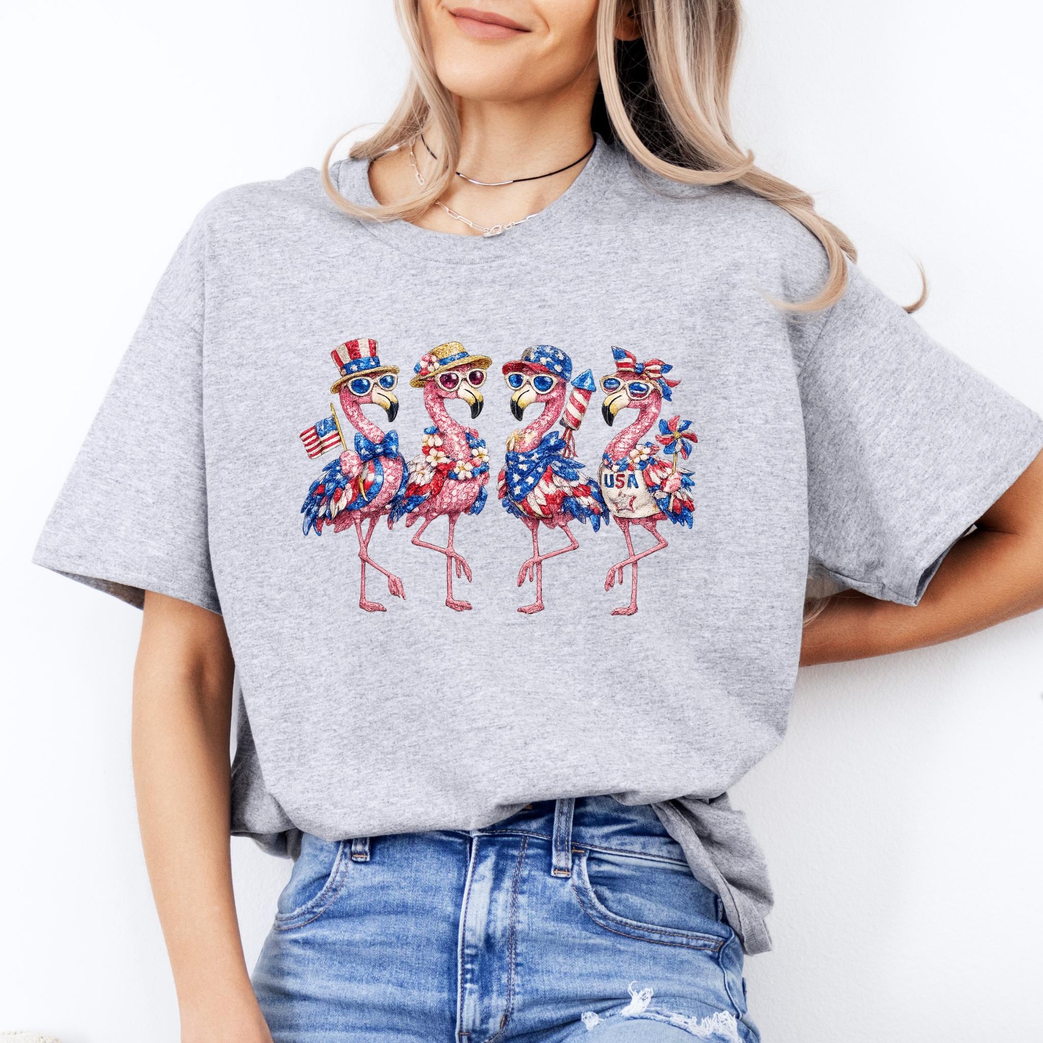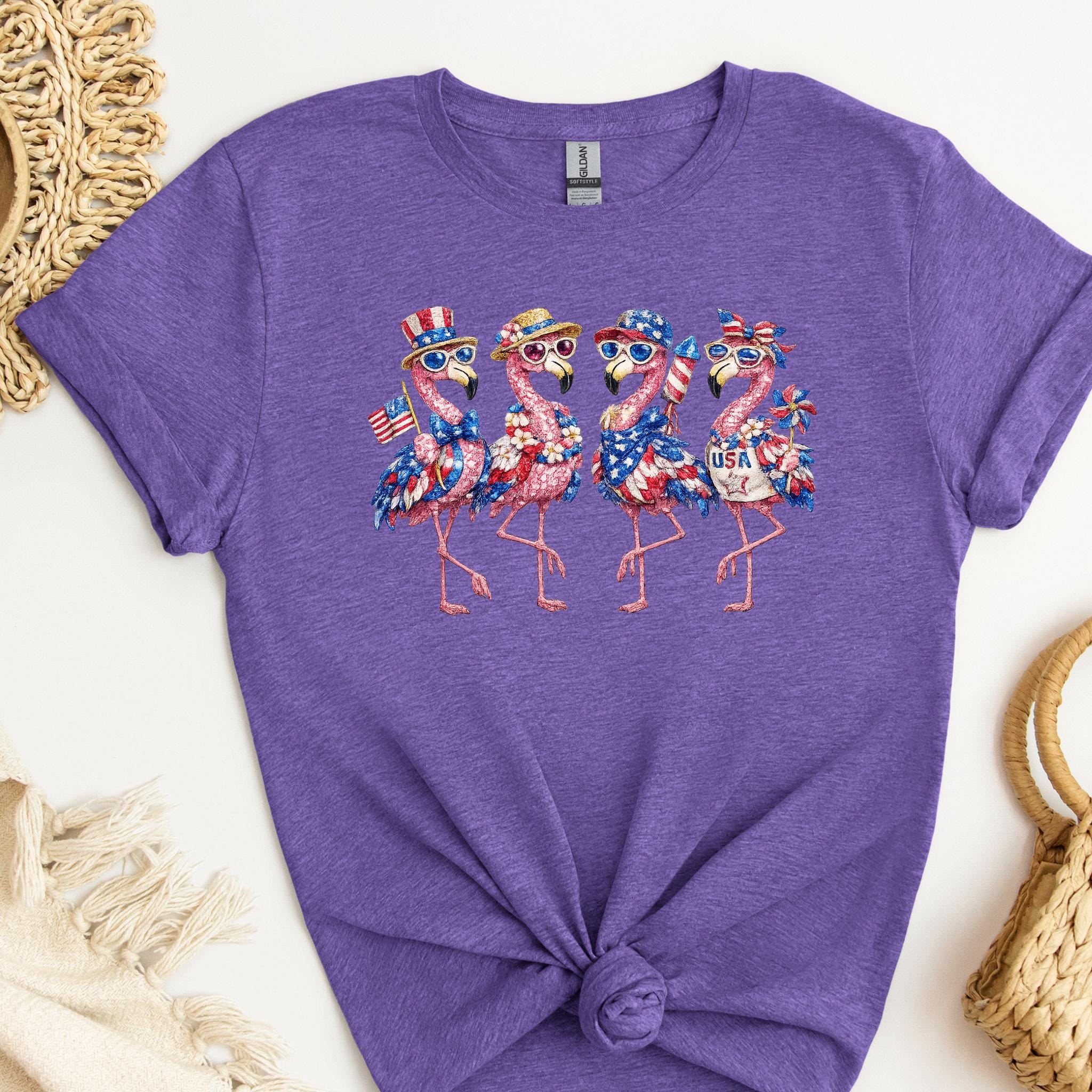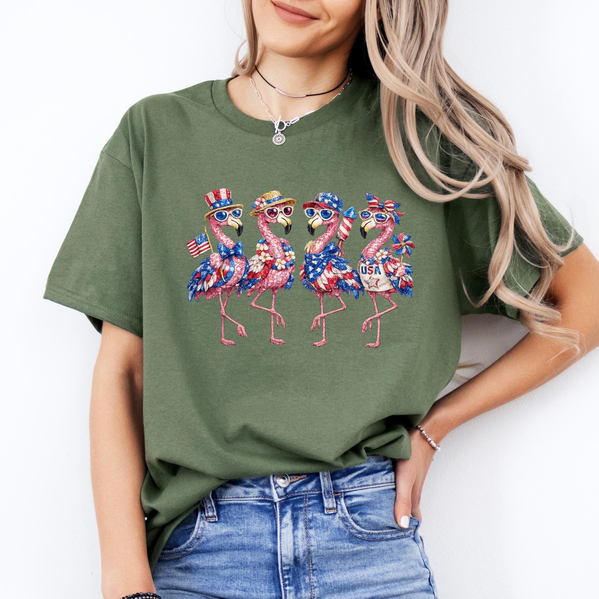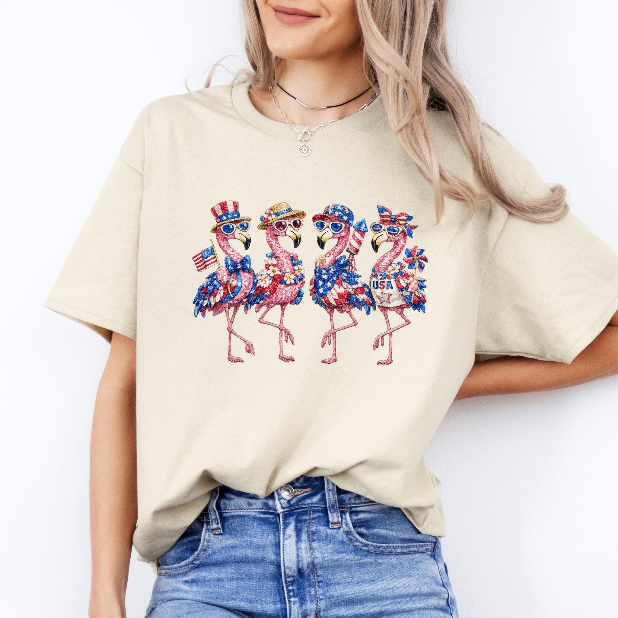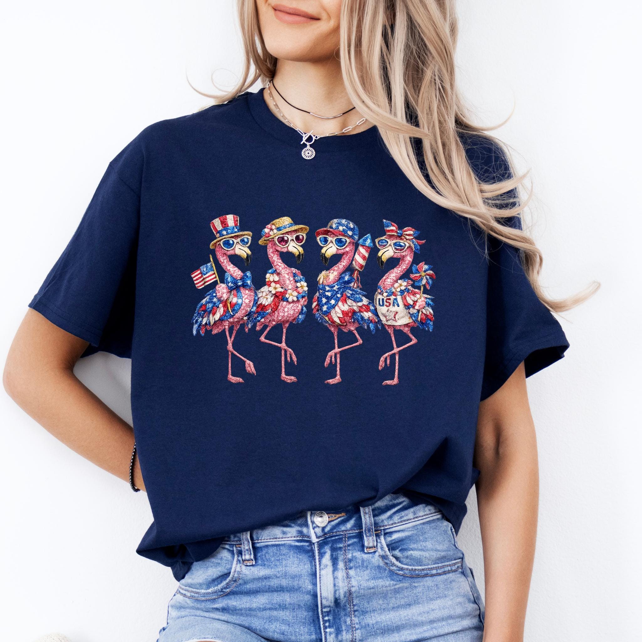 Its biggest strength is the way it combines whimsical flamingo charm with a bold patriotic theme, making it eye-catching, memorable, and easy to style for holiday events, parades, and summer gatherings. It is a standout choice for anyone who wants something more unique than a typical USA shirt. Printed using DTG (Direct to Garment) printing, this tee offers a soft feel with vibrant, lasting detail.