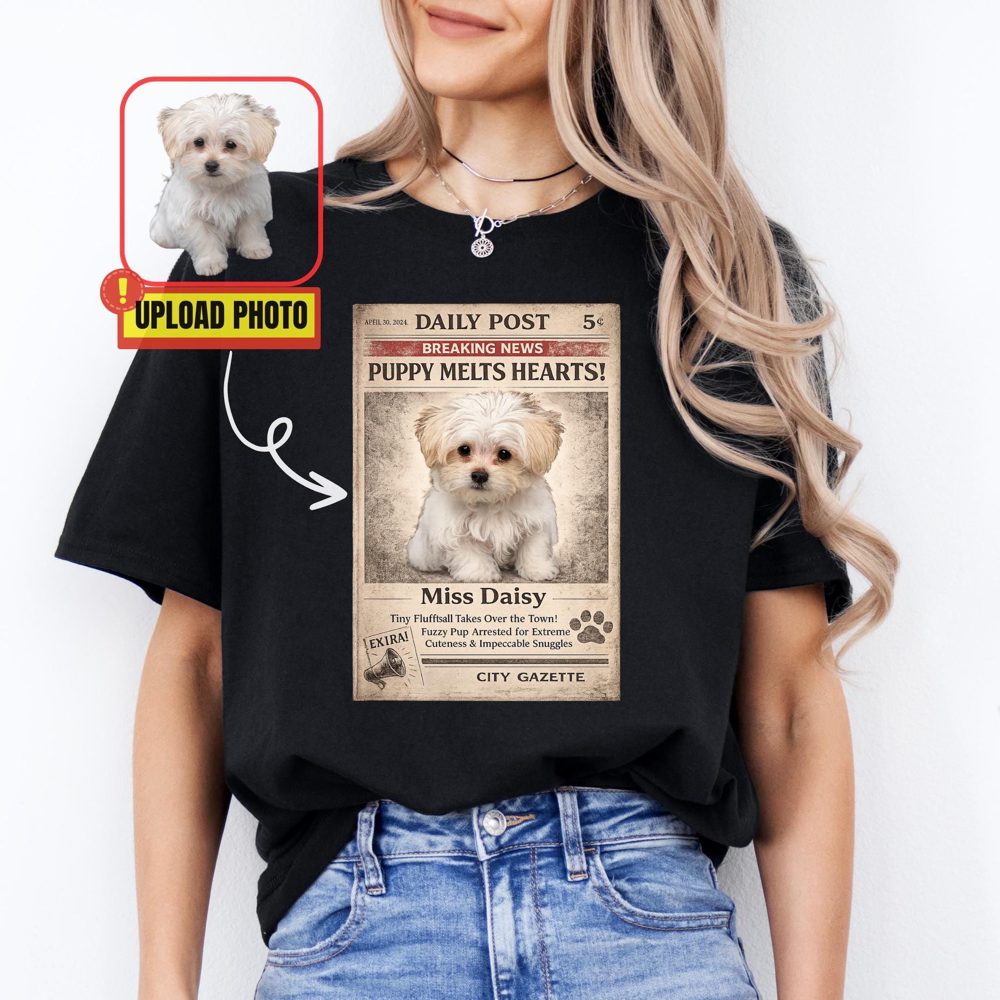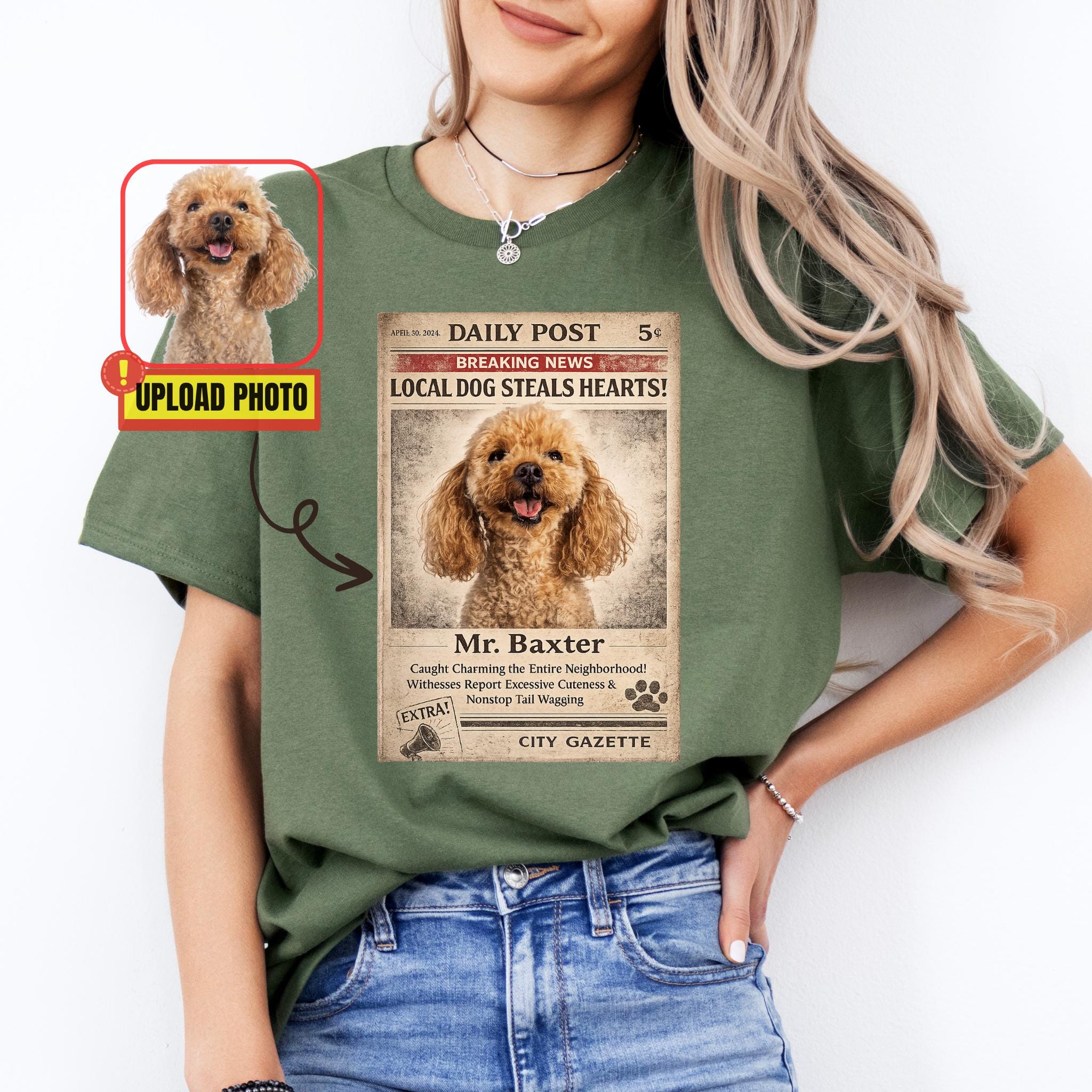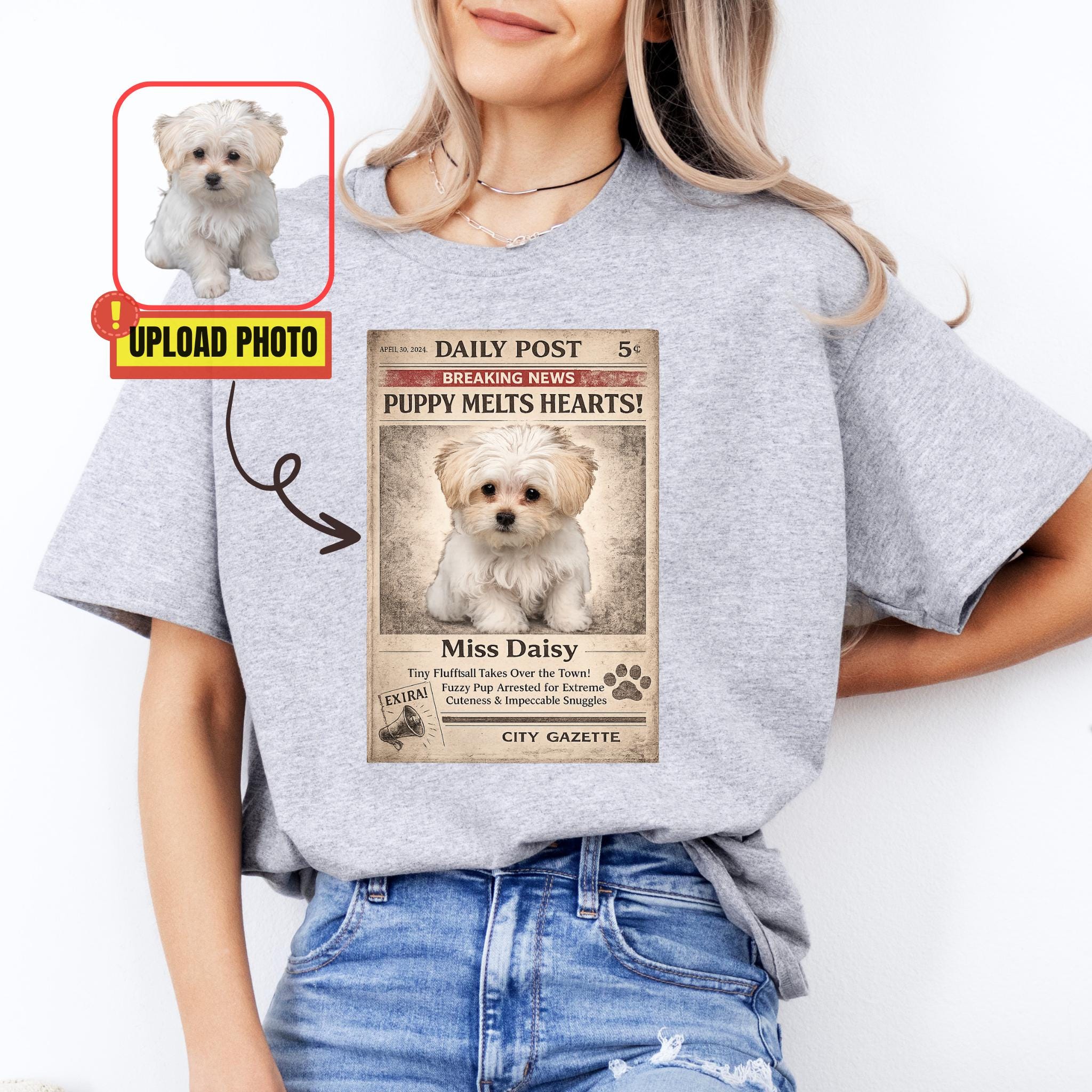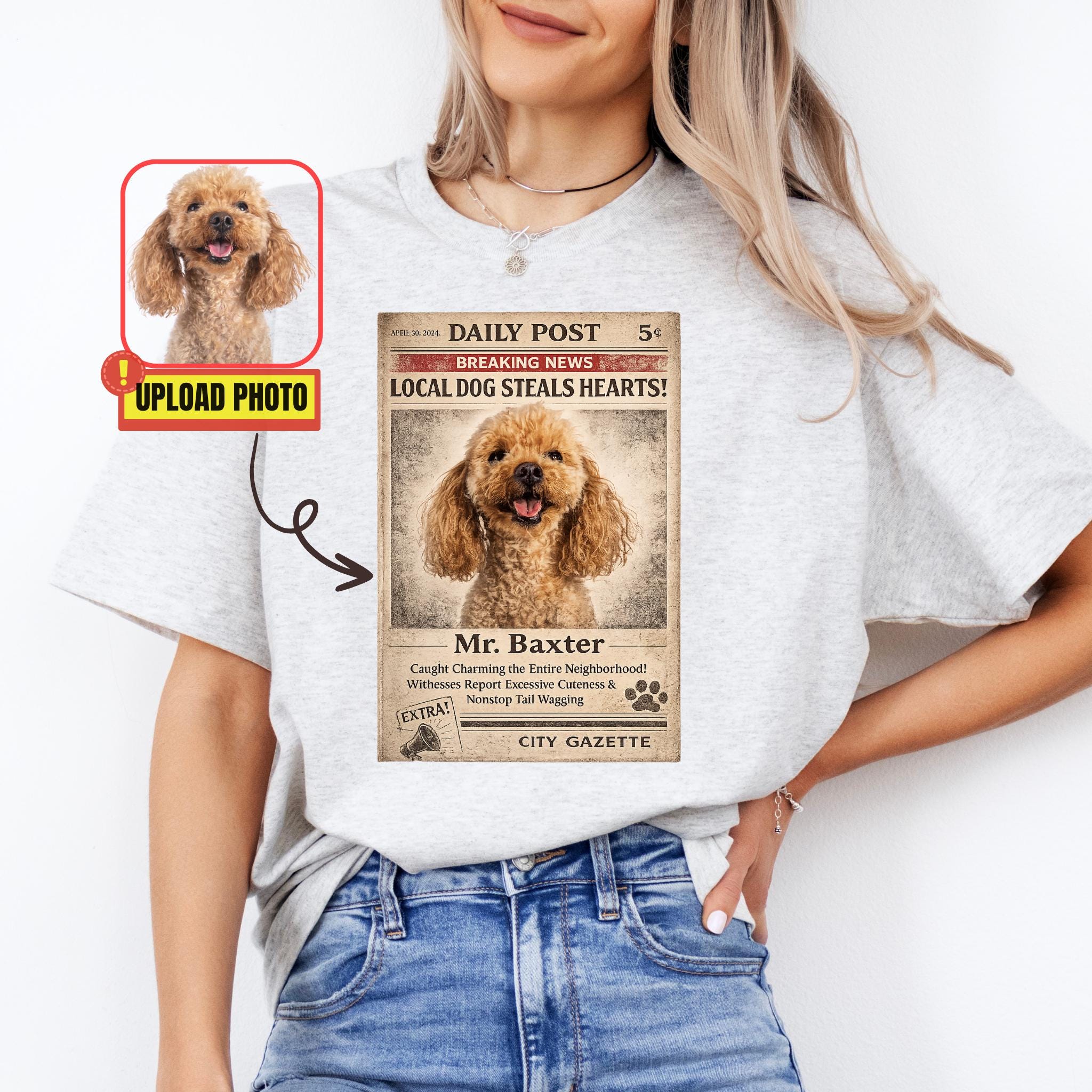Turn your favorite furry face into a heart-melting keepsake with this playful Custom Dog Photo Shirt. Designed like a vintage newspaper front page, this tee captures the joy, personality, and nonstop charm that makes your dog impossible not to love.